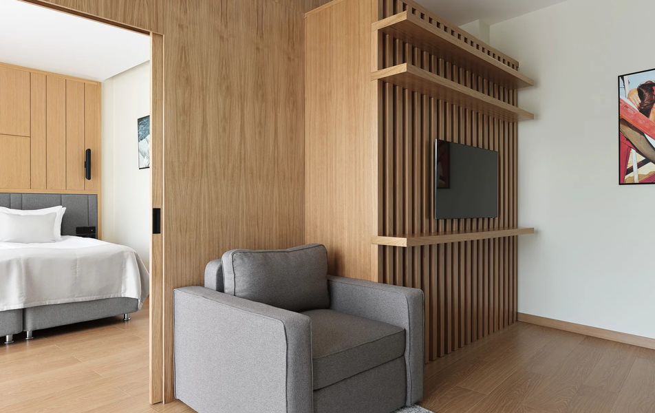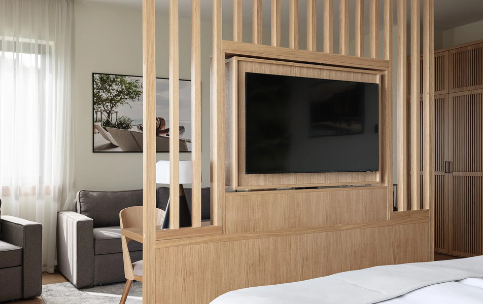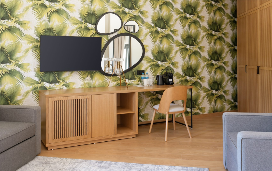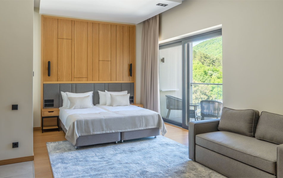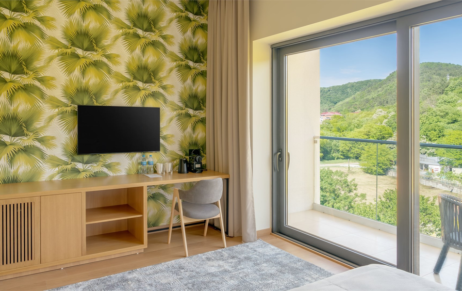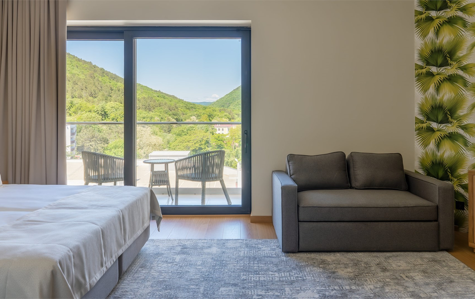 Полулюкс 4-местный Количество комнат: 1-комнатный Тип номера: Полулюкс Дополнительное место: диван Вид из номера: на горы Кол-во доп. мест: 1 Кол-во основных мест: 2 Площадь (кв. м): 32 Мебель: вешалка, диван, зеркало, кровати односпальные /одна двуспальная кровать, прикроватные тумбочки, стол, стул, шкаф Оборудование: мини-холодильник, сейф, система общего кондиционирования, телевизор, чайная станция Санузел: с душем, тапочки, туалетные принадлежности, фен, халат Сервис: Wi-Fi бесплатно, смена полотенец, смена постельного белья, уборка номера