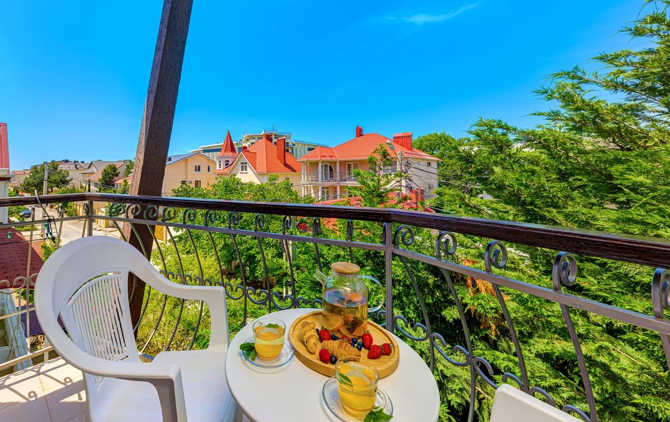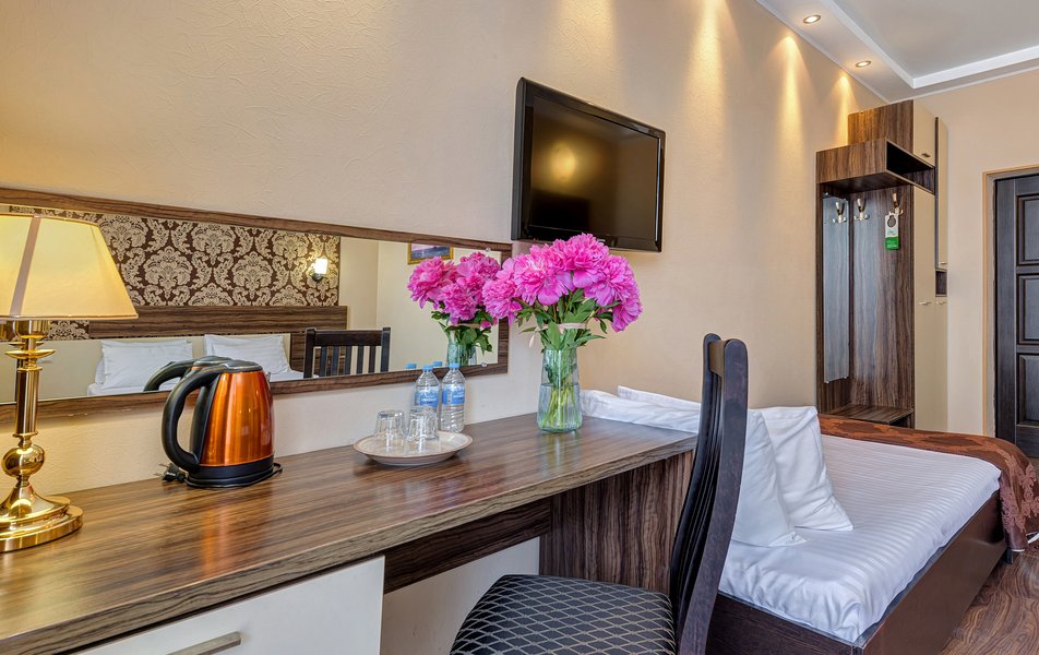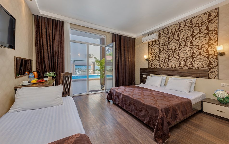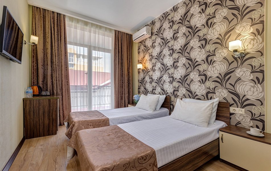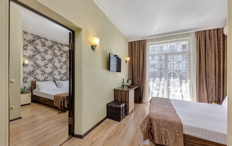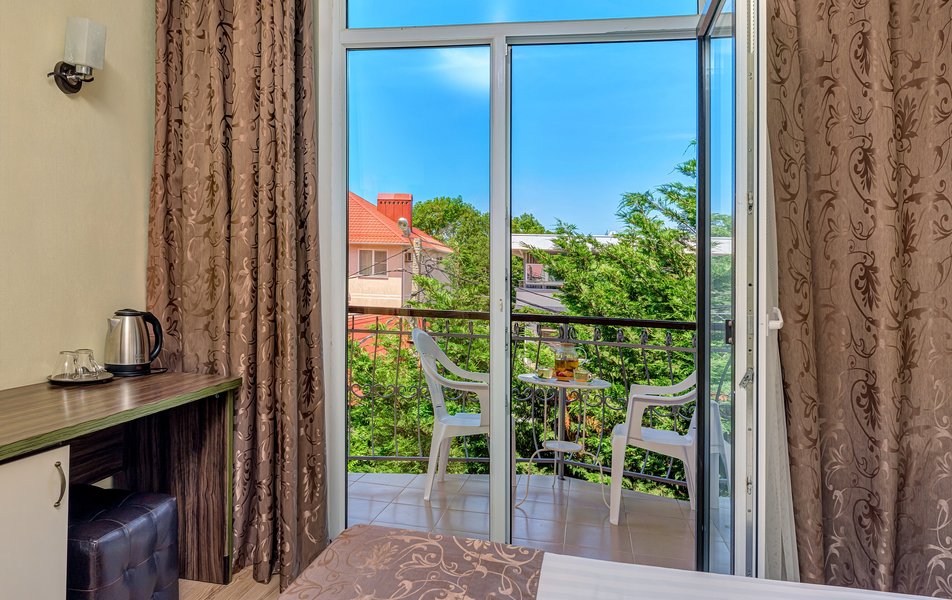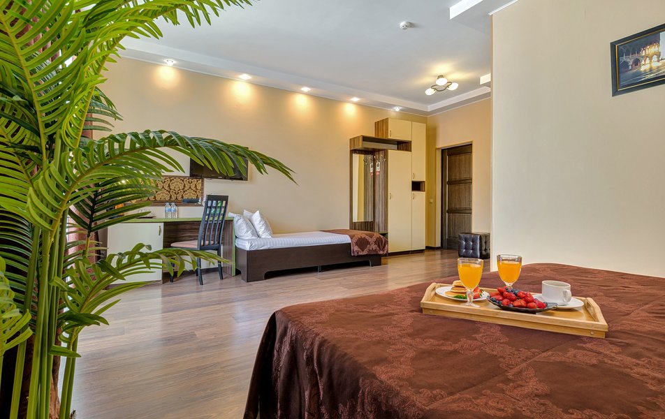 Полулюкс 3-местный Количество комнат: 1-комнатный Тип номера: Полулюкс Дополнительное место: еврораскладушка Кол-во доп. мест: 1 Кол-во основных мест: 3 Площадь (кв. м): 26 Балкон: с мебелью Мебель: вешалка, зеркало, кровать двуспальная: 160х200 см, кровать односпальная, прикроватные тумбочки, стол, стулья, шкаф Оборудование: мини-холодильник, набор посуды, сплит-система, телевизор ЖК, телефон Санузел: с душем, туалетные принадлежности Сервис: Wi-Fi бесплатно, room-сервис, смена полотенец, смена постельного белья, уборка номера