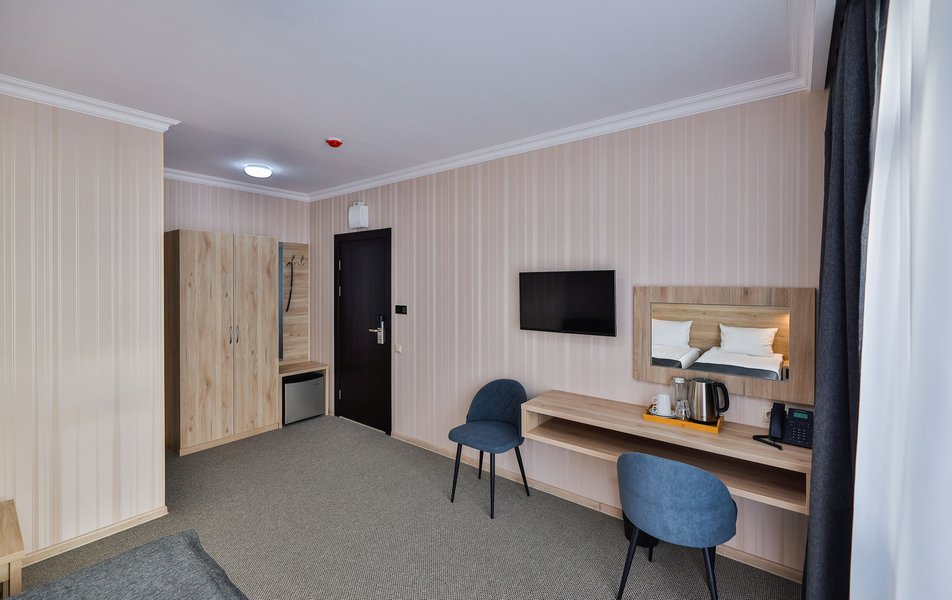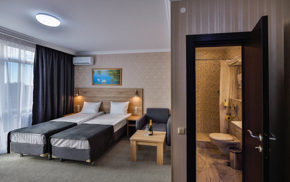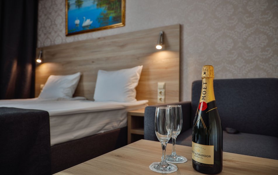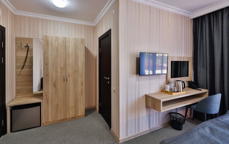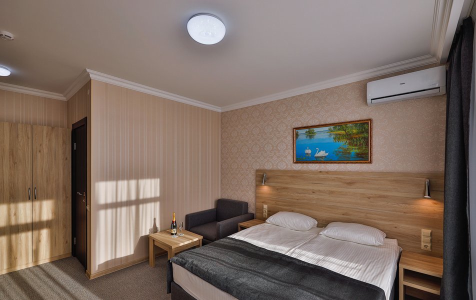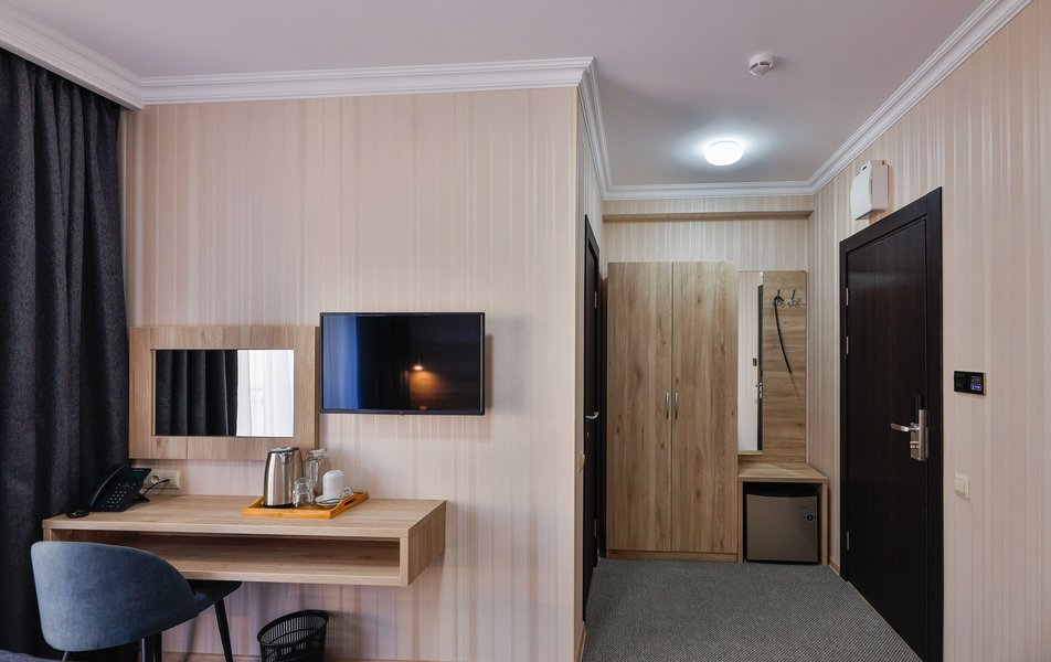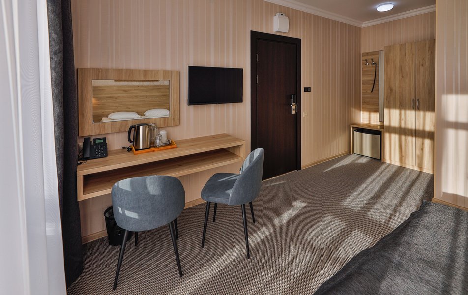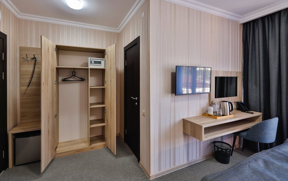 Отель расположен на центральной улице города, понравился хороший новый ремонт, парковка чисто и уютно. Персонал приветливый подсказали какие места можно посетить зимой. В номере есть всё необходимое чайник посуда фен сейф сенузел с душем вход в номер по карточке. Брали в аренду баню за 2000 рублей два часа плюс веник 300 р Банька супер!