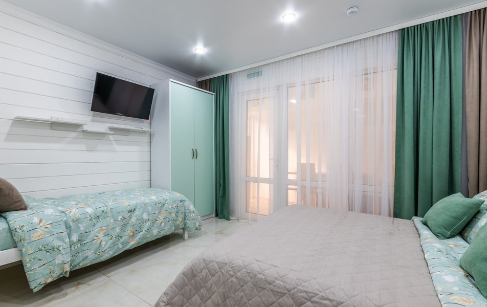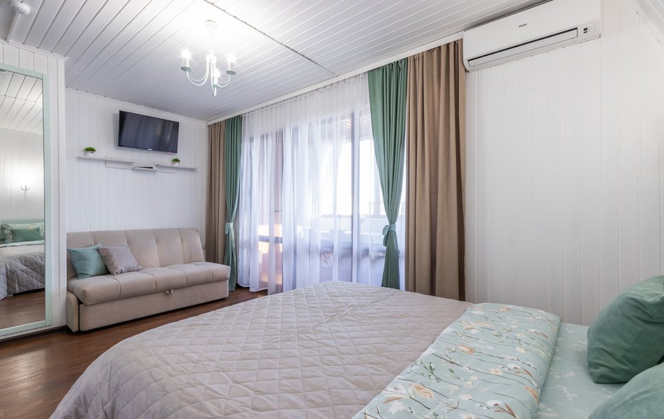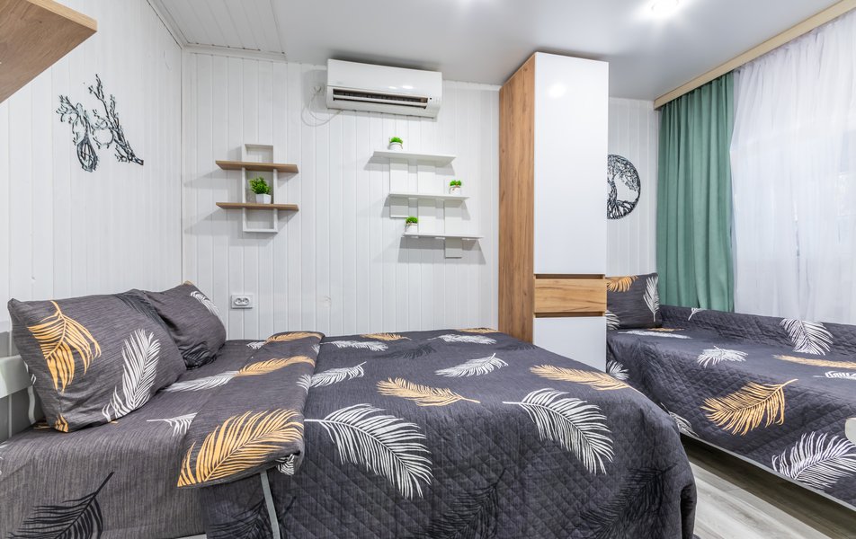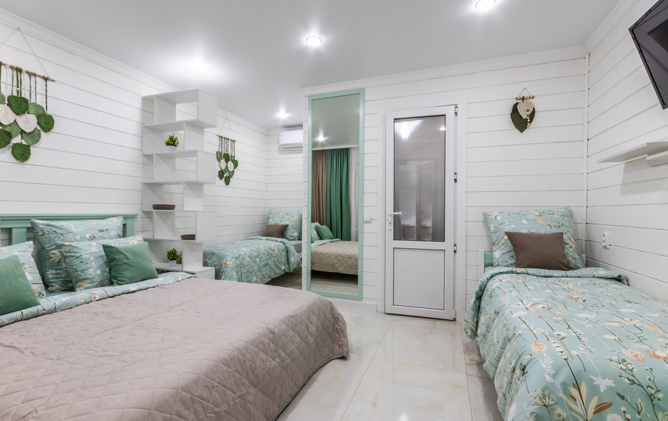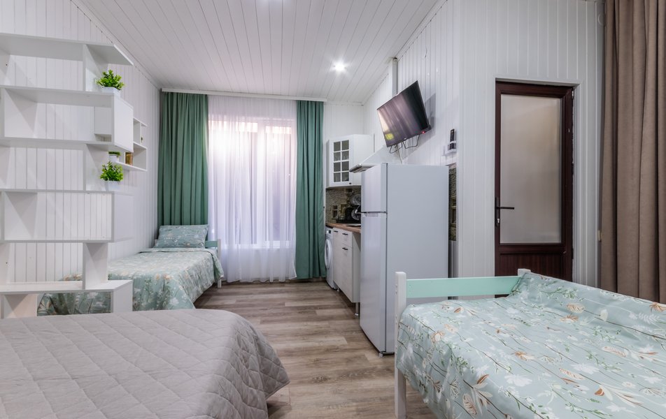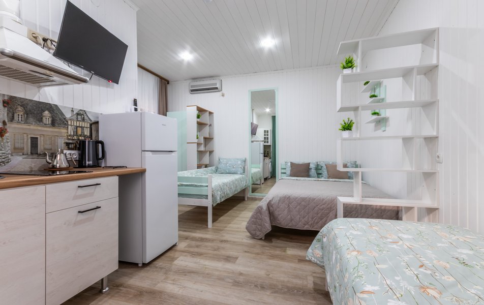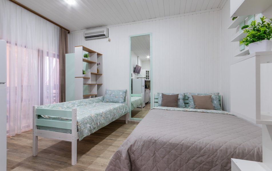 Апартаменты 5-местный Количество комнат: 1-комнатный Тип номера: Апартаменты Кол-во основных мест: 5 Площадь (кв. м): 40 Мебель: зеркало, кровати односпальные: 3, кровать двуспальная, прикроватные тумбочки, пуфик, стол, стулья, шкаф Оборудование: кондиционер, микроволновая печь, набор посуды, плита индукционная, стиральная машина, телевизор, холодильник, электрочайник Санузел: с душем, тапочки, туалетные принадлежности, фен, халат Сервис: Wi-Fi бесплатно, смена полотенец: 1 раз в 3 дня, смена постельного белья: 1 раз в 5 дней, уборка номера: 1 раз в 3 дня