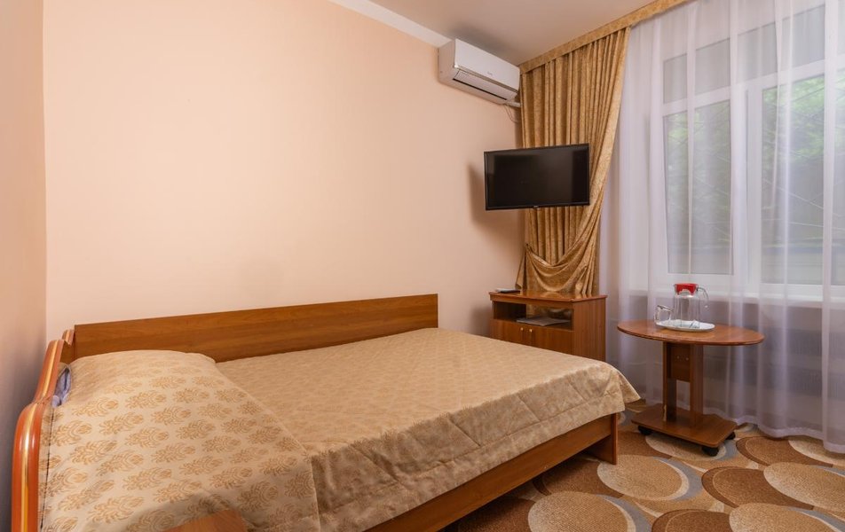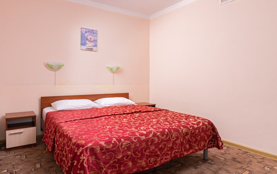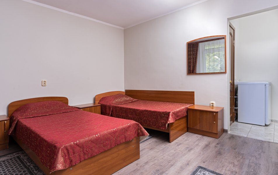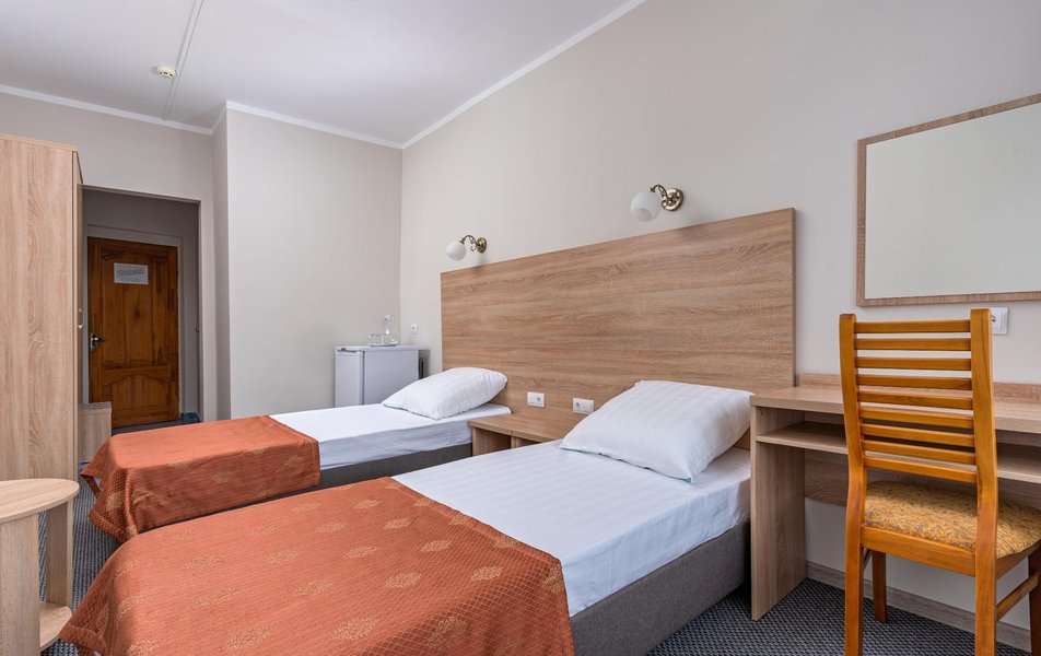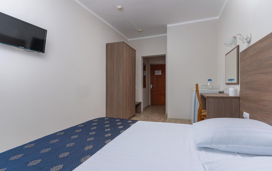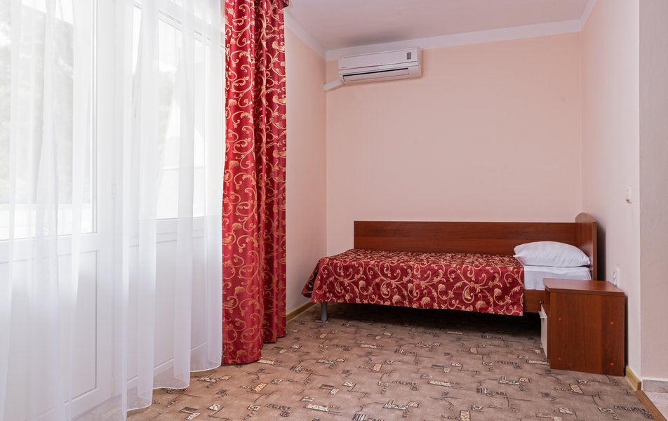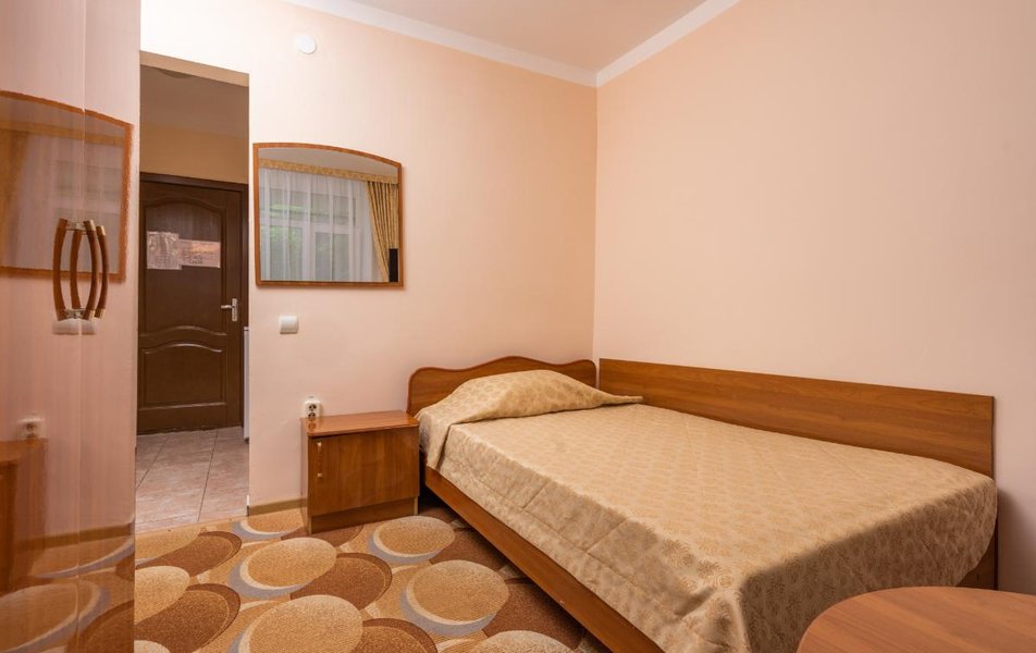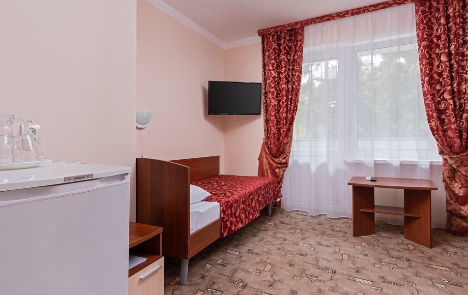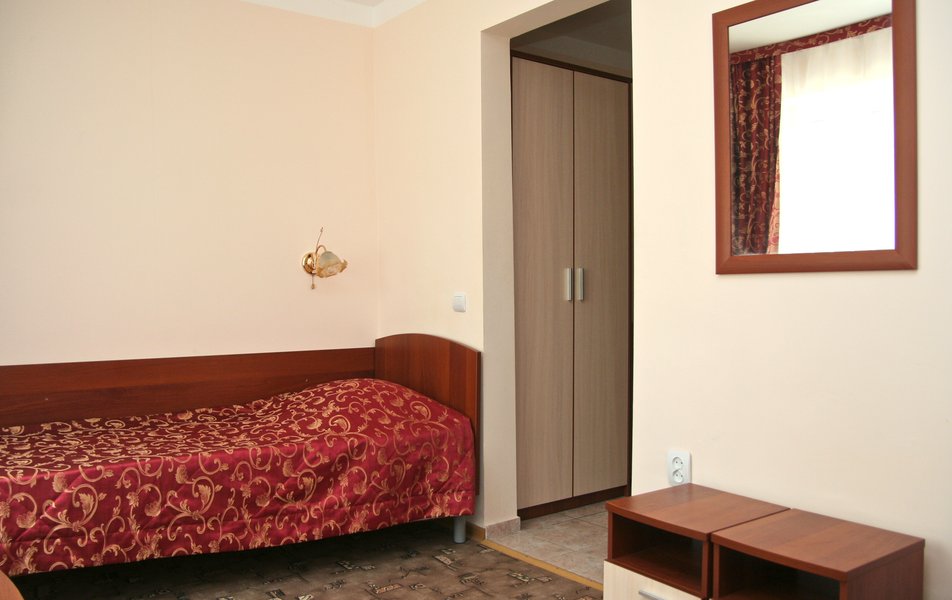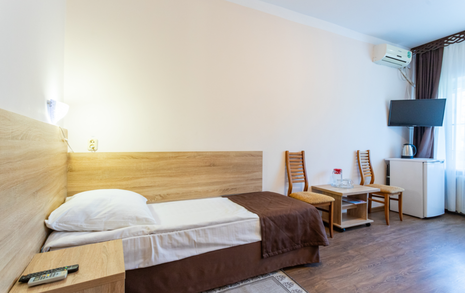 Стандартный 1-местный 1-комнатный (корпус № 4) Количество комнат: 1-комнатный Тип номера: Стандартный Кол-во основных мест: 1 Корпус: № 4 Площадь (кв. м): 9 Мебель: вешалка, зеркало, кровать односпальная, прикроватная тумбочка, стол, стулья, шкаф Оборудование: кондиционер, сейф, телевизор, холодильник, чайный набор посуды Санузел: с ванной, туалетные принадлежности Сервис: смена полотенец, смена постельного белья, уборка номера