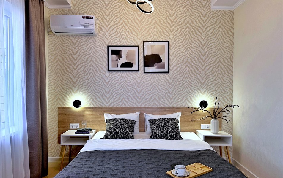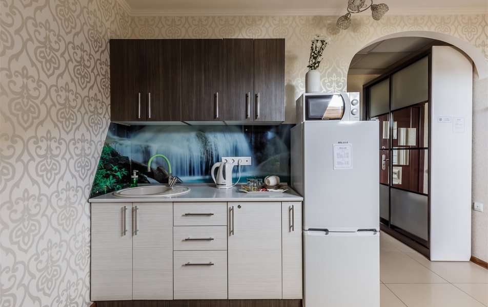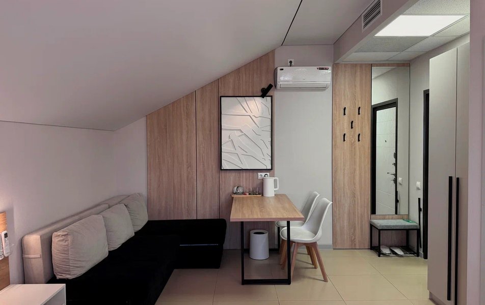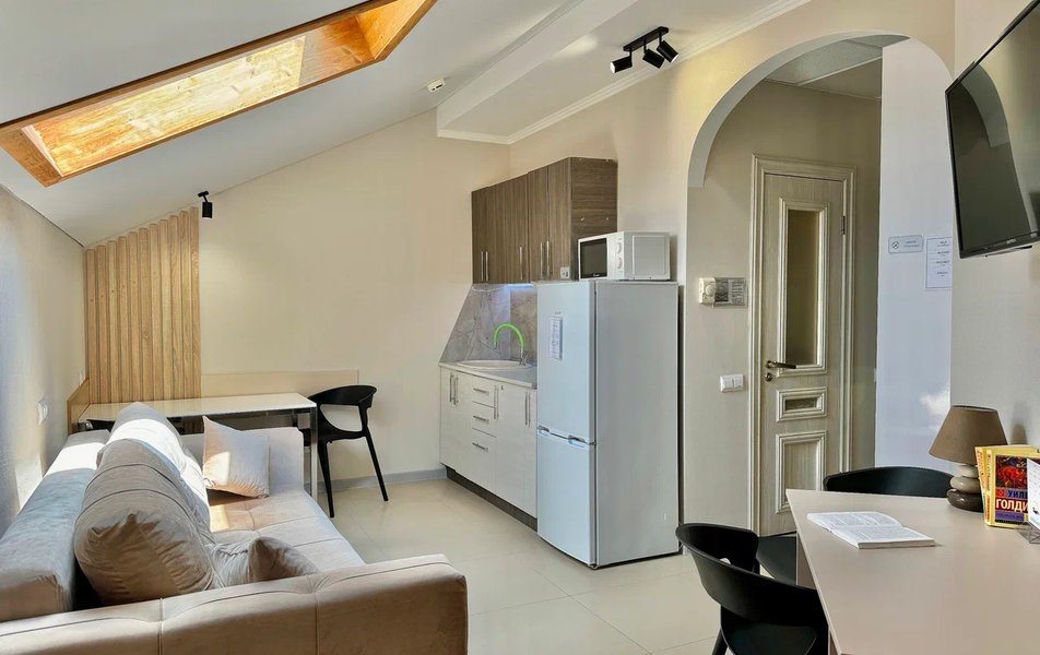 Апартаменты 5-местный 2-комнатный (с кухней) Количество комнат: 2-комнатный Тип номера: Апартаменты Дополнительное место: диван-кровать Кол-во доп. мест: 3 Кол-во основных мест: 2 Площадь (кв. м): 35 Мебель: вешалка, диван, зеркало, кровати односпальные /одна двуспальная кровать, кровать односпальная, прикроватные тумбочки, стол, стулья, шкаф Оборудование: микроволновая печь, набор посуды, сейф, сплит-система, телевизор, холодильник, электрочайник Санузел: с ванной, тапочки, туалетные принадлежности, фен, халат Сервис: Wi-Fi бесплатно, смена полотенец, смена постельного белья, уборка номера