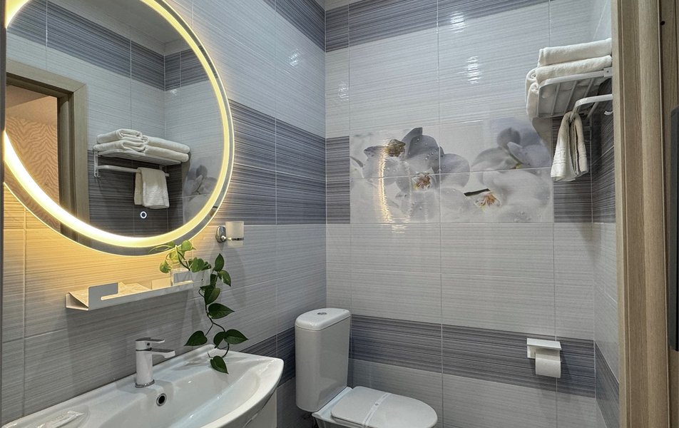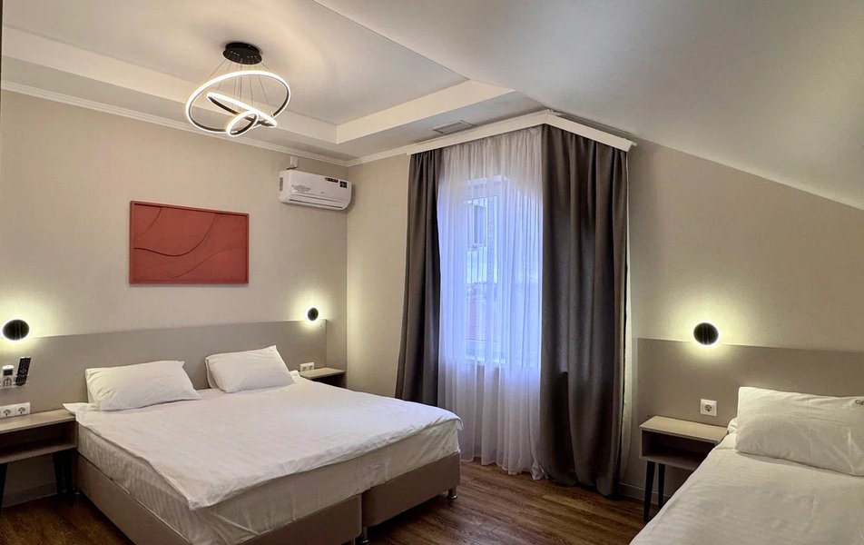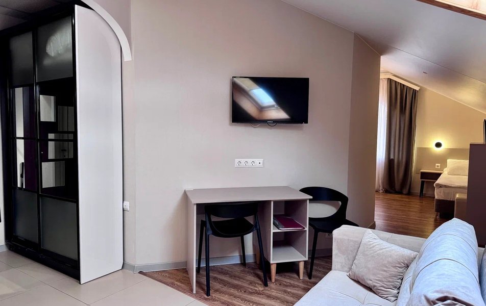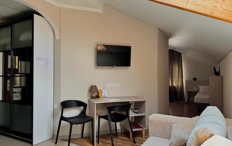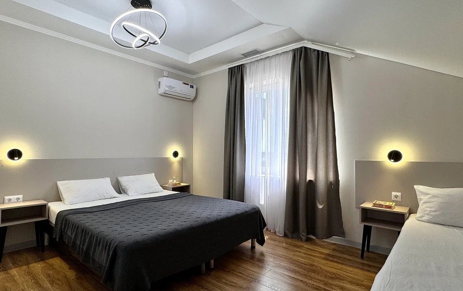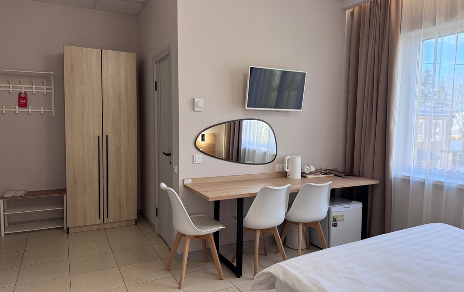 Комфорт плюс 2-местный Количество комнат: 1-комнатный Тип номера: Бизнес Кол-во доп. мест: 1 Кол-во основных мест: 2 Мебель: вешалка, зеркало, кровать двуспальная, кровать односпальная, прикроватные тумбочки, стол, стулья, шкаф Оборудование: сплит-система, телевизор, холодильник, электрочайник Санузел: с душем, тапочки, туалетные принадлежности, фен, халат Сервис: Wi-Fi бесплатно, смена полотенец, смена постельного белья, уборка номера