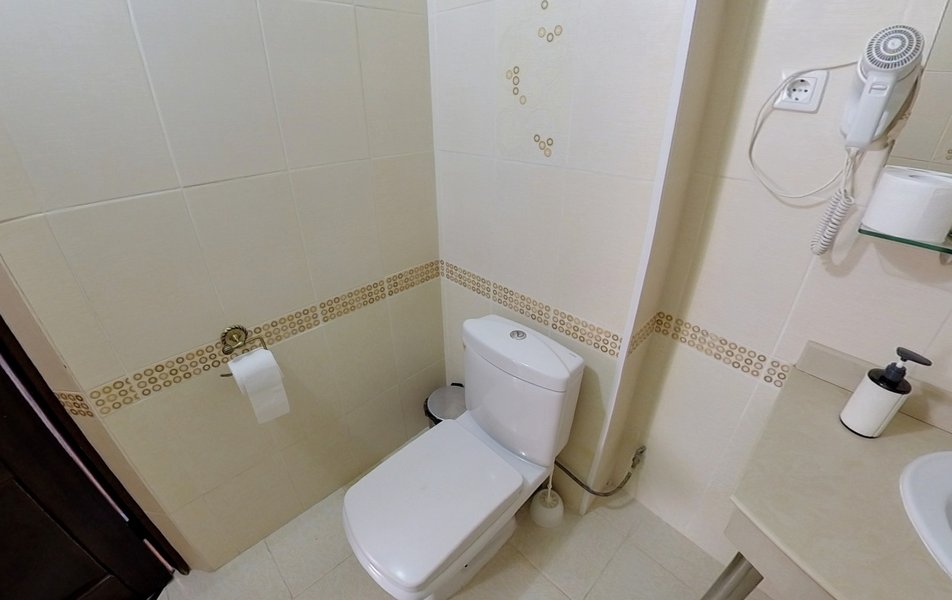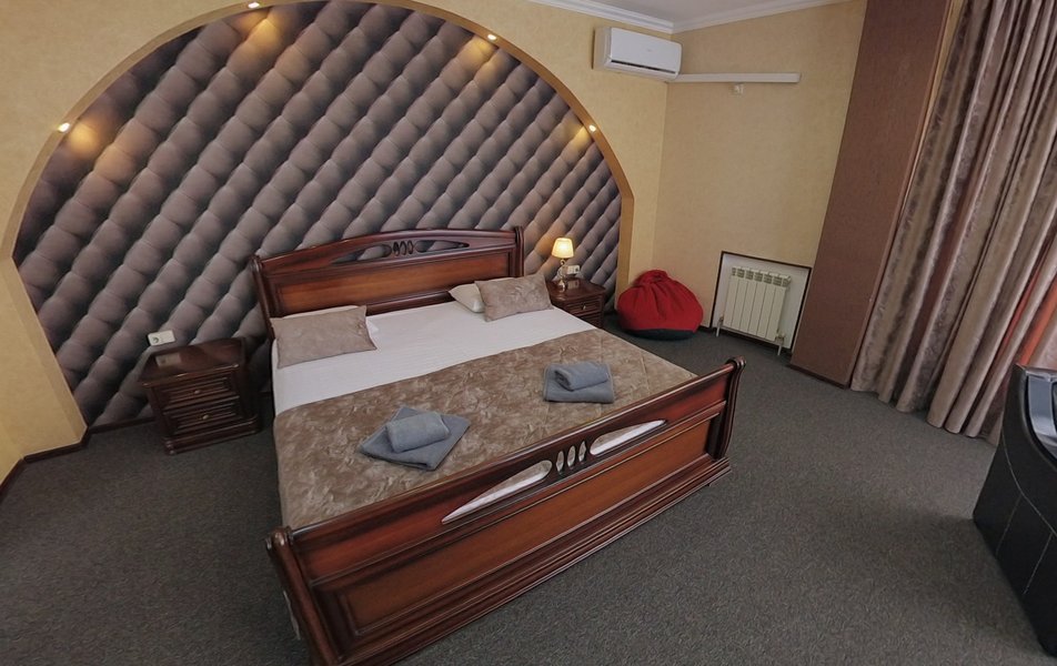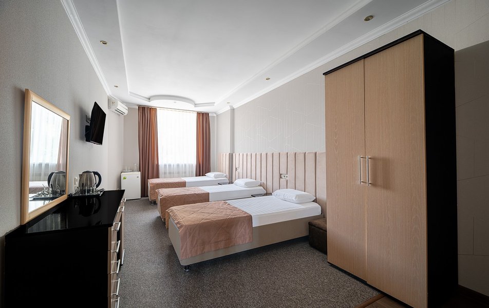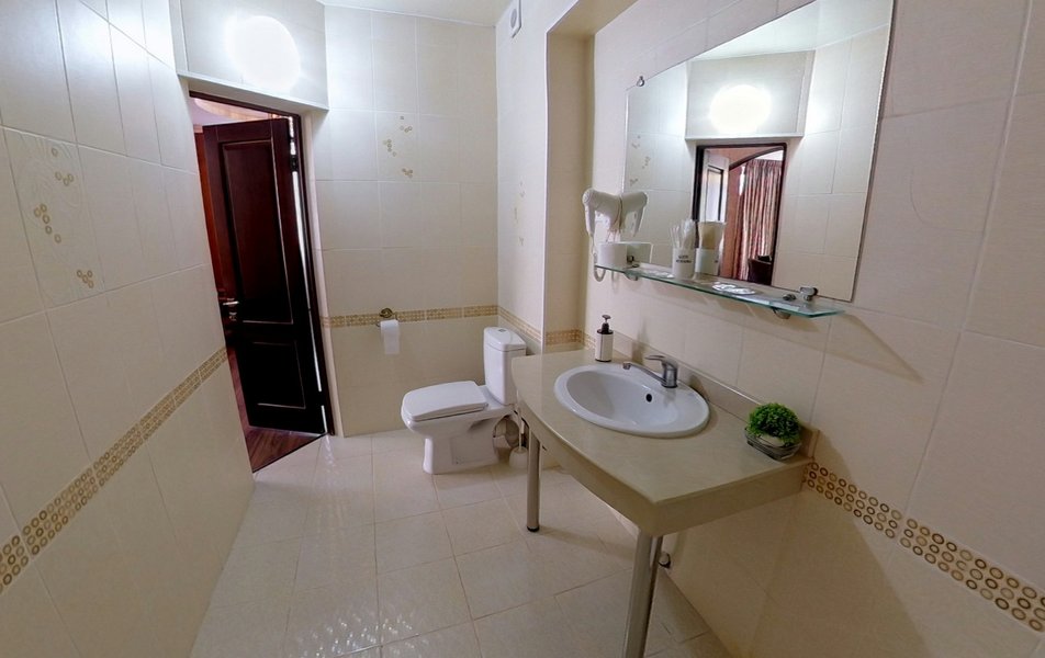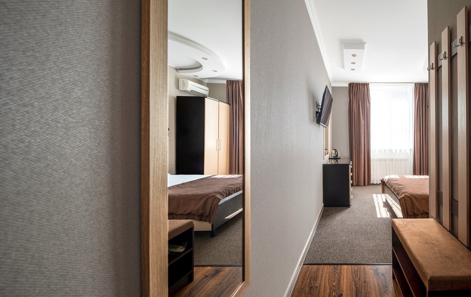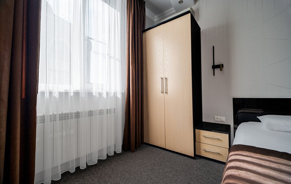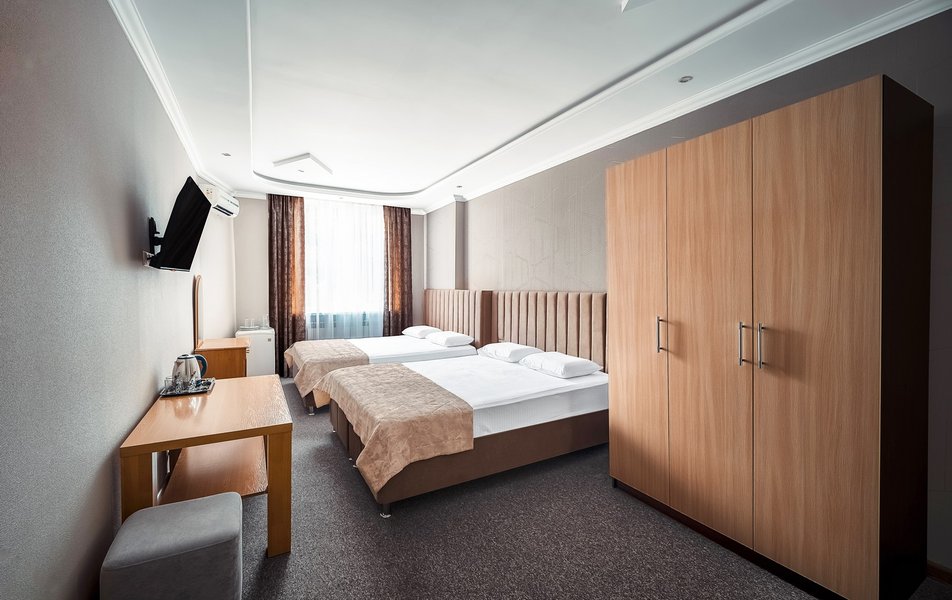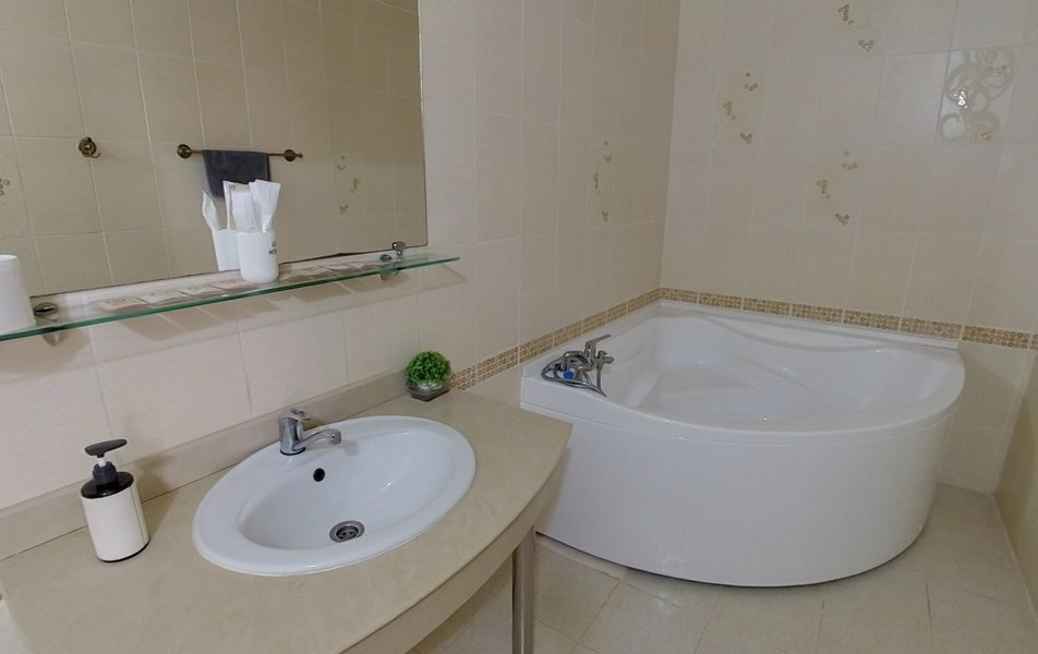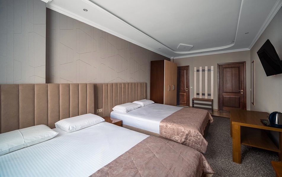 Взяли этот отель только из-за того, что он в Букинге «выкинул» интересный ценник за номер с двумя двухспальными кроватями. Номер оказался большим. Но грязным. Детей носил на руках, чтобы они босыми ногами не вставали на пол. Сложилось такое ощущение, что в комнату свалили не нужную мебель умирать. Детей не стали раздевать, они спали в одежде. Одеяла пыльные, хорошо, что тепло было, укрылись одними пододеяльниками. В ванной комнате так же грязно. Мыться побоялись. Приехали в отель в 23, а уехали в 8 утра. Надеюсь за это время ничего не подхватили. Да и кстати в выходной день ресторан работает с 10-00. Так что утреннего завтрака по выходным нет. Если отель не приведут в порядок, и вы волей какого не понятного случая попадёте туда: Спите в одежде в своих тапочках.