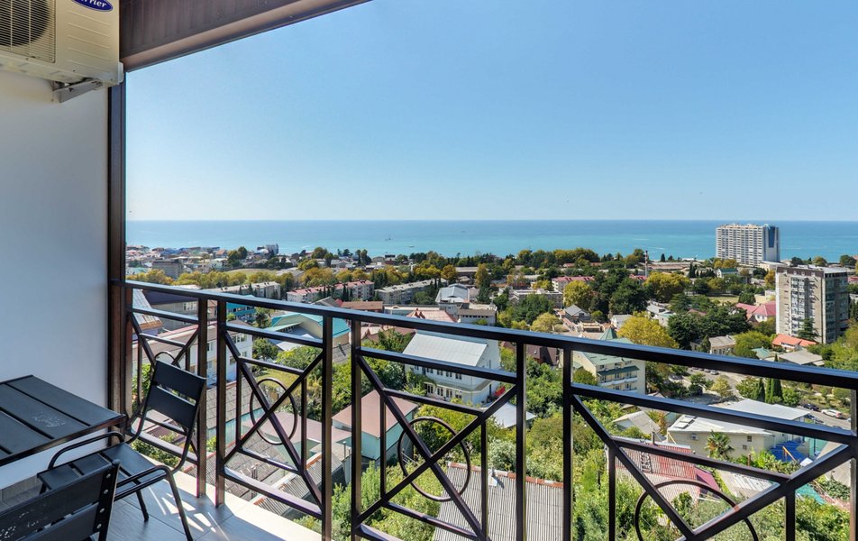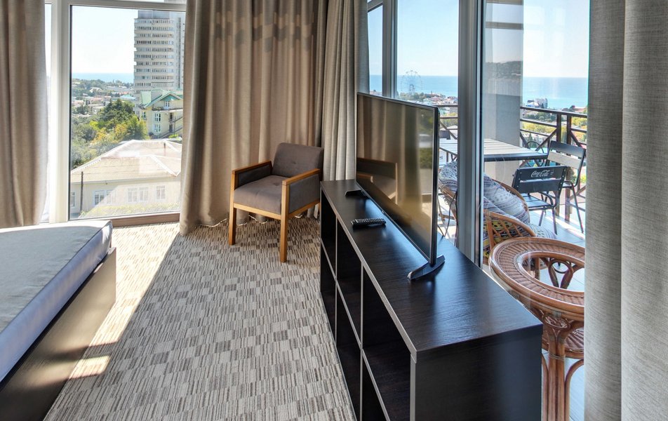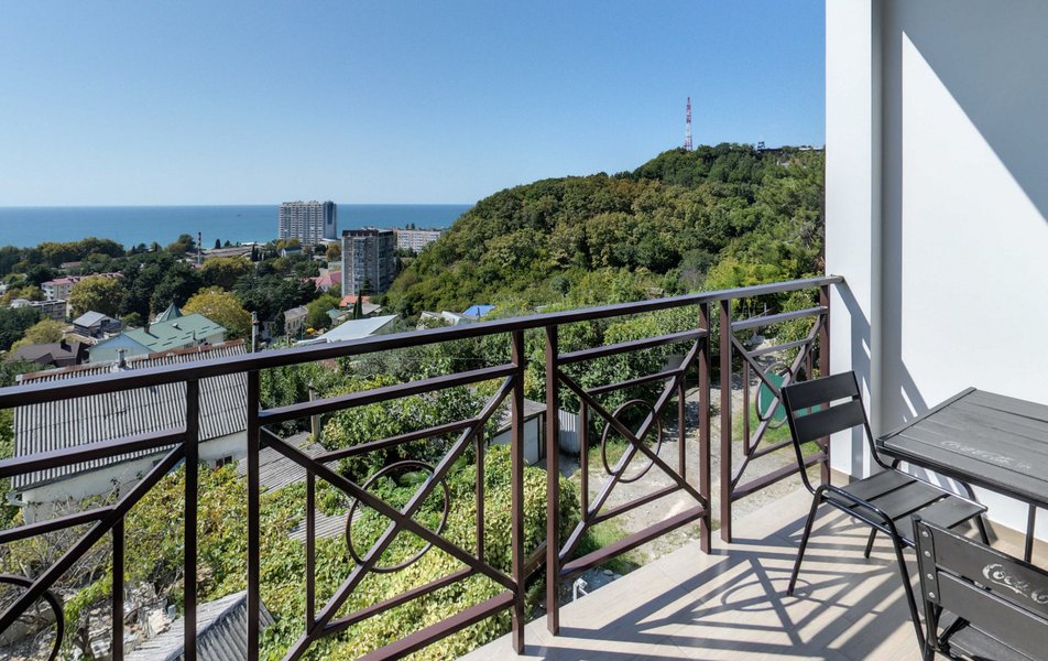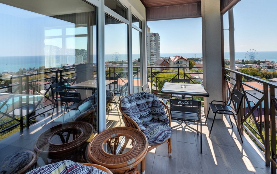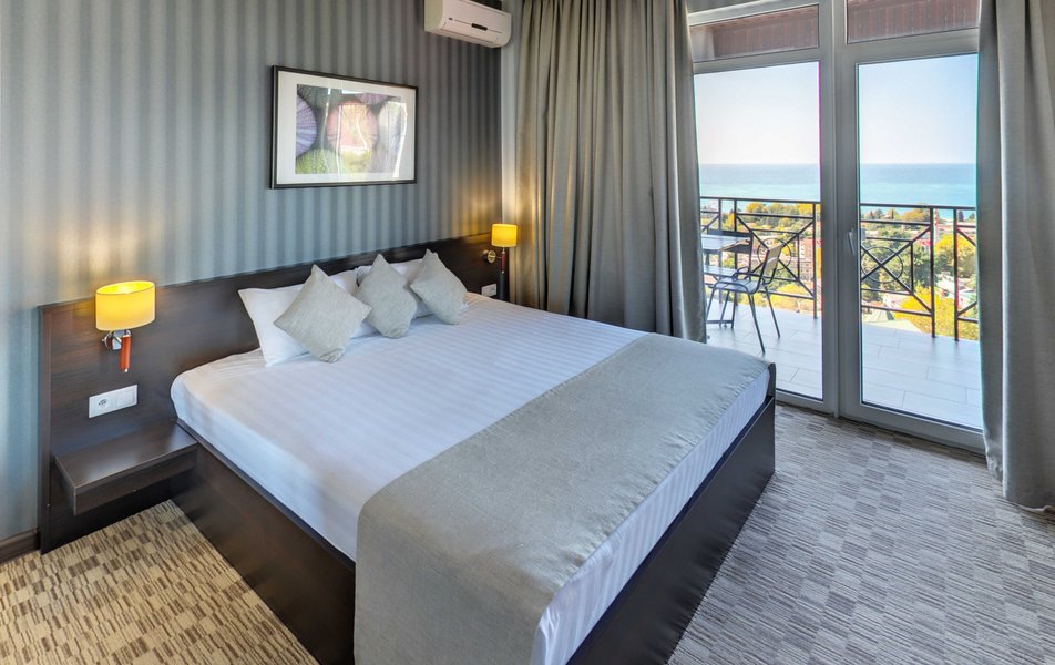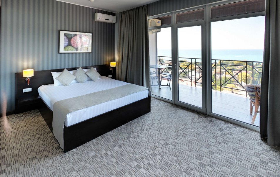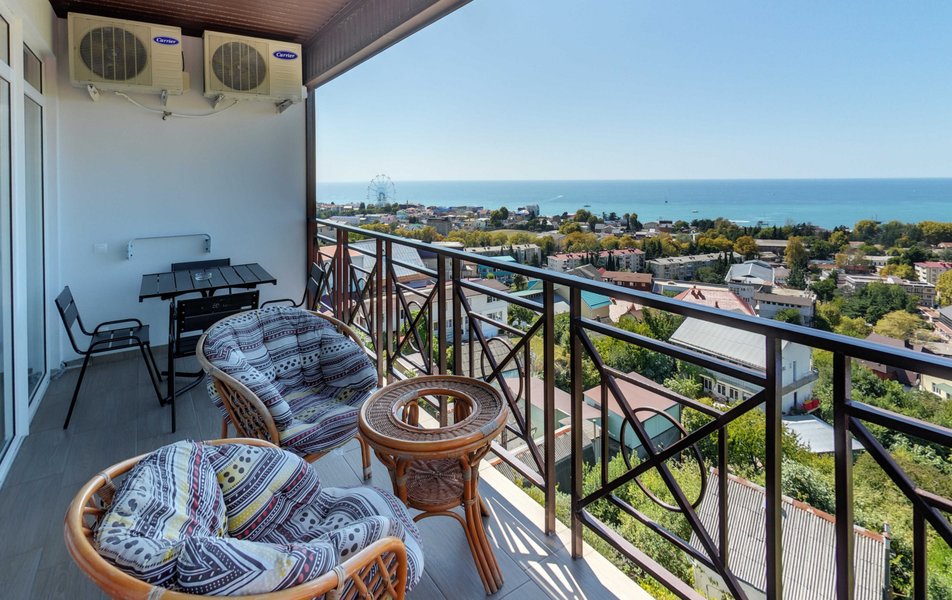 Апартаменты Делюкс Панорама Количество комнат: 1-комнатный Тип номера: Апартаменты Дополнительное место: раскладной диван, еврораскладушка Вид из номера: на море: панорамный Кол-во доп. мест: 2 Кол-во номеров: 2 Кол-во основных мест: 2 Площадь (кв. м): 50 Балкон: с мебелью и сушилкой Мебель: диван раскладной, кровать двуспальная, стол, стул, шкаф-купе Оборудование: гладильная доска, микроволновая печь, набор посуды, плита электрическая, сплит-система, телевизор, телефон, утюг, холодильник, электрочайник Санузел: биде, с душевой кабиной, тапочки, туалетные принадлежности, фен, халат Сервис: Wi-Fi бесплатно, смена полотенец: 1 раз в 2 дня, смена постельного белья: 1 раз в 3 дня, уборка номера: ежедневно