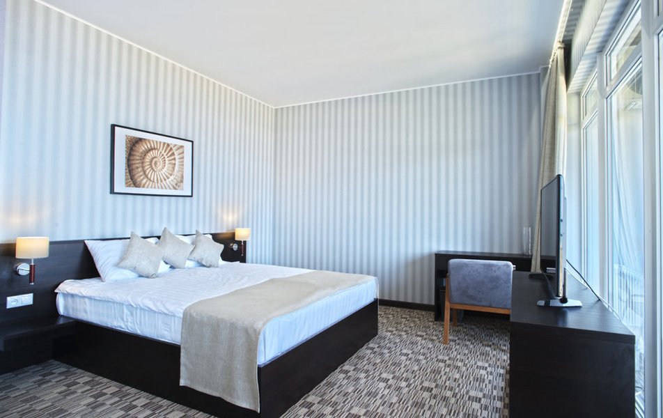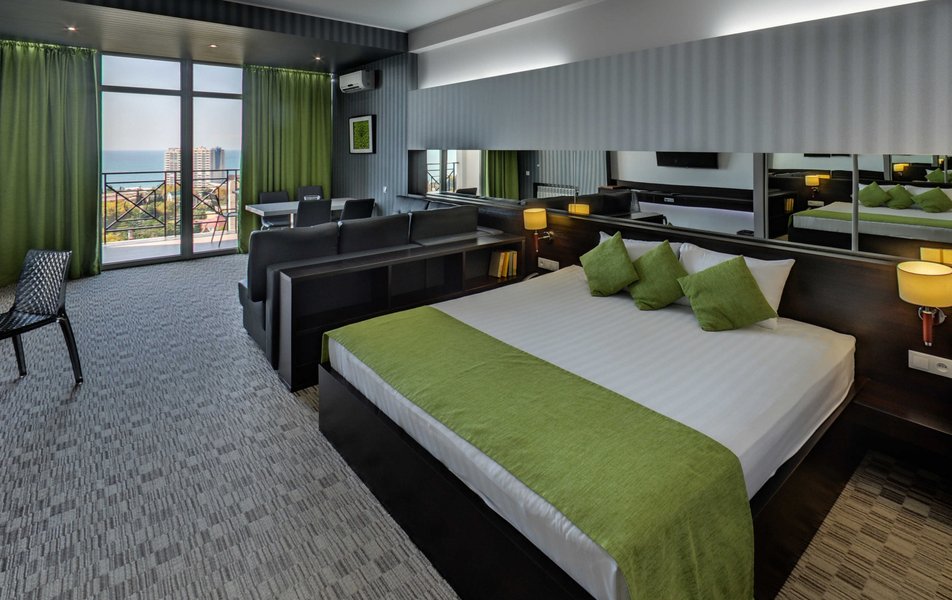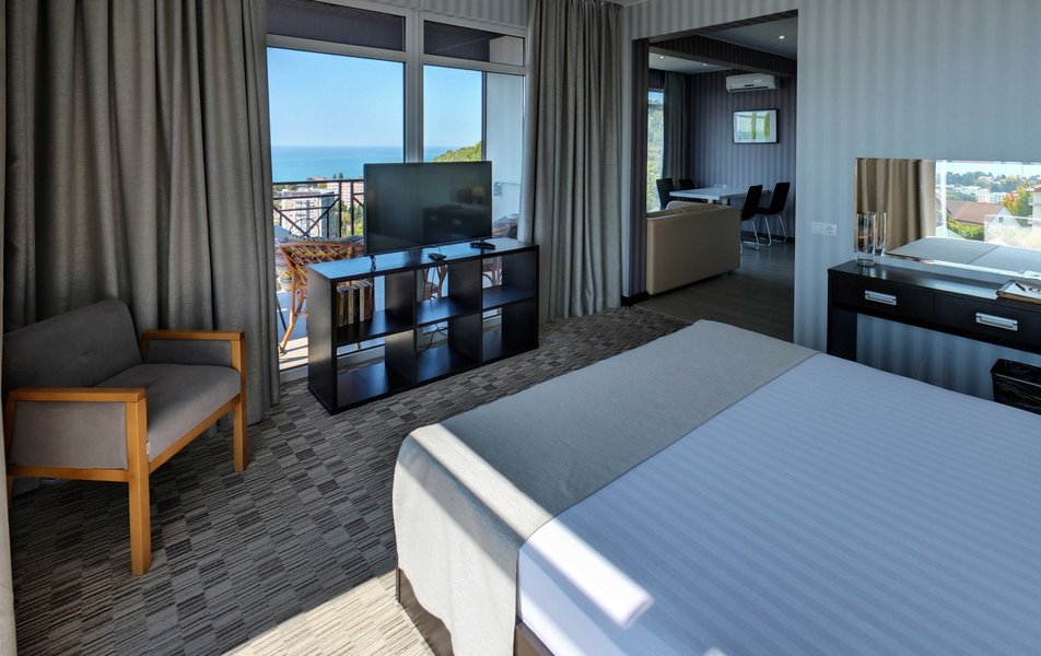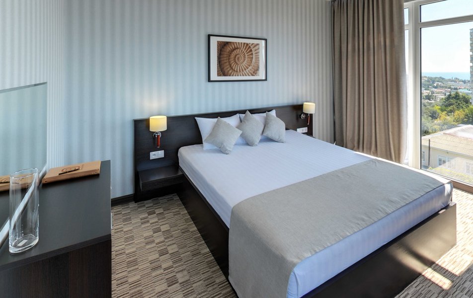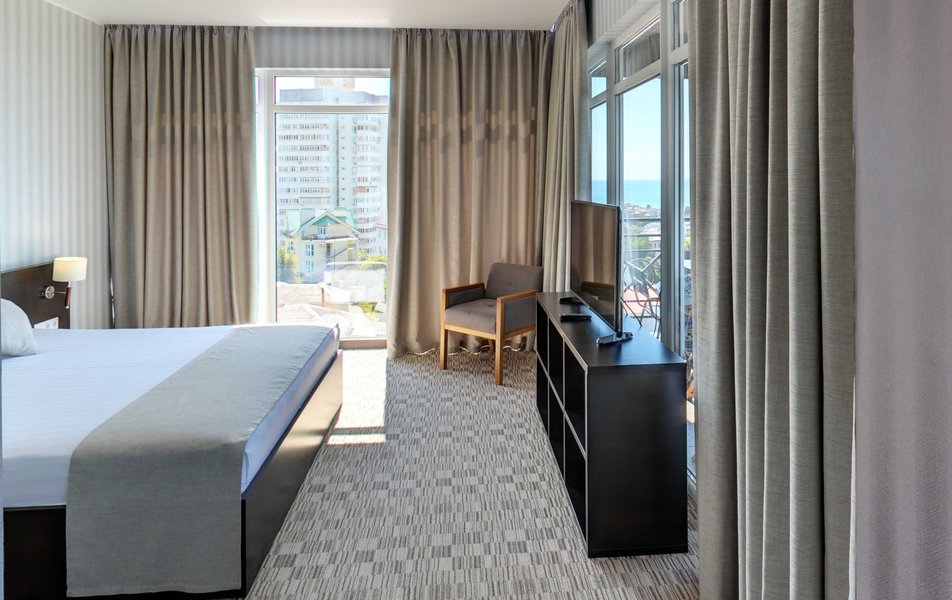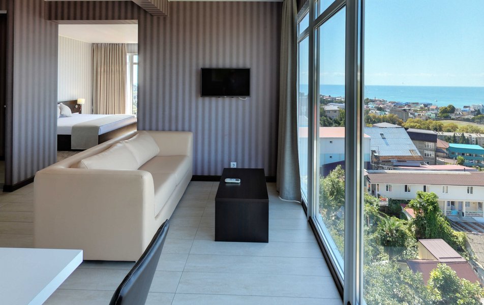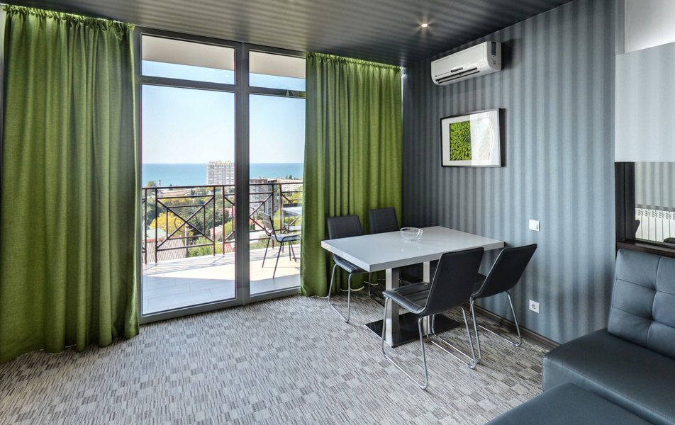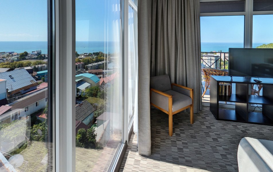 Апартаменты Делюкс Панорама Количество комнат: 1-комнатный Тип номера: Апартаменты Дополнительное место: раскладной диван, еврораскладушка Вид из номера: на море: панорамный Кол-во доп. мест: 2 Кол-во номеров: 2 Кол-во основных мест: 2 Площадь (кв. м): 50 Балкон: с мебелью и сушилкой Мебель: диван раскладной, кровать двуспальная, стол, стул, шкаф-купе Оборудование: гладильная доска, микроволновая печь, набор посуды, плита электрическая, сплит-система, телевизор, телефон, утюг, холодильник, электрочайник Санузел: биде, с душевой кабиной, тапочки, туалетные принадлежности, фен, халат Сервис: Wi-Fi бесплатно, смена полотенец: 1 раз в 2 дня, смена постельного белья: 1 раз в 3 дня, уборка номера: ежедневно