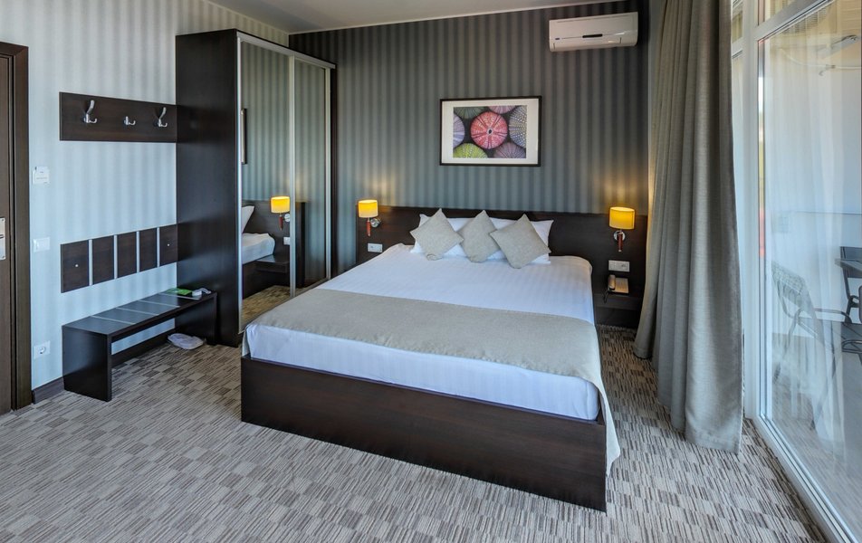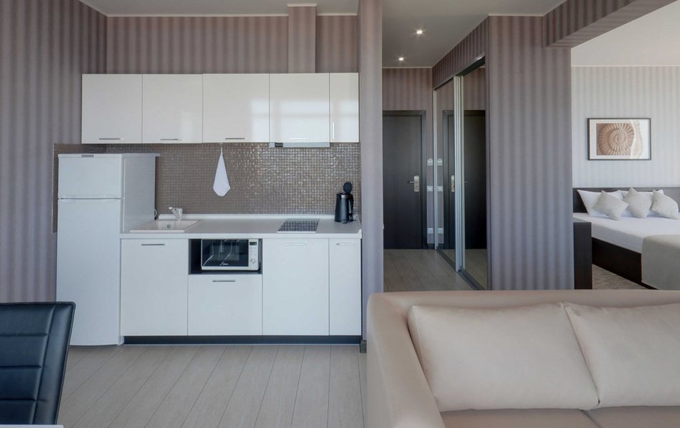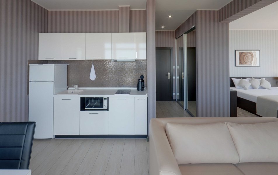 Апартаменты Студио Количество комнат: 1-комнатный Тип номера: Апартаменты Дополнительное место: раскладной диван, еврораскладушка Вид из номера: на море Кол-во доп. мест: 2 Кол-во номеров: 15 Кол-во основных мест: 2 Площадь (кв. м): 50 Балкон: с мебелью и сушилкой Мебель: диван раскладной, кровать двуспальная, стол, стул, шкаф-купе Оборудование: гладильная доска, микроволновая печь, набор посуды, плита электрическая, сейф, сплит-система, телевизор, телефон, утюг, холодильник Санузел: биде, с душевой кабиной, туалетные принадлежности, фен Сервис: Wi-Fi бесплатно, смена полотенец: 1 раз в 2 дня, смена постельного белья: 1 раз в 3 дня, уборка номера: ежедневно