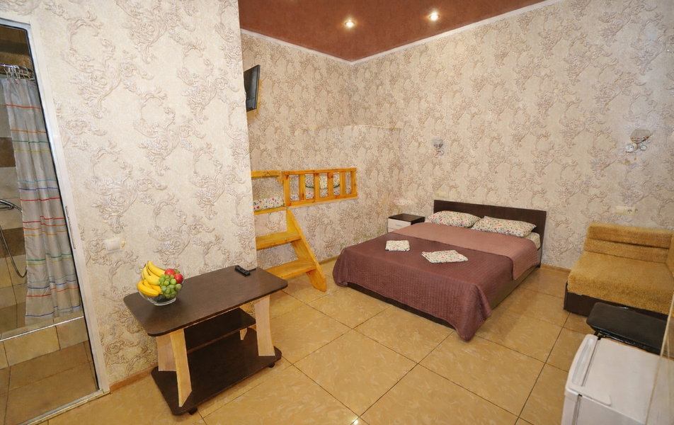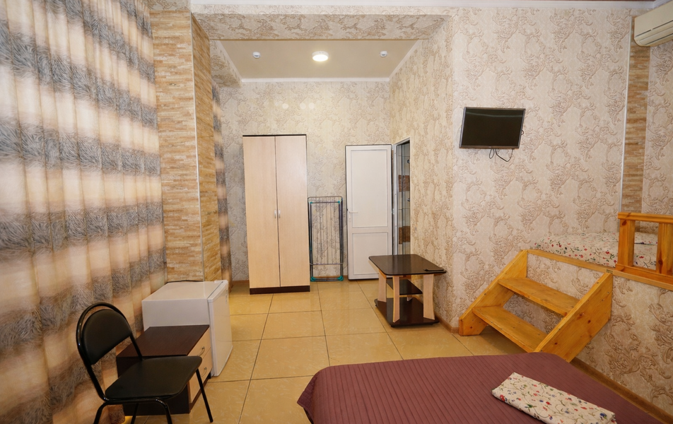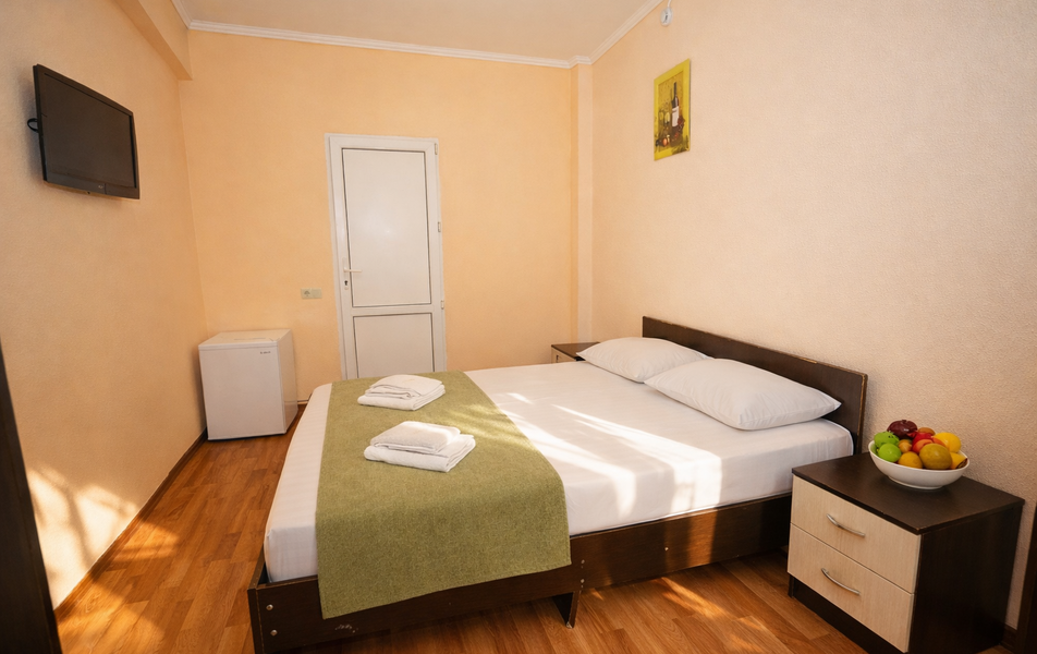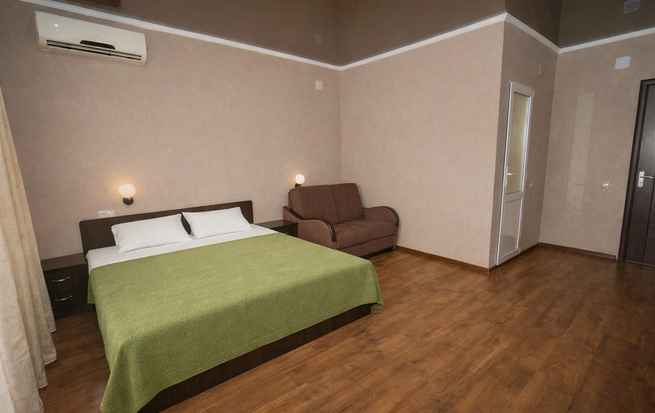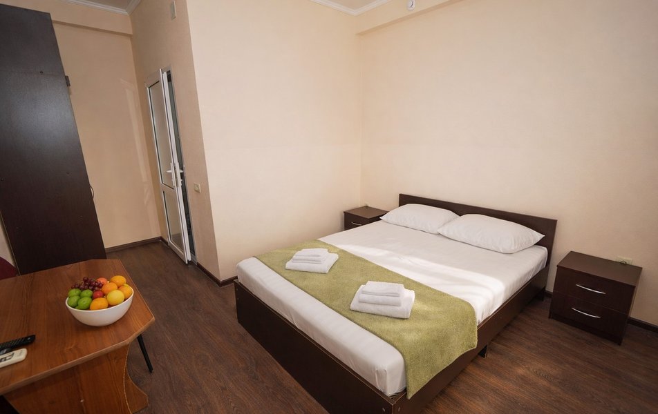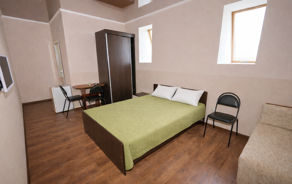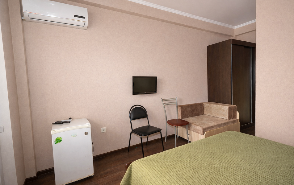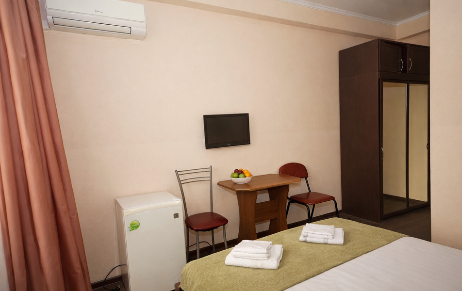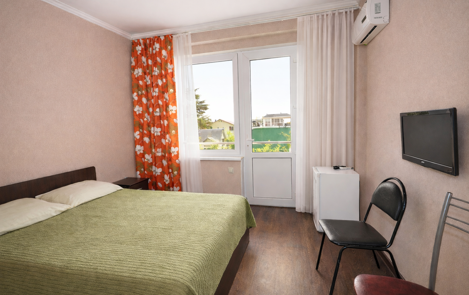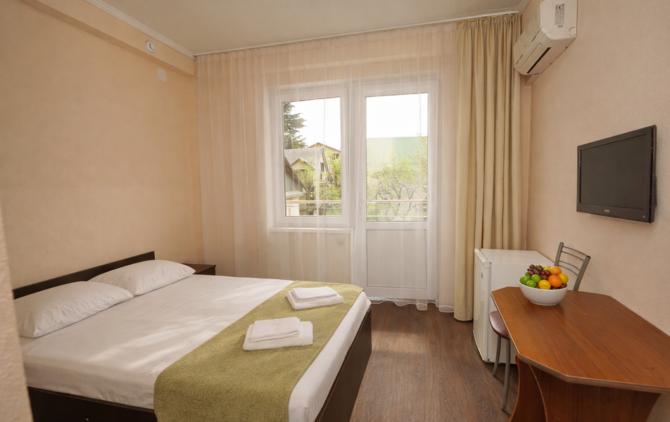 Стандартный 2-местный Количество комнат: 1-комнатный Тип номера: Стандартный Вид из номера: на сад: на город Кол-во основных мест: 2 Площадь (кв. м): 18 Балкон: с мебелью Мебель: кресло: раскладное, кровать двуспальная, прикроватные тумбочки, шкаф Оборудование: сплит-система, телевизор, холодильник Санузел: с душем Сервис: Wi-Fi бесплатно, смена полотенец: 1 раз в 6 дней, ранее - по запросу за доп. плату, смена постельного белья: 1 раз в 6 дней, ранее - по запросу за доп. плату, уборка номера: 1 раз в 6 дней, ранее - по запросу за доп. плату