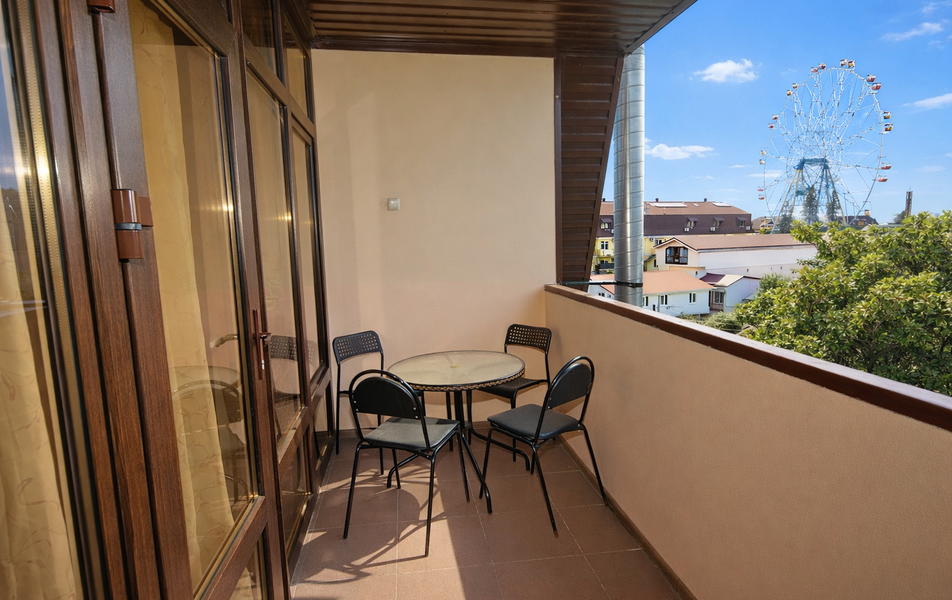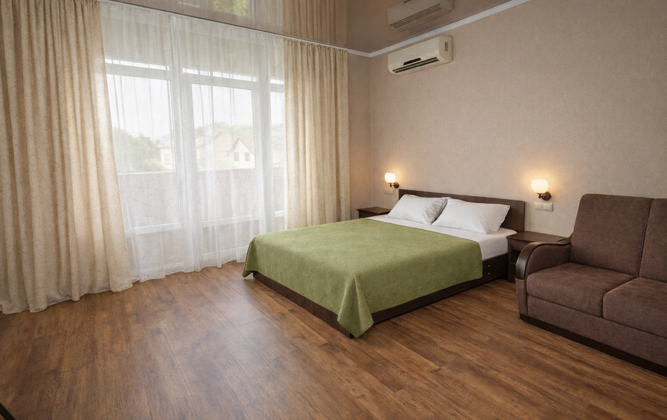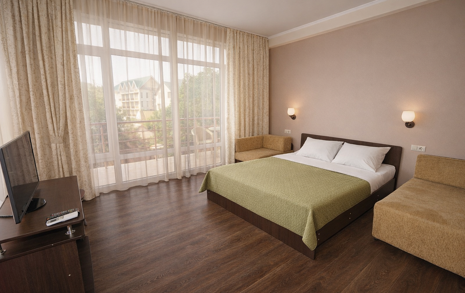 Комфорт 4-местный Количество комнат: 1-комнатный Тип номера: Комфорт Вид из номера: на сад: на город Кол-во основных мест: 4 Площадь (кв. м): 30 Балкон: с мебелью Мебель: диван: кровать или два раскладных кресла, кровать двуспальная: King-size, прикроватные тумбочки, стол, шкаф Оборудование: сплит-система, телевизор, холодильник Санузел: с душем Сервис: Wi-Fi бесплатно, смена полотенец: 1 раз в 6 дней, ранее - по запросу за доп. плату, смена постельного белья: 1 раз в 6 дней, ранее - по запросу за доп. плату, уборка номера: 1 раз в 6 дней, ранее - по запросу за доп. плату