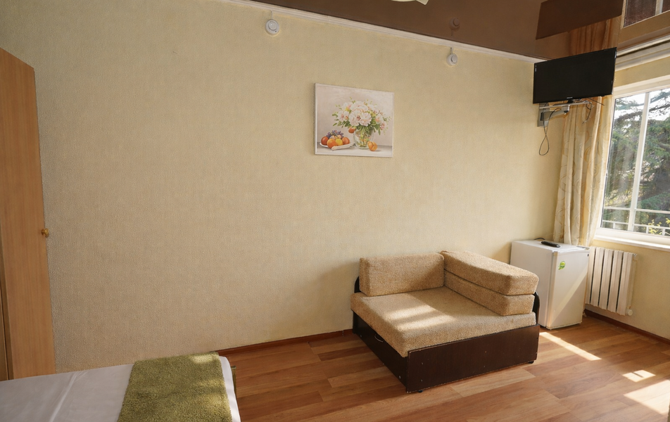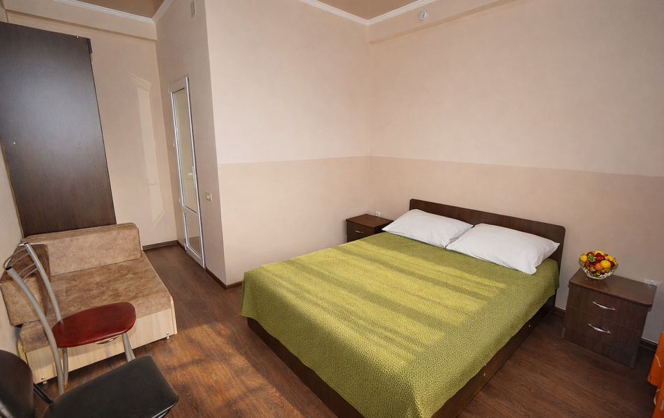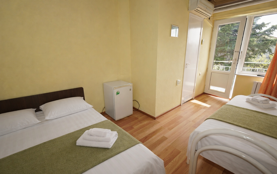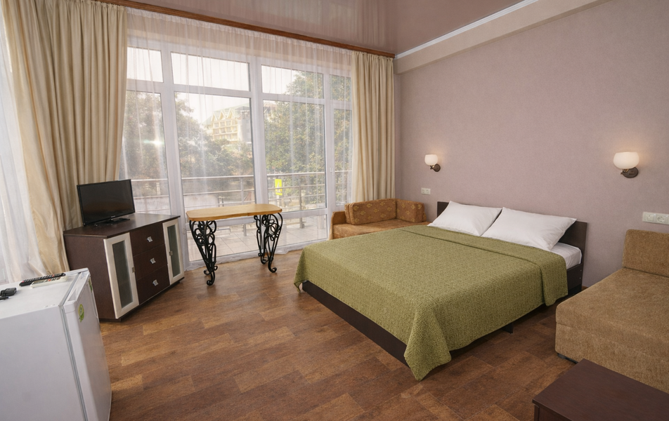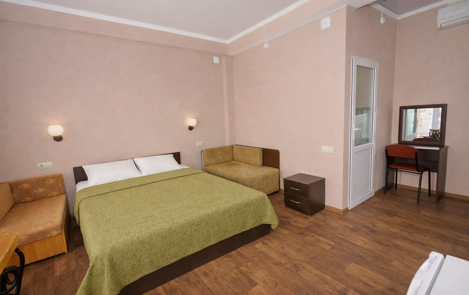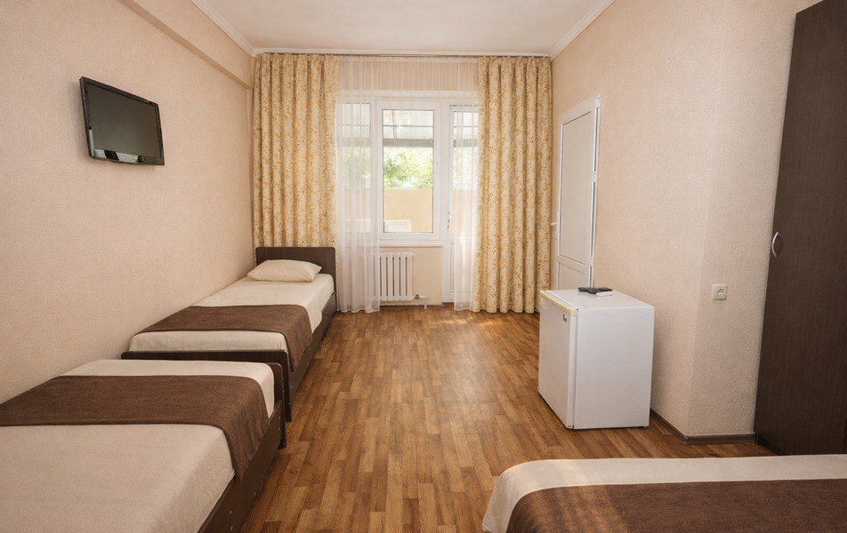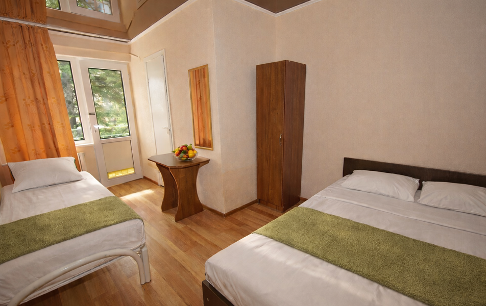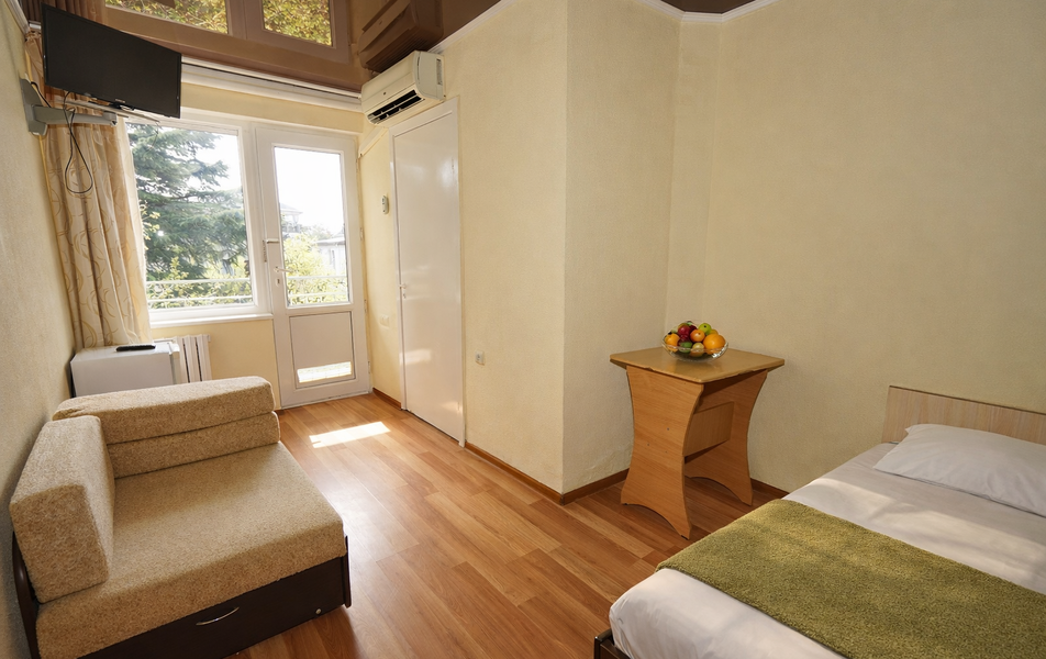 Комфорт 3-местный Количество комнат: 1-комнатный Тип номера: Комфорт Вид из номера: на сад: город Кол-во основных мест: 3 Площадь (кв. м): 24 Балкон: с мебелью Мебель: диван раскладной: односпальный, кровать двуспальная, прикроватные тумбочки, шкаф Оборудование: сплит-система, телевизор, холодильник Санузел: с душем Сервис: Wi-Fi бесплатно, смена полотенец: 1 раз в 6 дней, ранее - по запросу за доп. плату, смена постельного белья: 1 раз в 6 дней, ранее - по запросу за доп. плату, уборка номера: 1 раз в 6 дней, ранее - по запросу за доп. плату