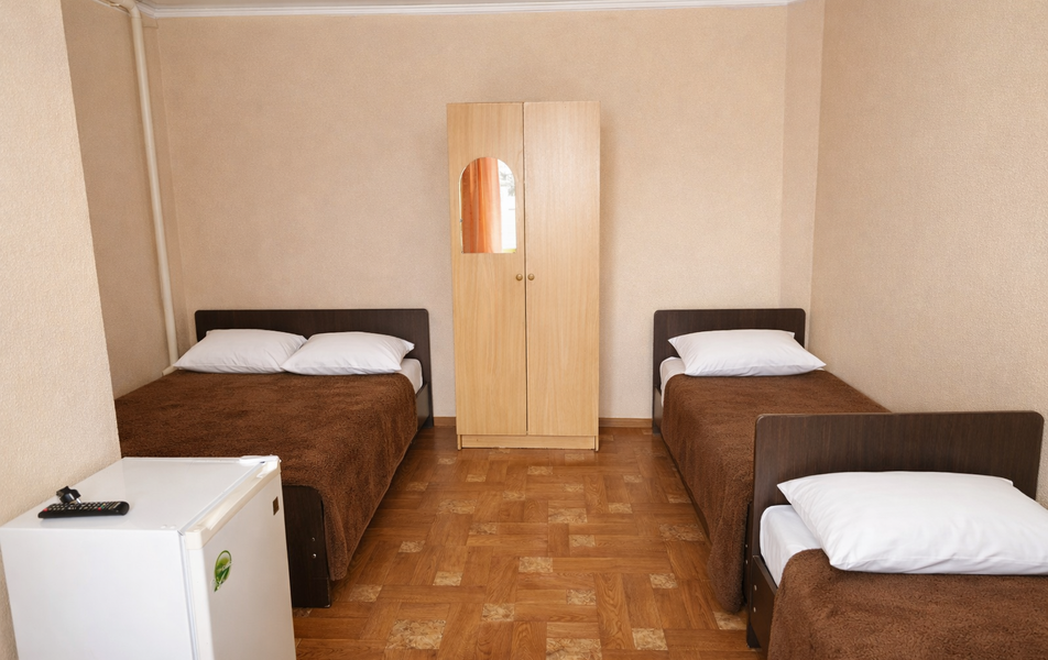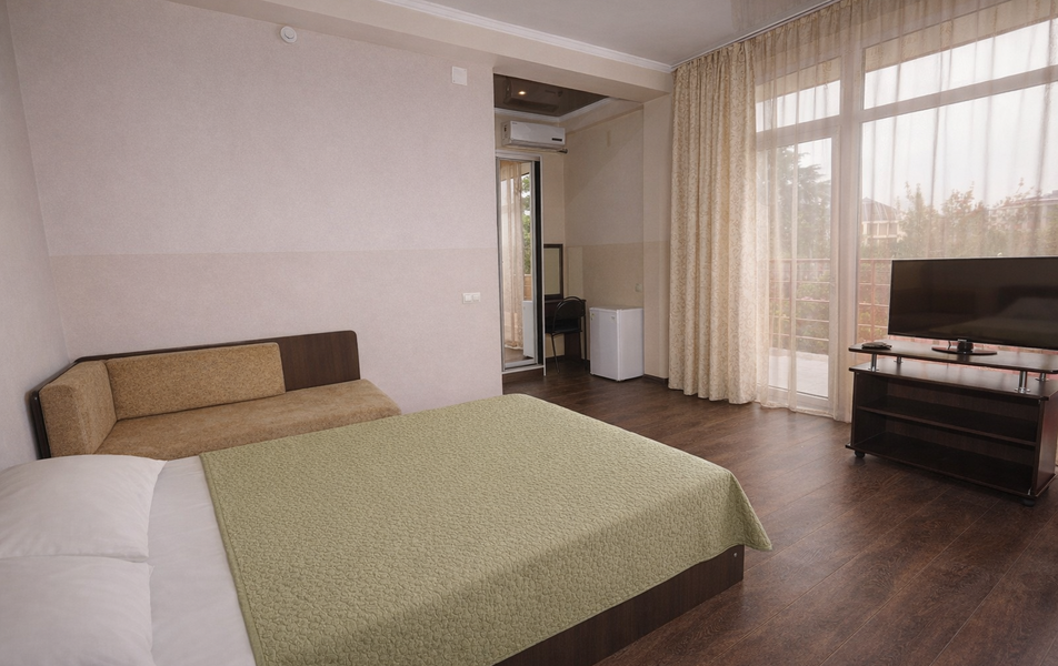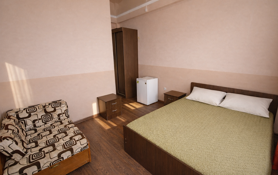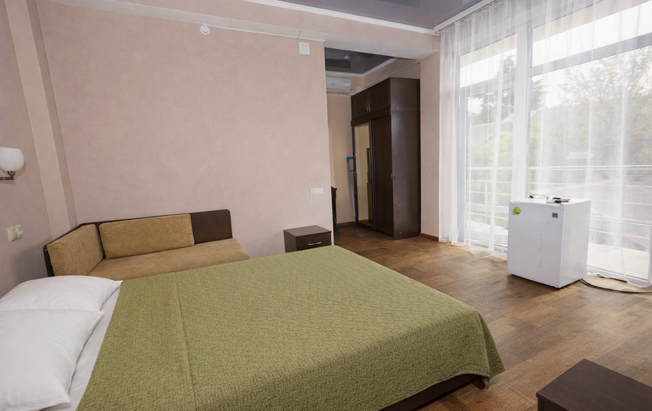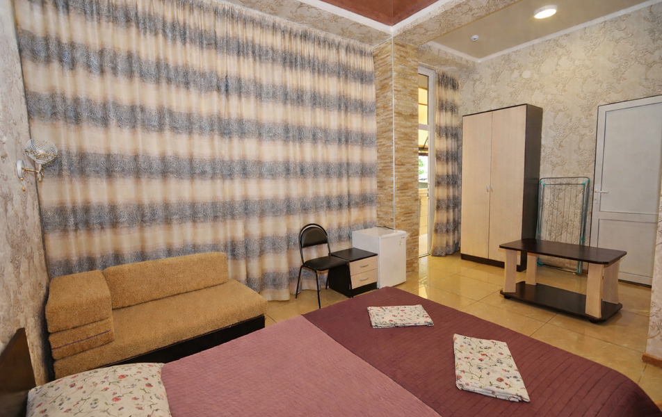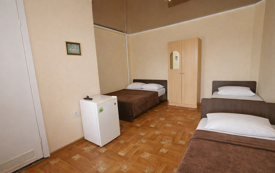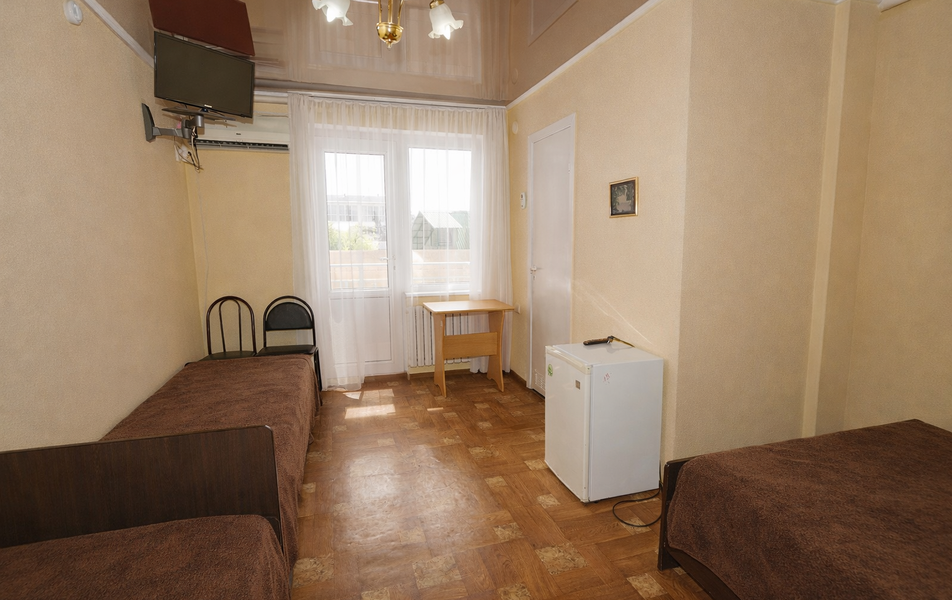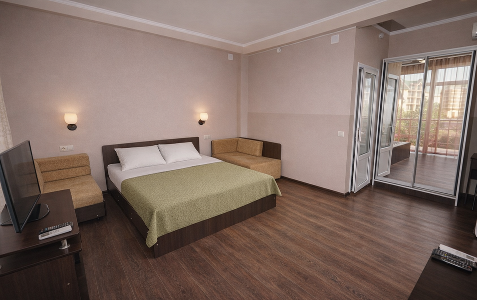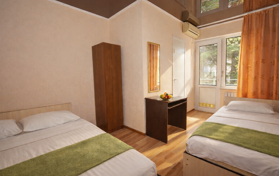 Комфорт 3-местный Количество комнат: 1-комнатный Тип номера: Комфорт Вид из номера: на сад: город Кол-во основных мест: 3 Площадь (кв. м): 24 Балкон: с мебелью Мебель: диван раскладной: односпальный, кровать двуспальная, прикроватные тумбочки, шкаф Оборудование: сплит-система, телевизор, холодильник Санузел: с душем Сервис: Wi-Fi бесплатно, смена полотенец: 1 раз в 6 дней, ранее - по запросу за доп. плату, смена постельного белья: 1 раз в 6 дней, ранее - по запросу за доп. плату, уборка номера: 1 раз в 6 дней, ранее - по запросу за доп. плату