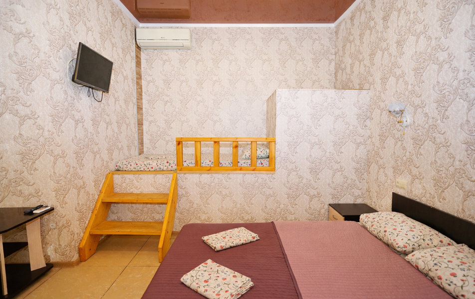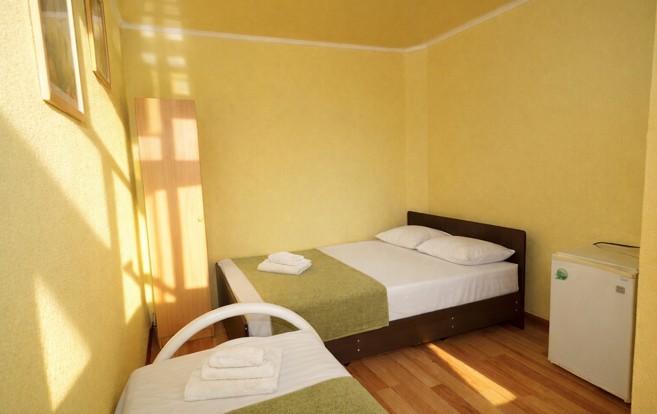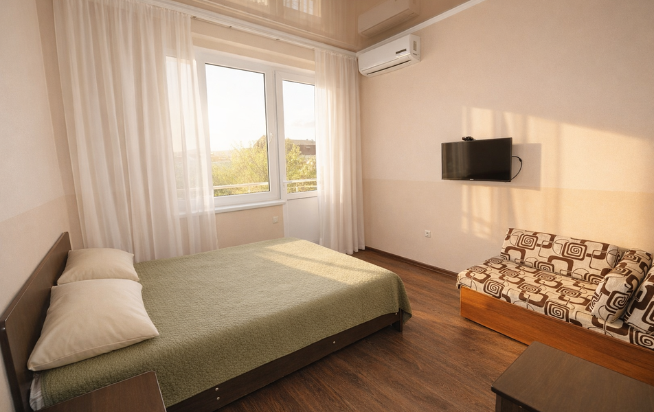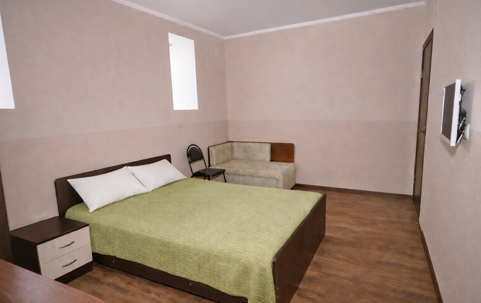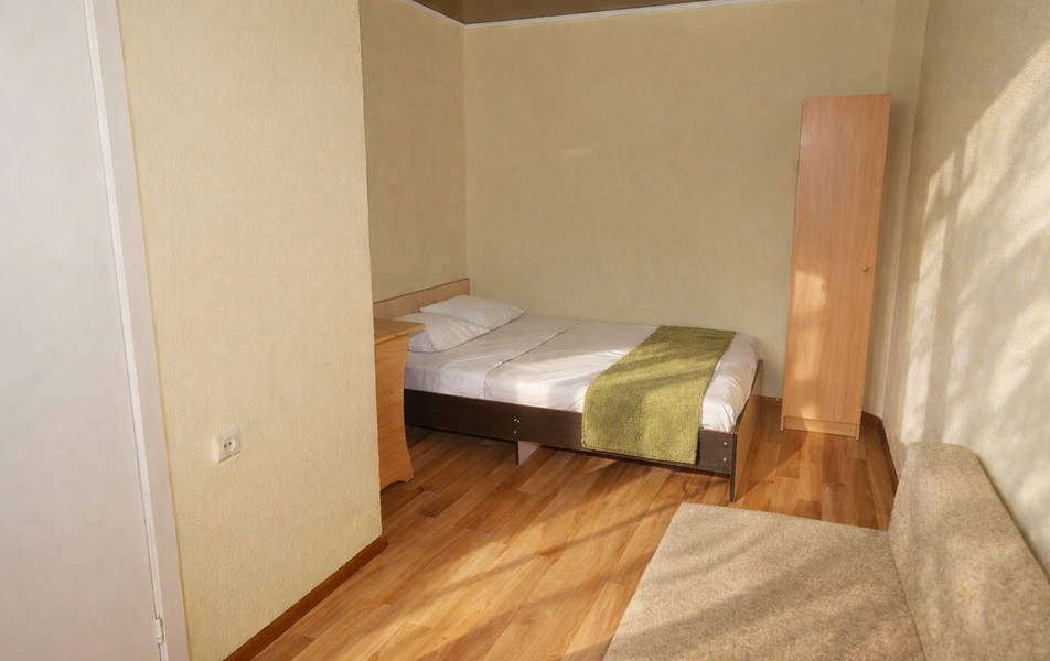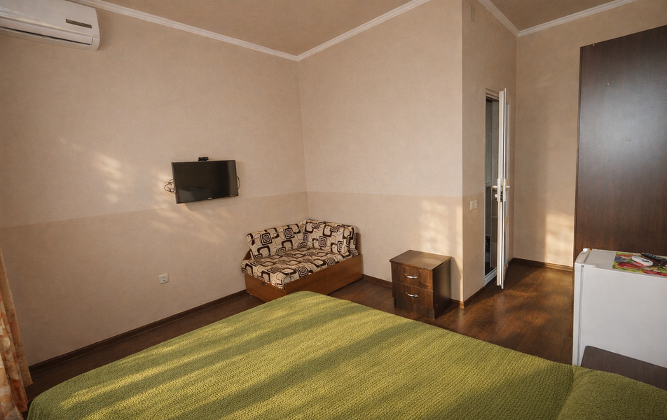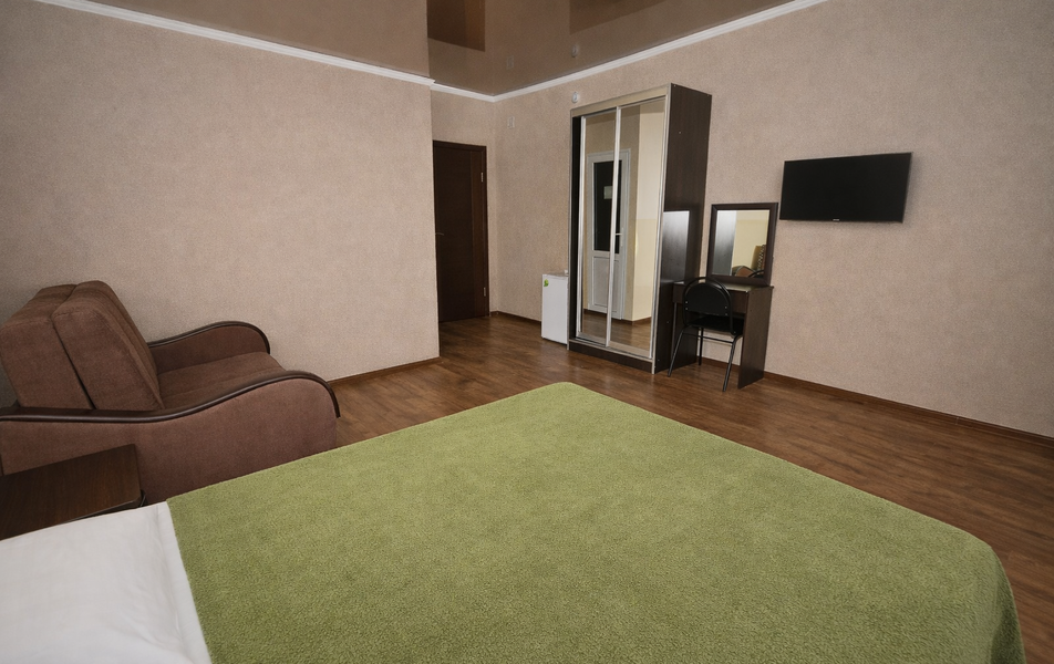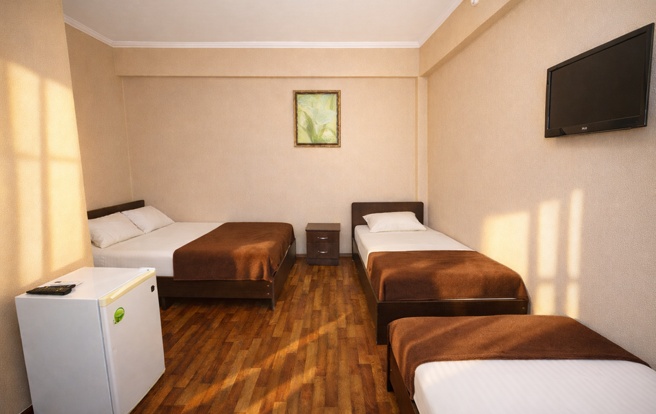 Комфорт 3-местный Количество комнат: 1-комнатный Тип номера: Комфорт Вид из номера: на сад: город Кол-во основных мест: 3 Площадь (кв. м): 24 Балкон: с мебелью Мебель: диван раскладной: односпальный, кровать двуспальная, прикроватные тумбочки, шкаф Оборудование: сплит-система, телевизор, холодильник Санузел: с душем Сервис: Wi-Fi бесплатно, смена полотенец: 1 раз в 6 дней, ранее - по запросу за доп. плату, смена постельного белья: 1 раз в 6 дней, ранее - по запросу за доп. плату, уборка номера: 1 раз в 6 дней, ранее - по запросу за доп. плату