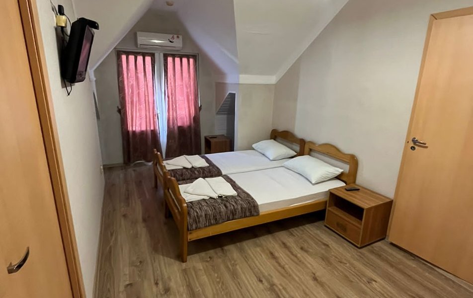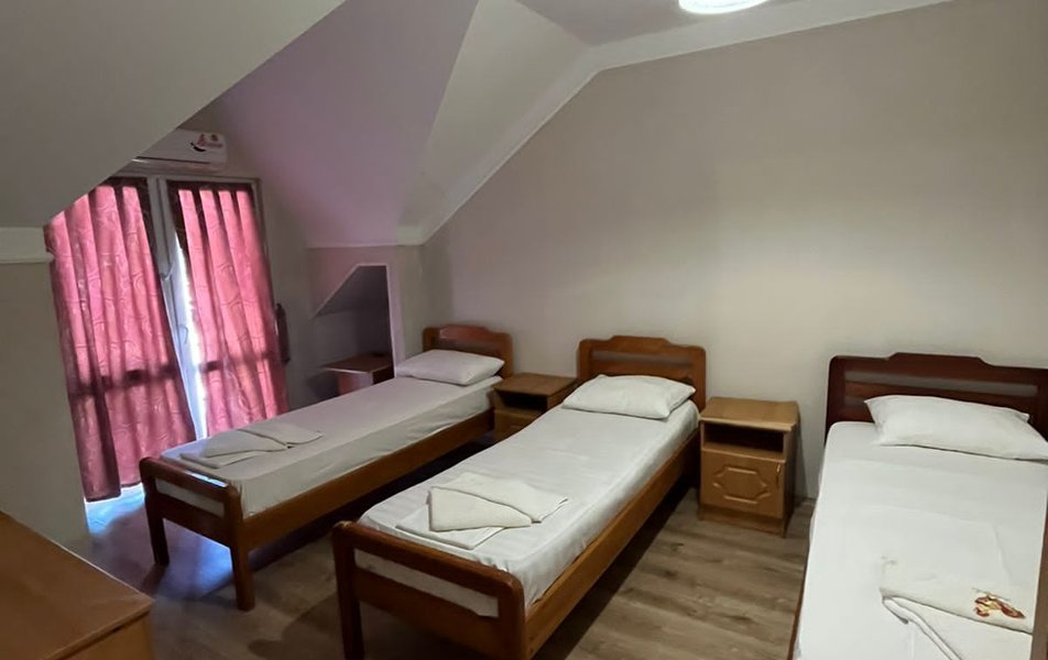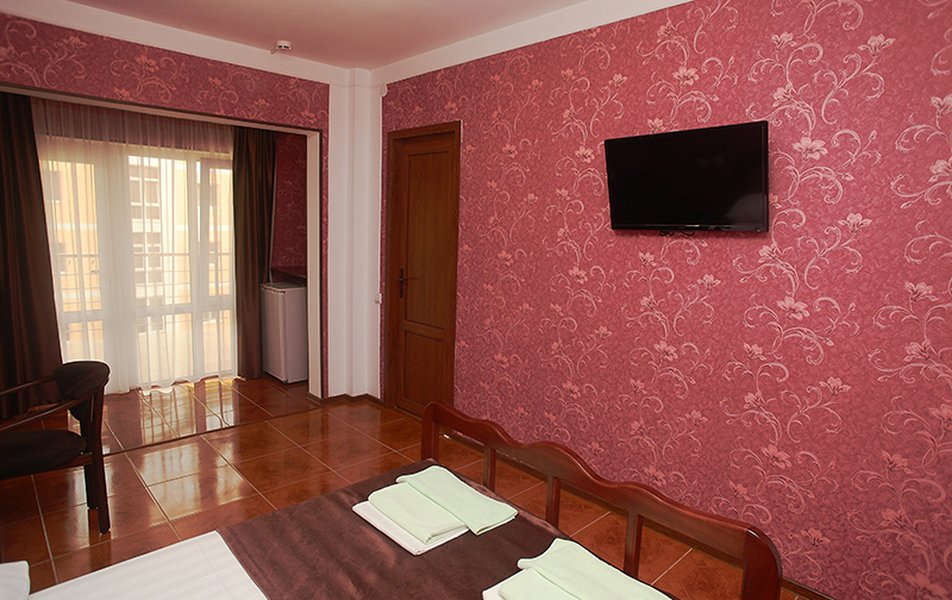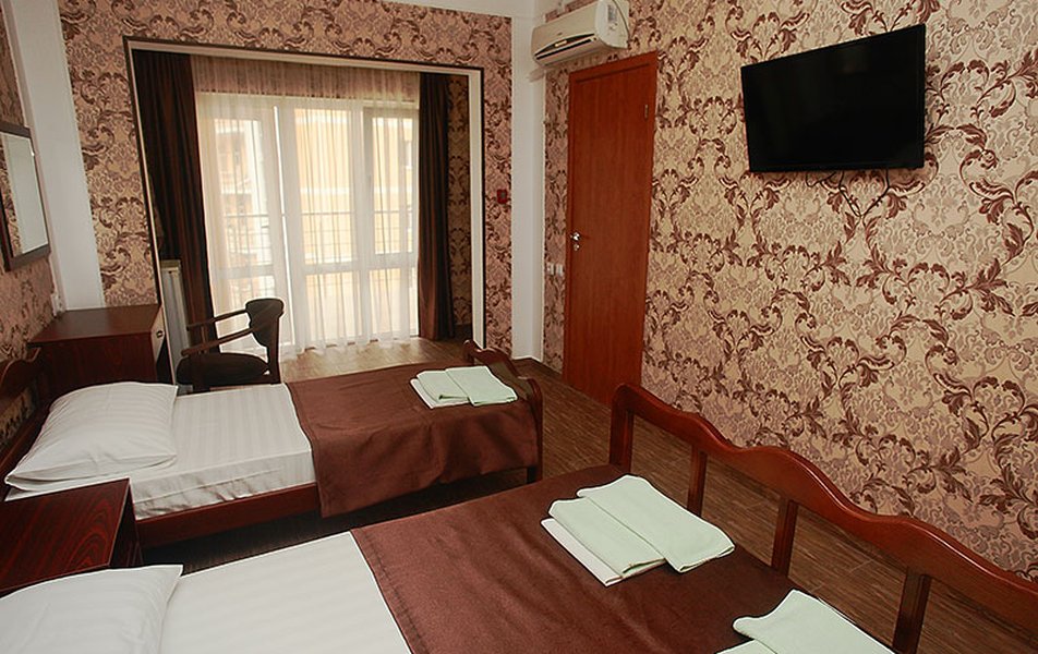 Стандартный 3-местный Количество комнат: 1-комнатный Тип номера: Стандартный Дополнительное место: раскладушка Кол-во доп. мест: 1 (3-7 лет) Кол-во номеров: 40 Кол-во основных мест: 3 Площадь (кв. м): 17 Мебель: вешалка, зеркало, кровать односпальная: 3, прикроватные тумбочки, шкаф Оборудование: кондиционер, телевизор, холодильник Санузел: с душем, туалетные принадлежности Сервис: Wi-Fi бесплатно, смена полотенец, смена постельного белья, уборка номера Терраса: оборудована мебелью