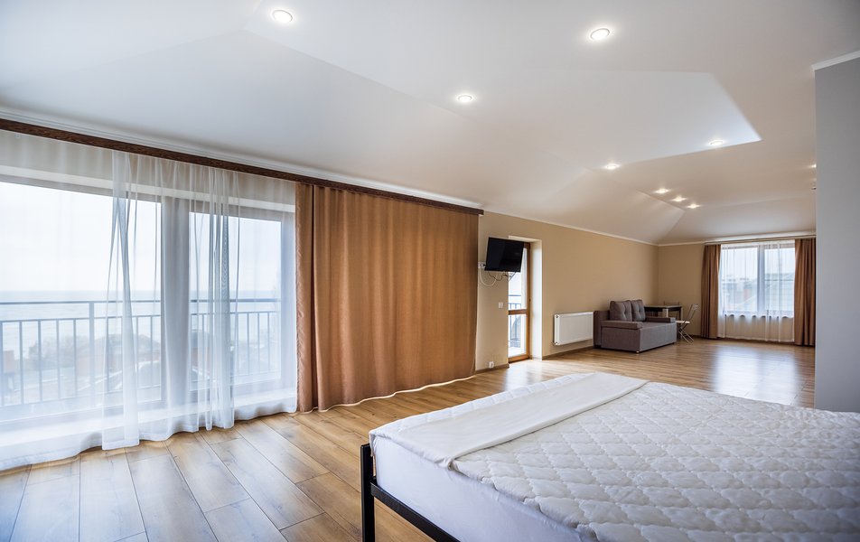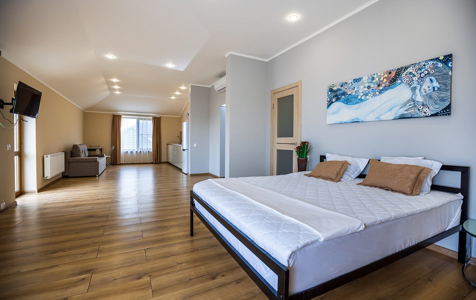 Люкс 4-местный 1-комнатный Количество комнат: 1-комнатный Тип номера: Люкс Кол-во основных мест: 4 Площадь (кв. м): 80 Мебель: вешалка, диван раскладной, зеркало, кровать двуспальная, кухонная мебель, прикроватные тумбочки, стол: обеденный, стулья, шкаф Оборудование: кондиционер, микроволновая печь, набор посуды, плита электрическая, телевизор, холодильник, электрочайник Санузел: с душем, туалетные принадлежности Сервис: Wi-Fi бесплатно, смена полотенец, смена постельного белья, уборка номера