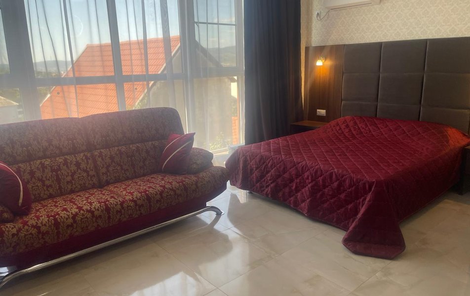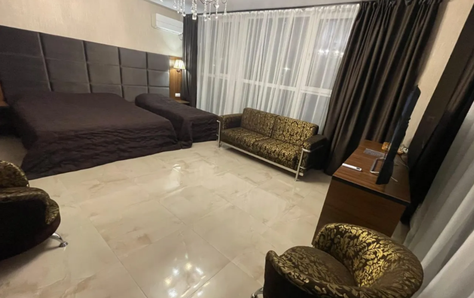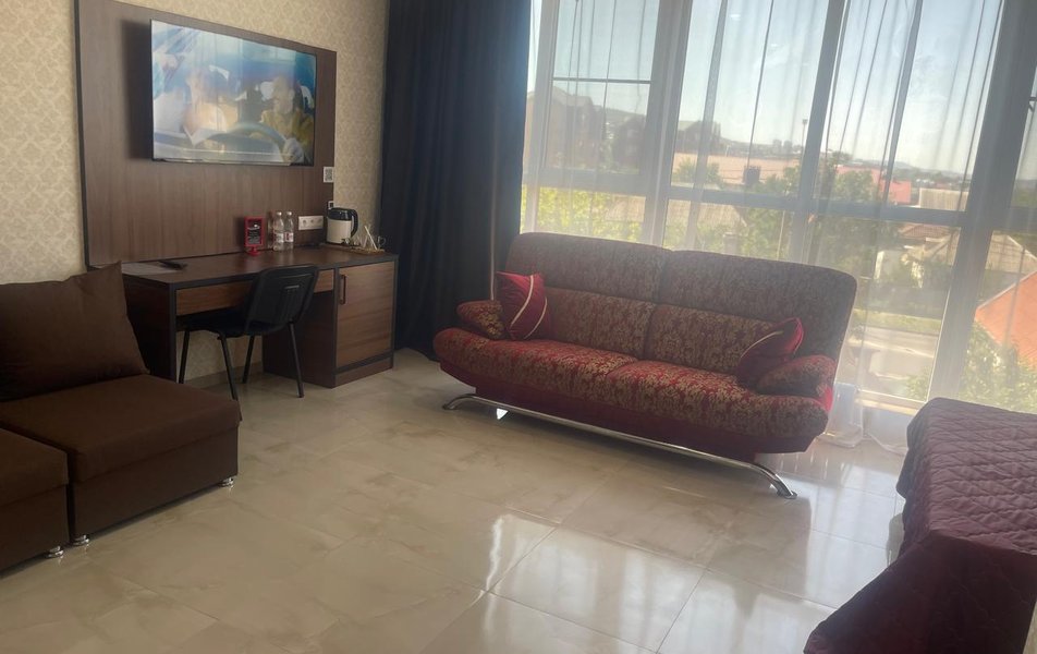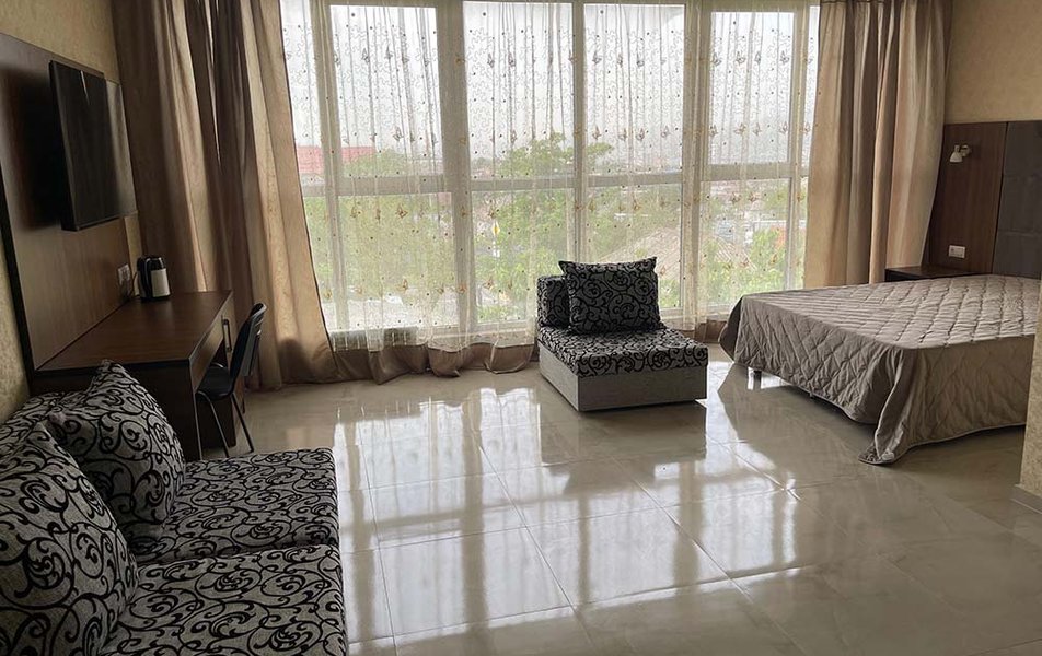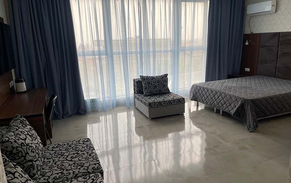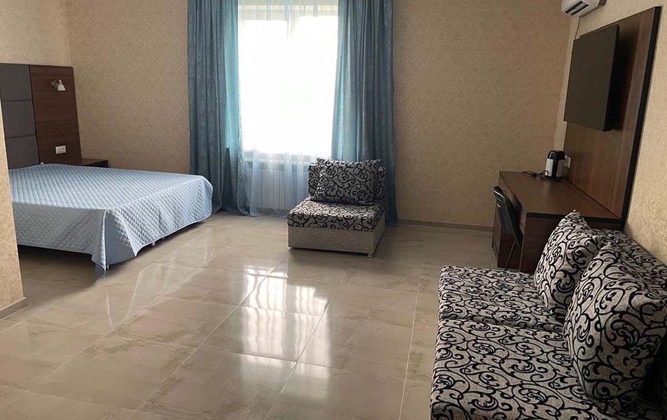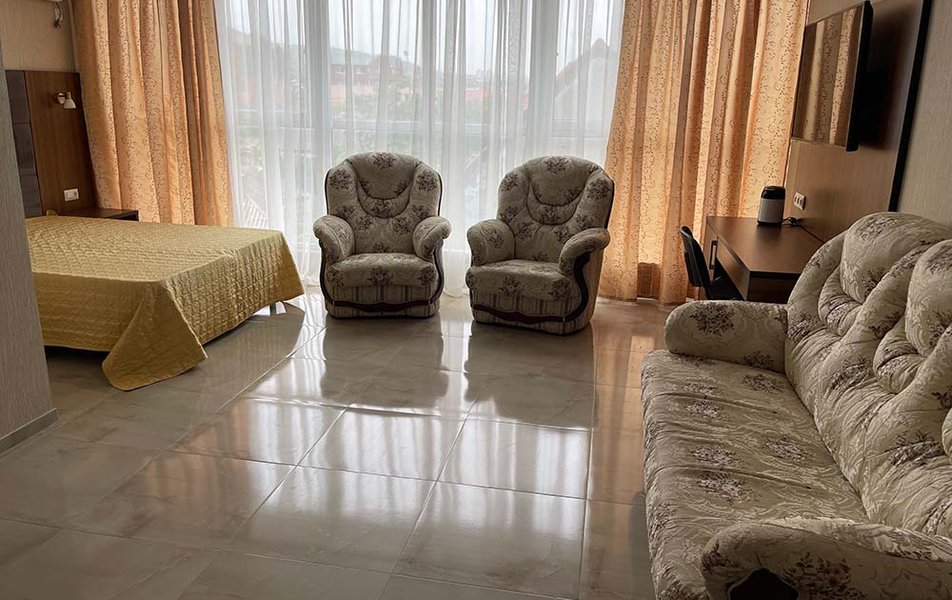 Люкс 2-местный (вид на море) Количество комнат: 1-комнатный Тип номера: Люкс Вид из номера: на море Кол-во основных мест: 2 Мебель: вешалка, зеркало, кровать двуспальная, набор мягкой мебели, стол, шкаф Оборудование: сплит-система, телевизор ЖК, холодильник, чайная станция Санузел: с ванной, тапочки, туалетные принадлежности, фен, халат Сервис: Wi-Fi бесплатно, смена полотенец, смена постельного белья, уборка номера