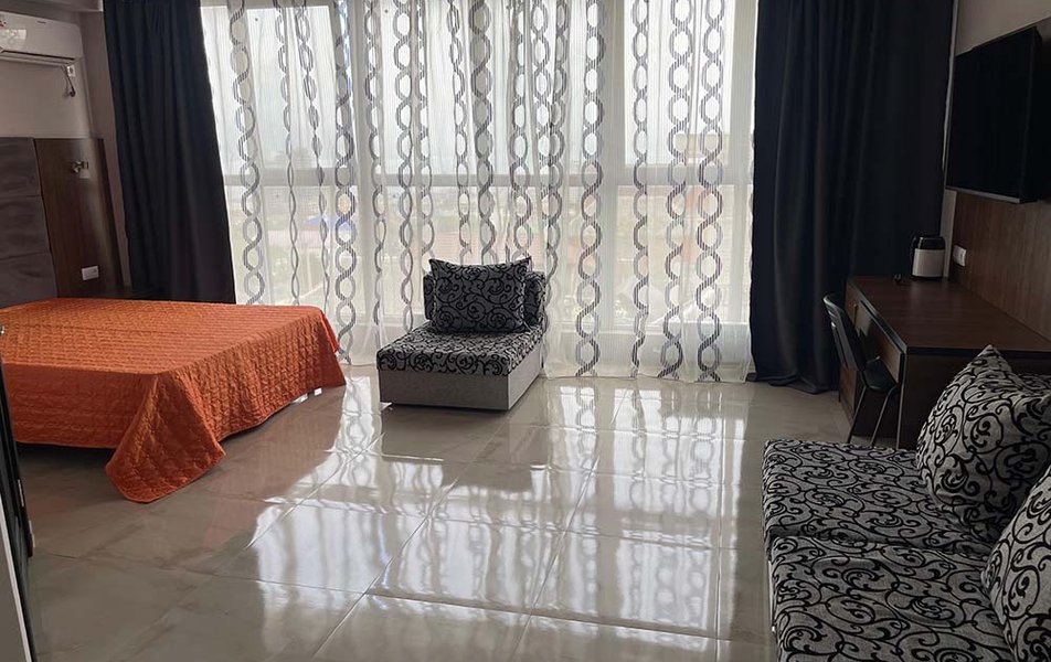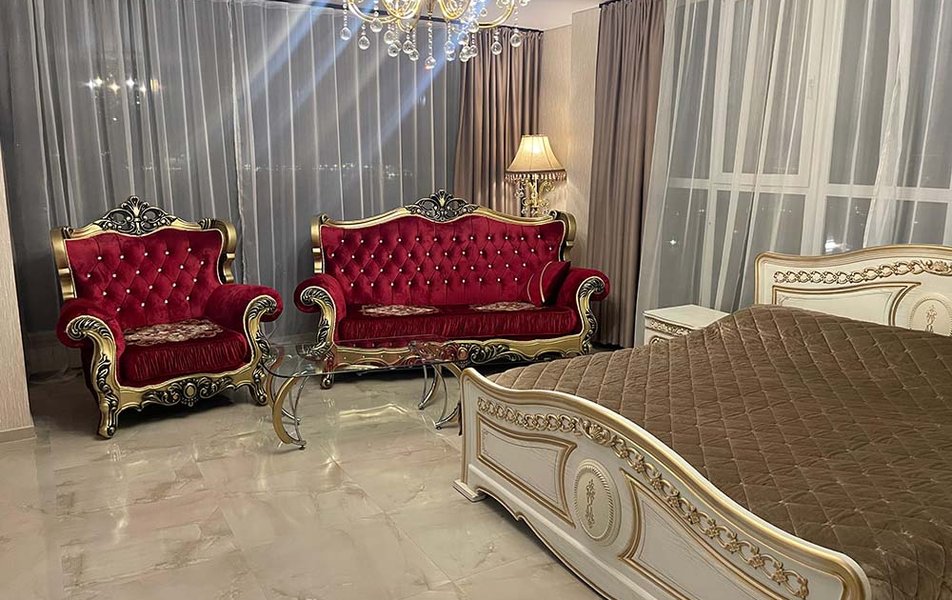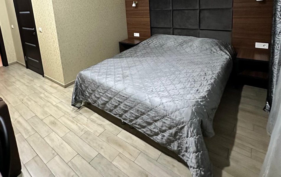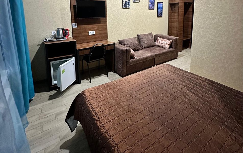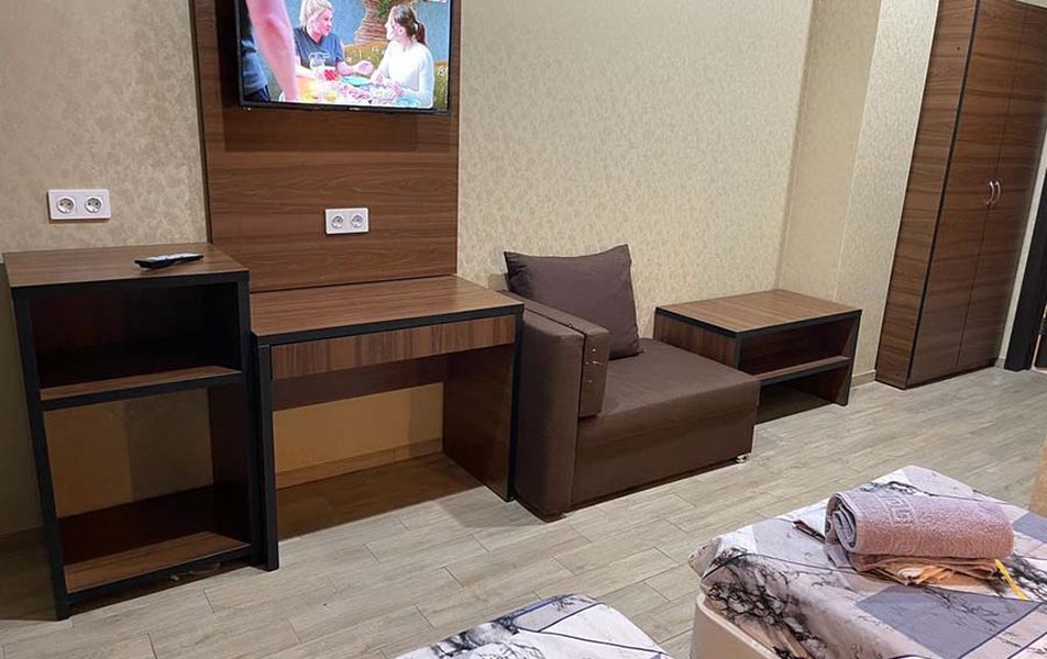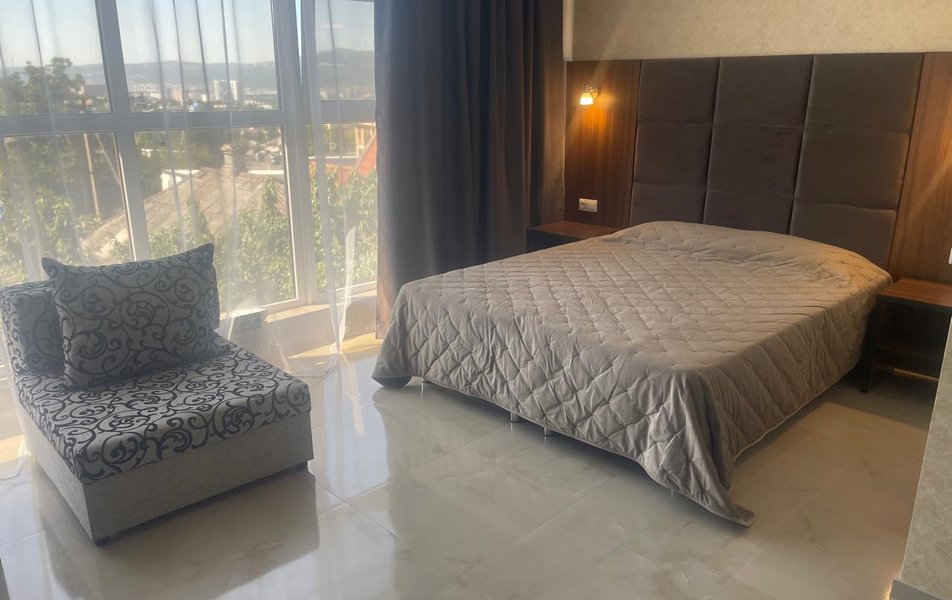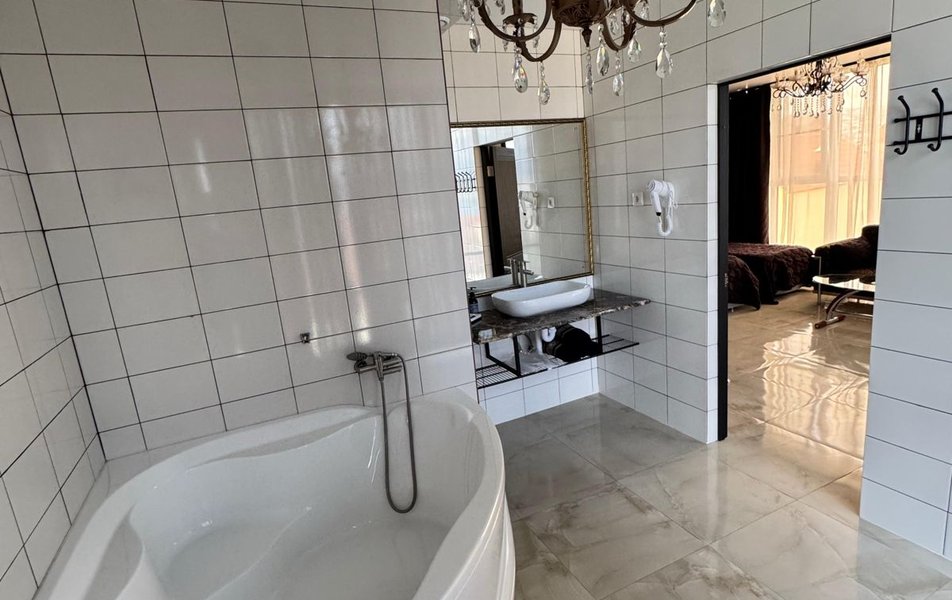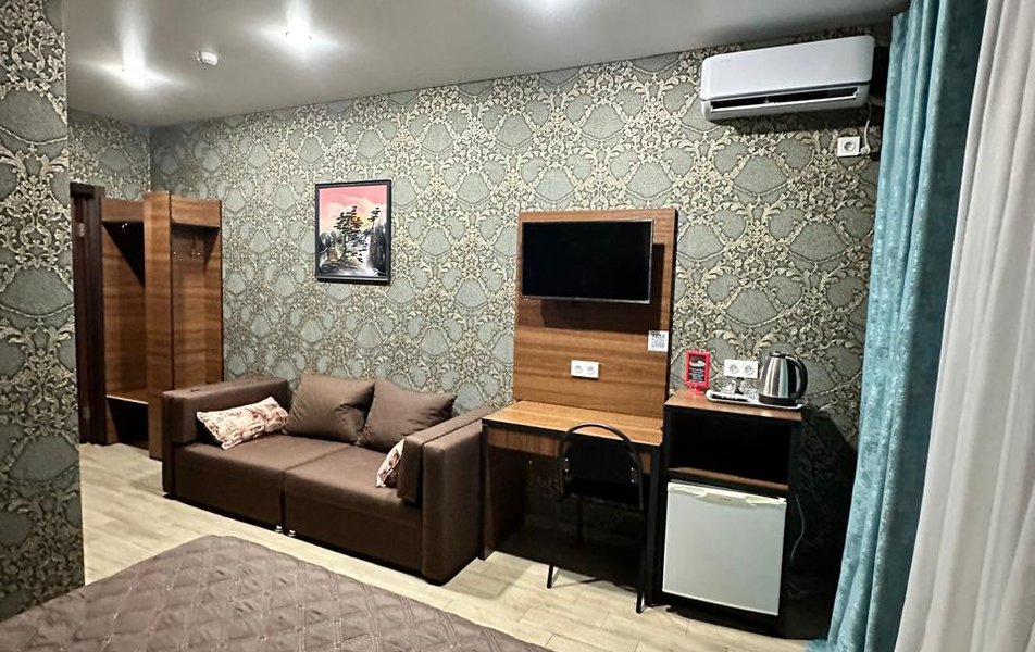Люкс 2-местный (вид на море) Количество комнат: 1-комнатный Тип номера: Люкс Вид из номера: на море Кол-во основных мест: 2 Мебель: вешалка, зеркало, кровать двуспальная, набор мягкой мебели, стол, шкаф Оборудование: сплит-система, телевизор ЖК, холодильник, чайная станция Санузел: с ванной, тапочки, туалетные принадлежности, фен, халат Сервис: Wi-Fi бесплатно, смена полотенец, смена постельного белья, уборка номера