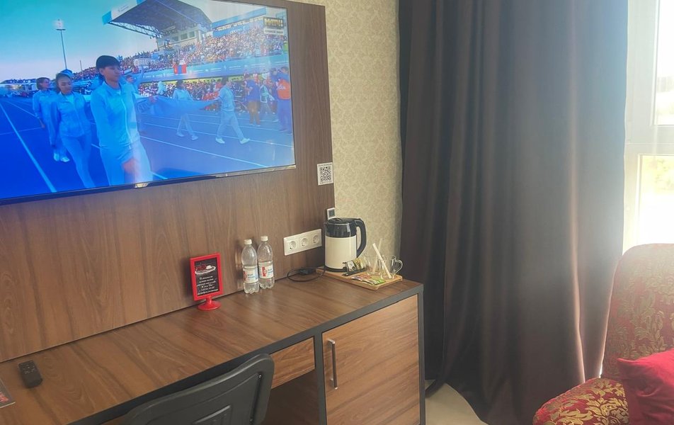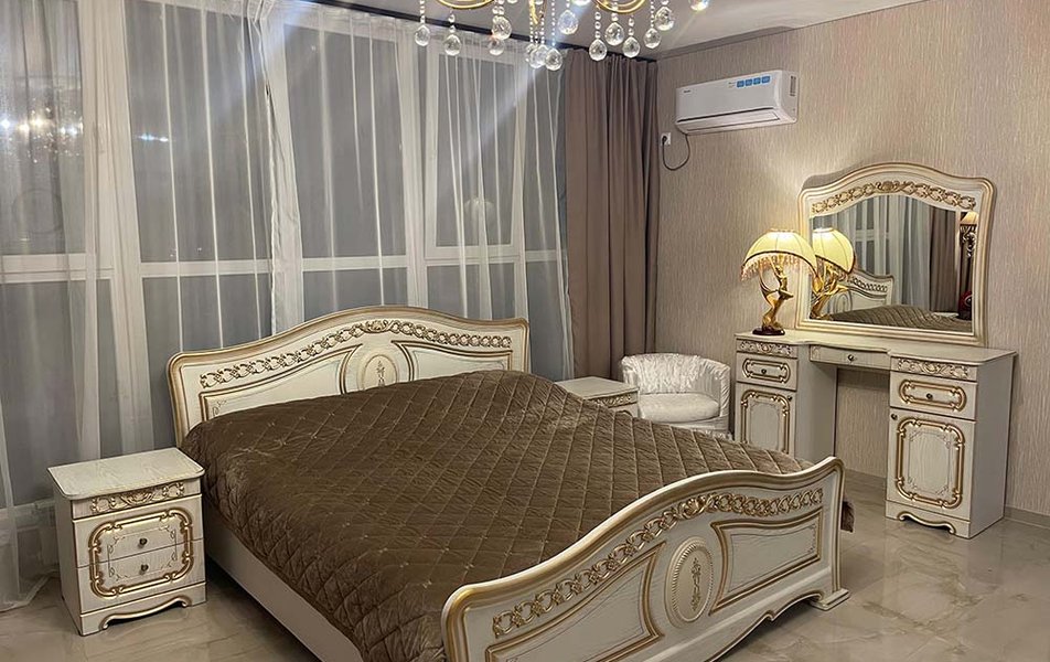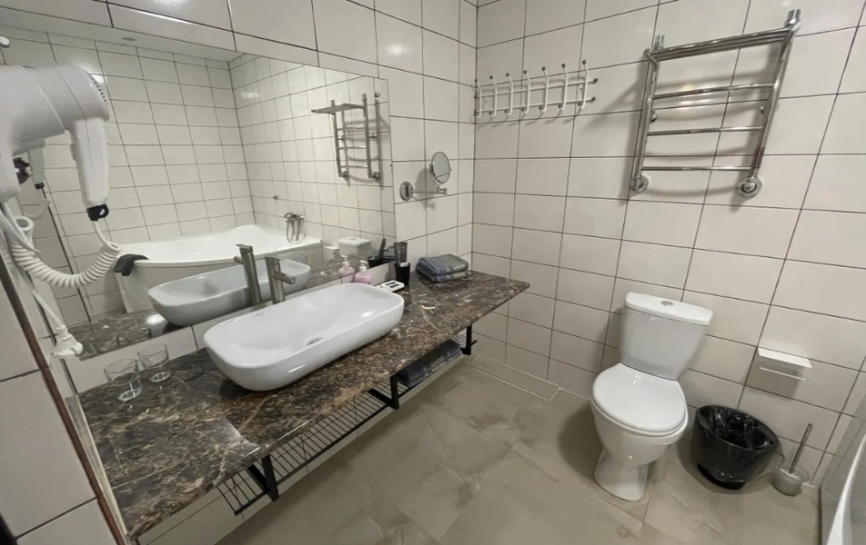 Люкс 2-местный (вид на бухту) Количество комнат: 1-комнатный Тип номера: Люкс Кол-во основных мест: 2 Мебель: вешалка, зеркало, кровать двуспальная, набор мягкой мебели, прикроватные тумбочки, столик туалетный, шкаф Оборудование: набор посуды, сплит-система, телевизор ЖК, холодильник, чайная станция Санузел: с ванной, тапочки, туалетные принадлежности, фен, халат Сервис: Wi-Fi бесплатно, смена полотенец, смена постельного белья, уборка номера
