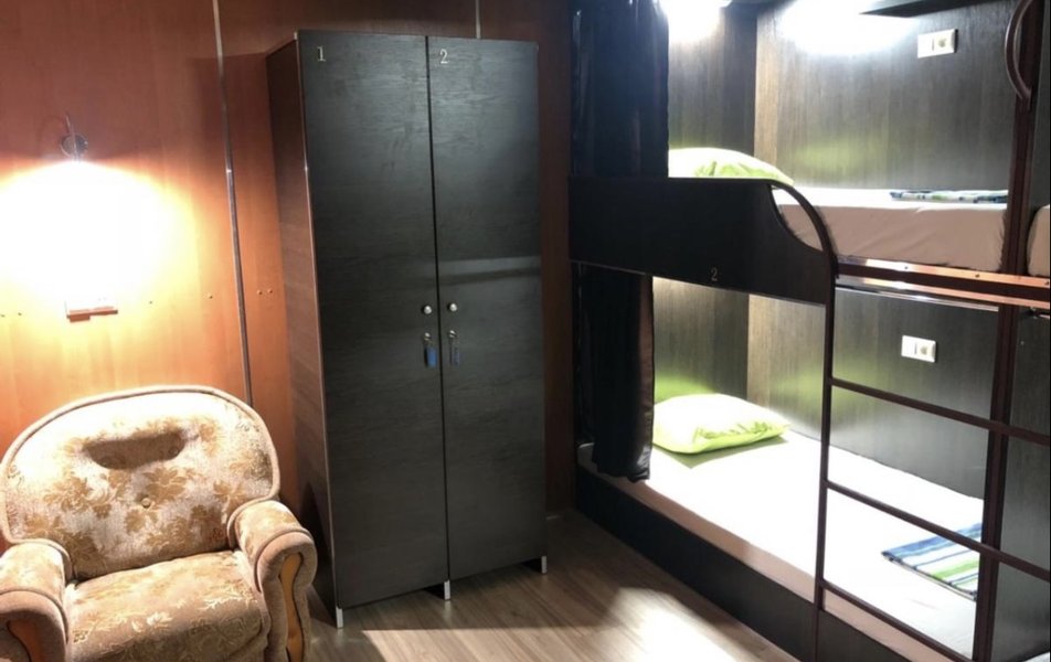 Койко-место в номере Количество комнат: 1-комнатный Тип номера: Койко-место Кол-во основных мест: 1 Мебель: кровати односпальные: 4, первый или второй ярус, шкафчик с ключом Оборудование: кондиционер Сервис: Wi-Fi бесплатно, смена полотенец, смена постельного белья, уборка номера