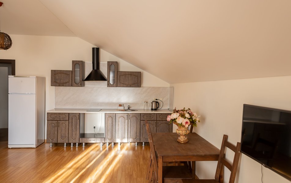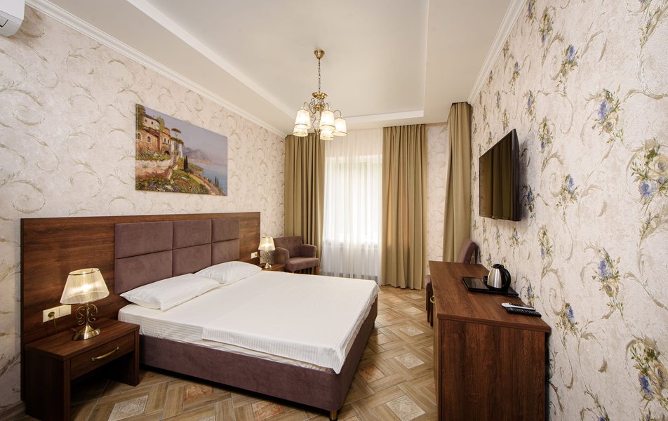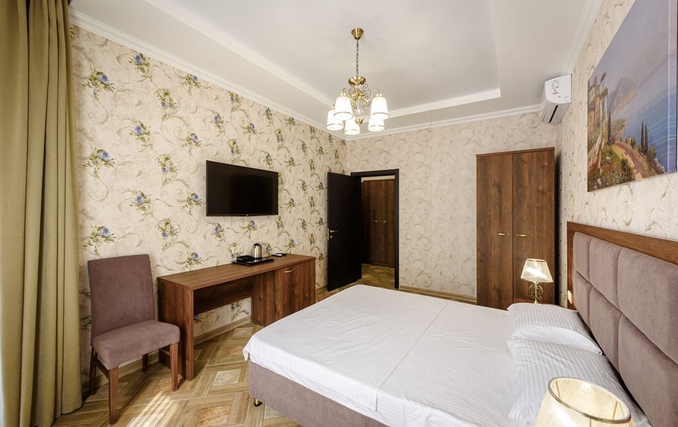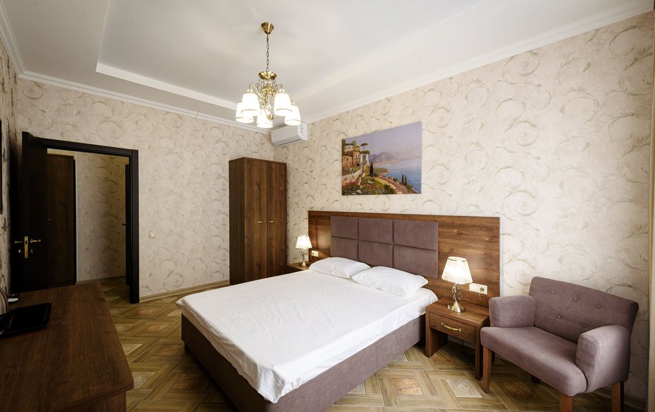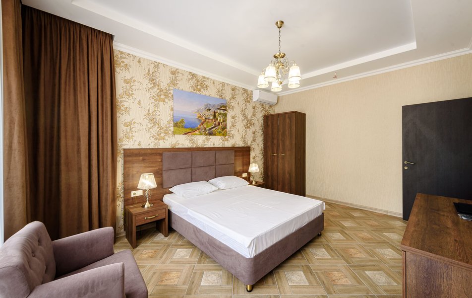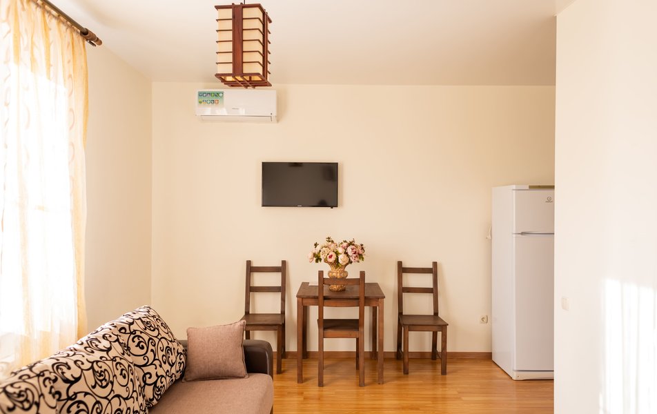 Полулюкс 2-местный (с кухней и балконом, вид на двор, 1 этаж) Количество комнат: 1-комнатный Тип номера: Полулюкс Вид из номера: на двор Кол-во основных мест: 2 Площадь (кв. м): 35 Этаж: 1 Мебель: вешалка, зеркало, кровать двуспальная, прикроватные тумбочки, стол, стулья, шкаф Оборудование: кондиционер, набор посуды, стиральная машина, телевизор ЖК, холодильник, электрочайник Санузел: с душем, тапочки, туалетные принадлежности, фен Сервис: Wi-Fi бесплатно, мини-бар, смена полотенец, смена постельного белья, уборка номера