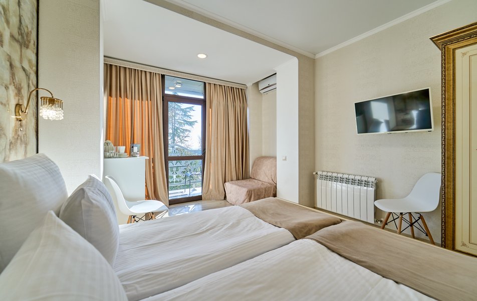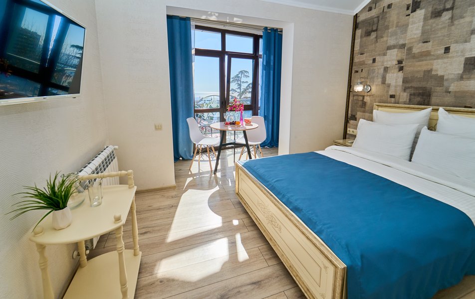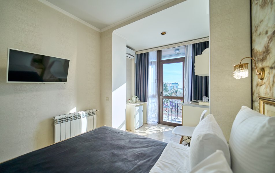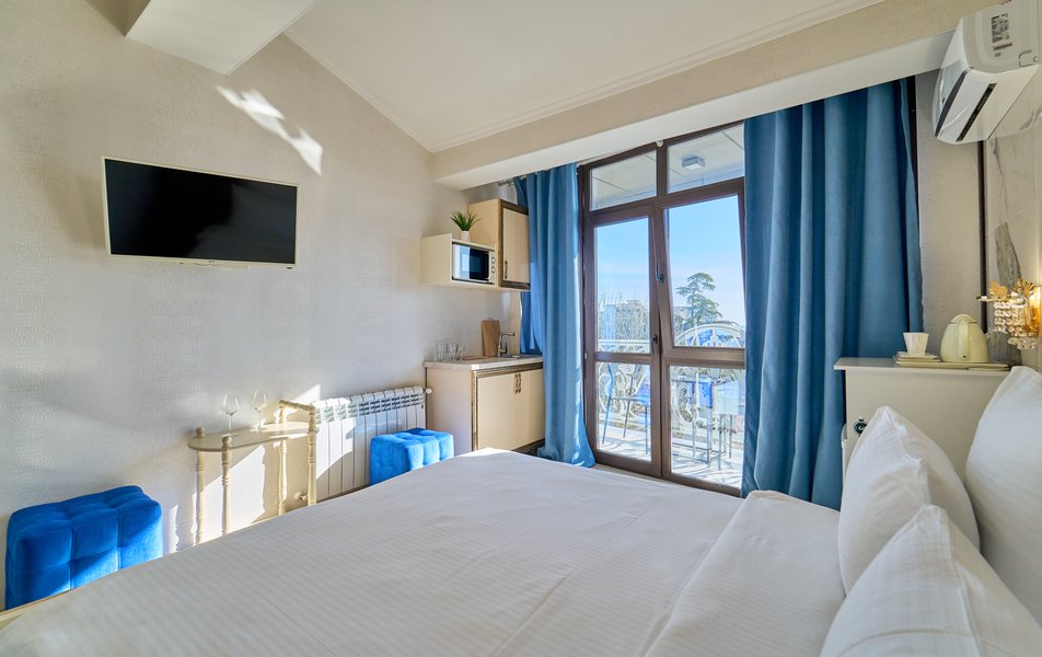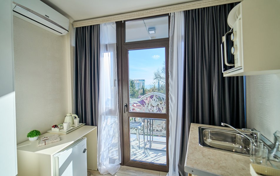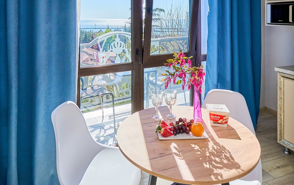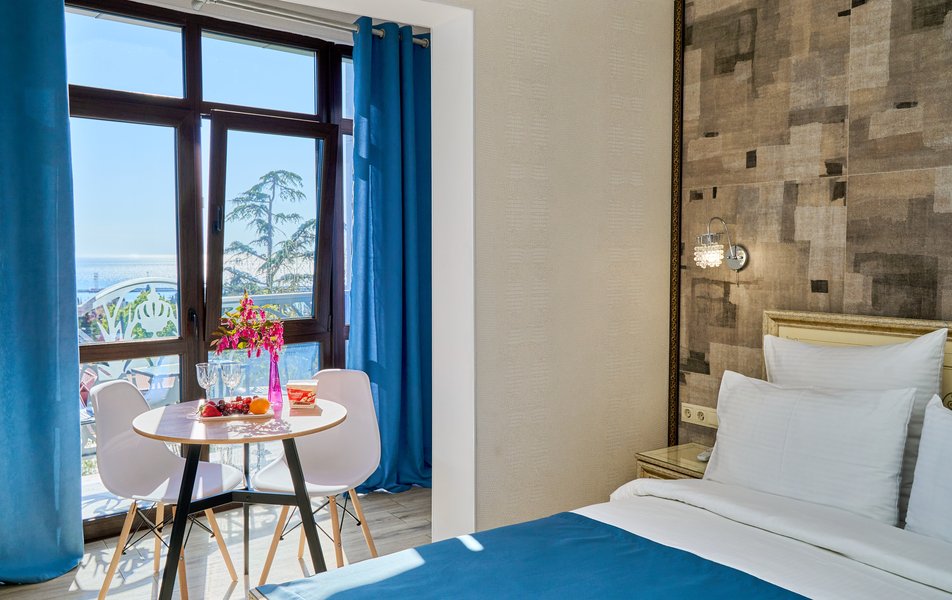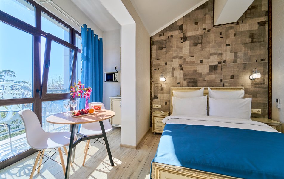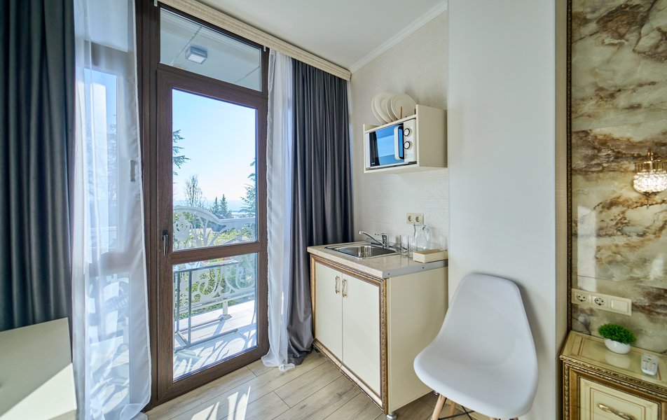 Комфорт Панорамный 2-местный Количество комнат: 1-комнатный Тип номера: Комфорт Дополнительное место: кресло-кровать Вид из номера: на море: и горы Кол-во номеров: 4 Кол-во основных мест: 3 Площадь (кв. м): 22 Балкон: с мебелью Мебель: кресло, кровати односпальные, прикроватные тумбочки, стол, шкаф Оборудование: кондиционер, мини-холодильник, сейф, телевизор ЖК, чайник, чайный набор посуды Санузел: с душем, туалетные принадлежности, фен Сервис: Wi-Fi бесплатно, room-сервис: 24 часа, смена полотенец: ежедневно, смена постельного белья: 1 раз в 3 дня, уборка номера: ежедневно