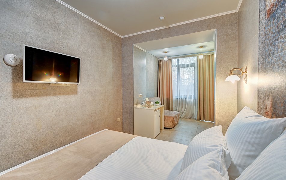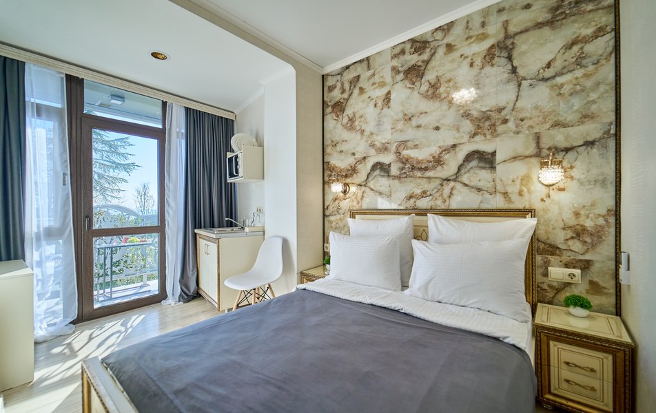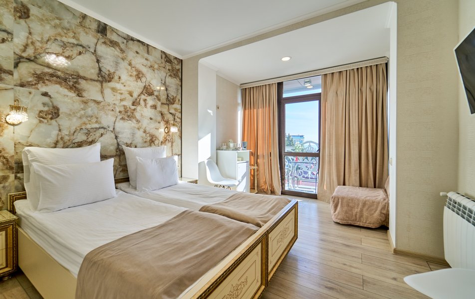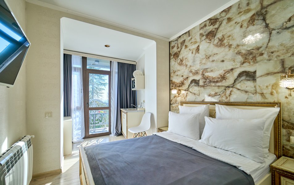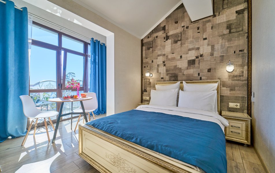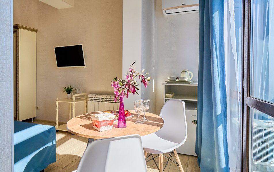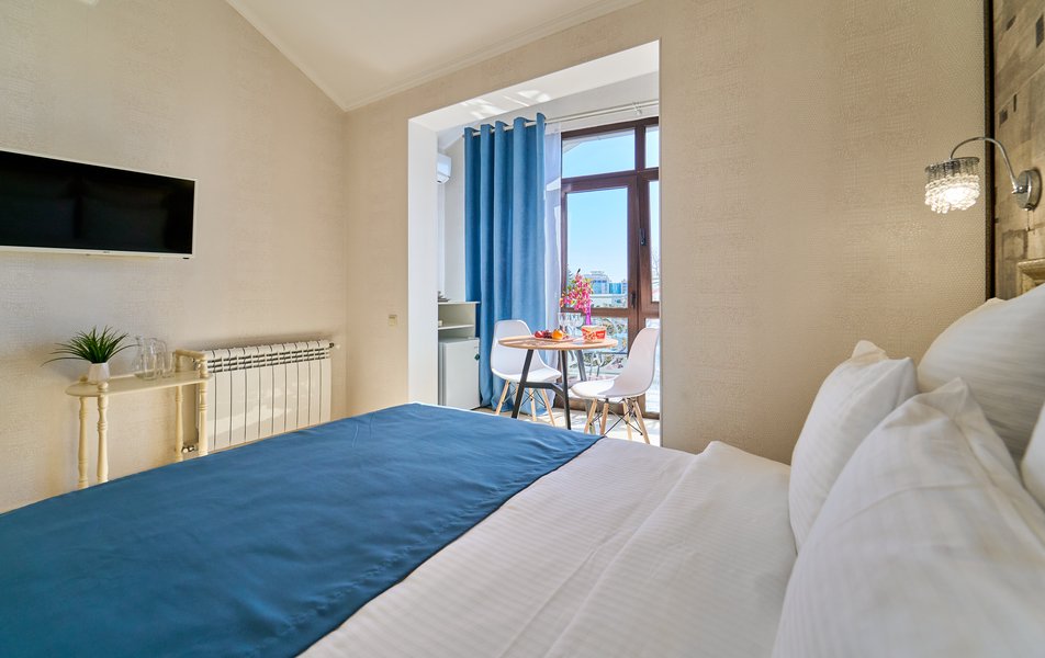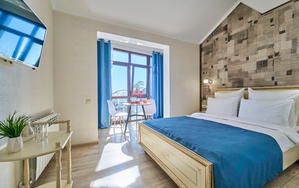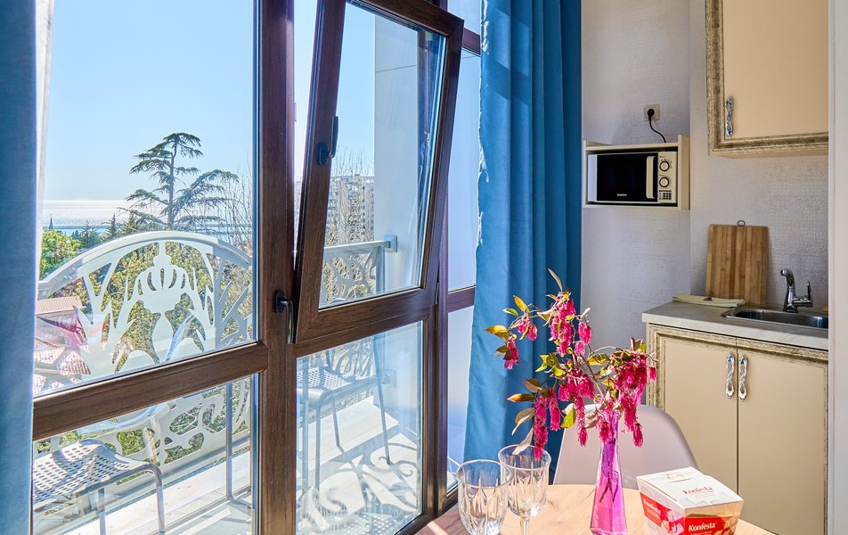 Комфорт Панорамный 2-местный Количество комнат: 1-комнатный Тип номера: Комфорт Дополнительное место: кресло-кровать Вид из номера: на море: и горы Кол-во номеров: 4 Кол-во основных мест: 3 Площадь (кв. м): 22 Балкон: с мебелью Мебель: кресло, кровати односпальные, прикроватные тумбочки, стол, шкаф Оборудование: кондиционер, мини-холодильник, сейф, телевизор ЖК, чайник, чайный набор посуды Санузел: с душем, туалетные принадлежности, фен Сервис: Wi-Fi бесплатно, room-сервис: 24 часа, смена полотенец: ежедневно, смена постельного белья: 1 раз в 3 дня, уборка номера: ежедневно
