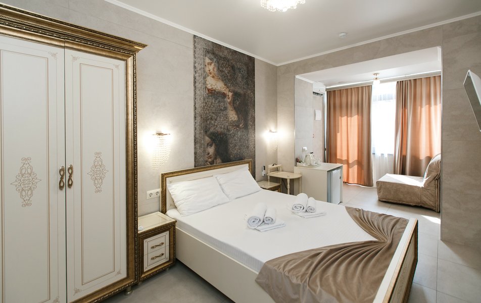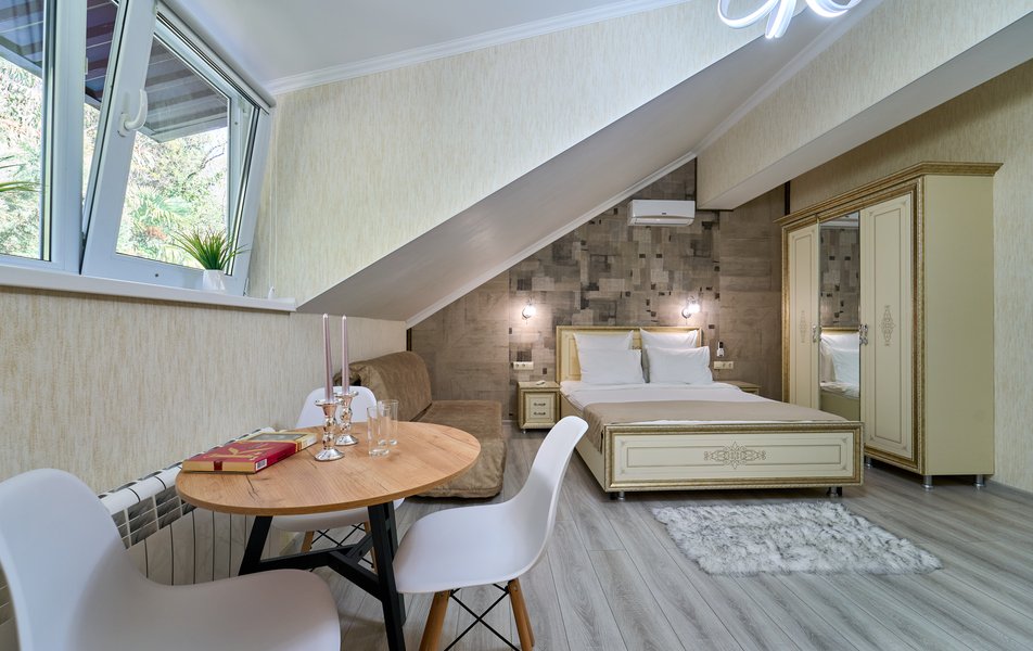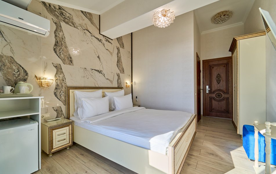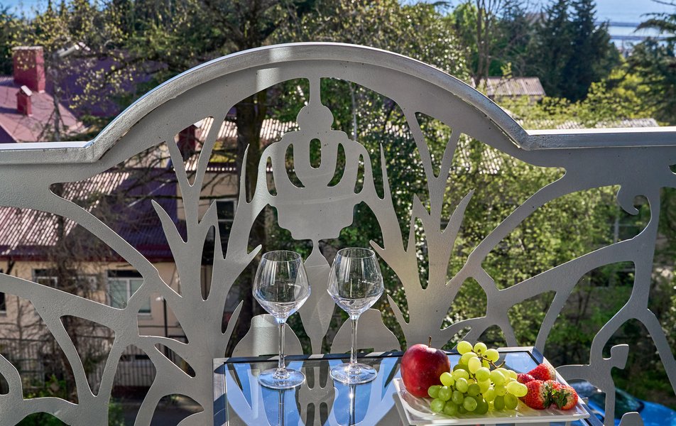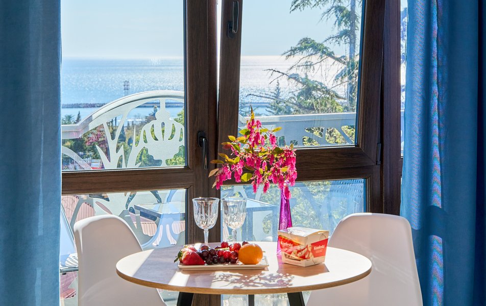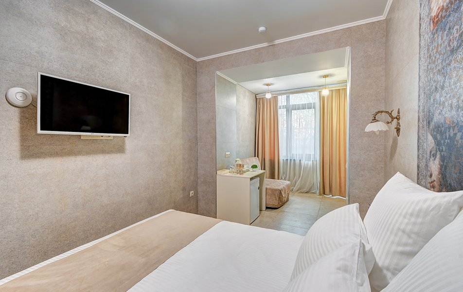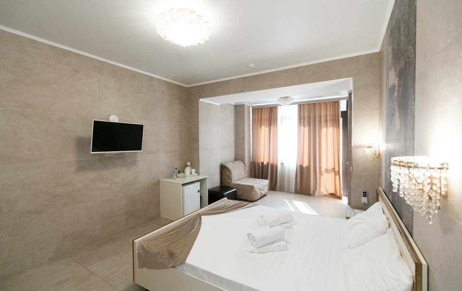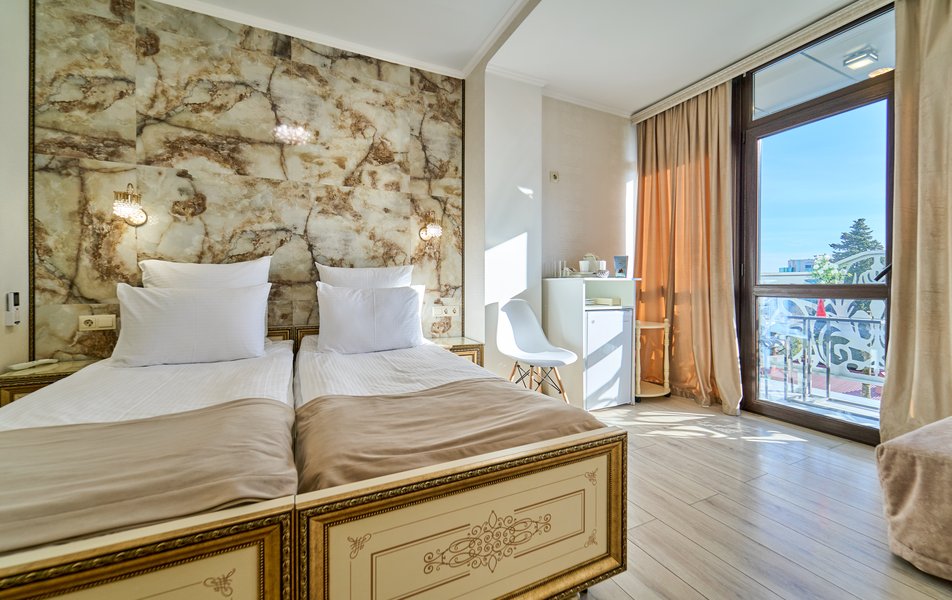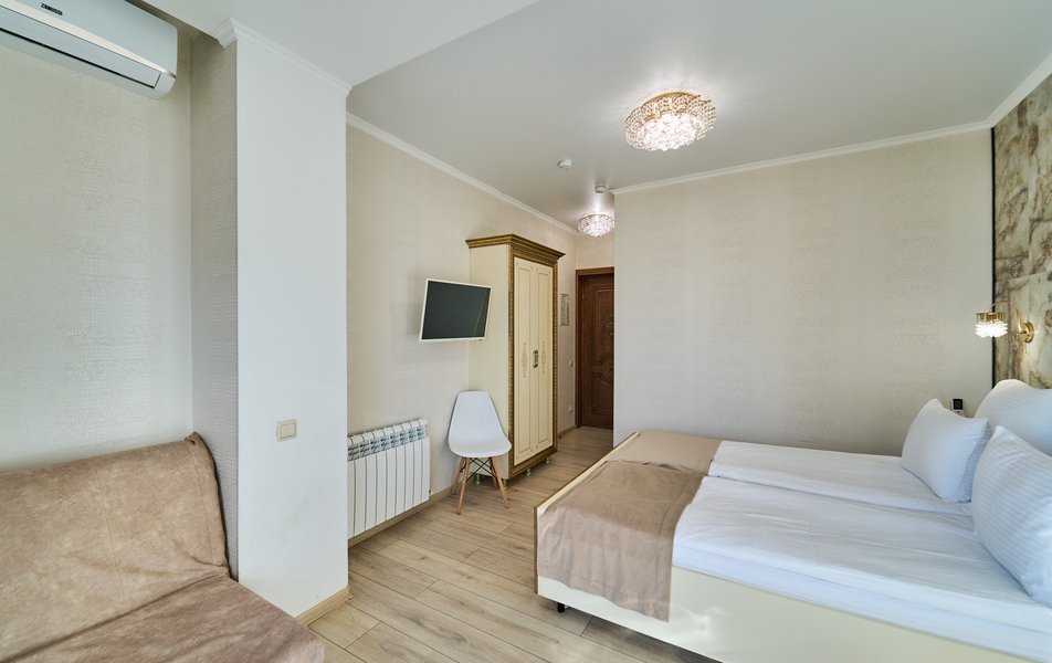 Комфорт Панорамный 2-местный Количество комнат: 1-комнатный Тип номера: Комфорт Дополнительное место: кресло-кровать Вид из номера: на море: и горы Кол-во номеров: 4 Кол-во основных мест: 3 Площадь (кв. м): 22 Балкон: с мебелью Мебель: кресло, кровати односпальные, прикроватные тумбочки, стол, шкаф Оборудование: кондиционер, мини-холодильник, сейф, телевизор ЖК, чайник, чайный набор посуды Санузел: с душем, туалетные принадлежности, фен Сервис: Wi-Fi бесплатно, room-сервис: 24 часа, смена полотенец: ежедневно, смена постельного белья: 1 раз в 3 дня, уборка номера: ежедневно