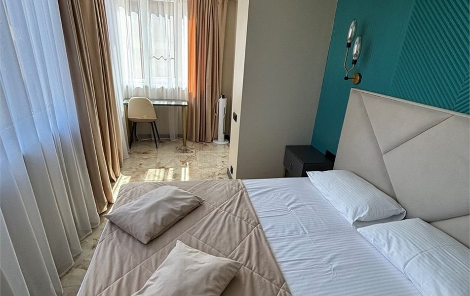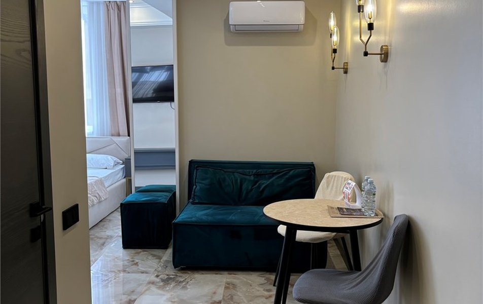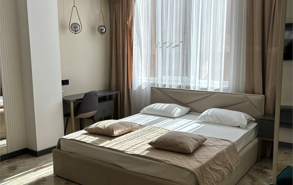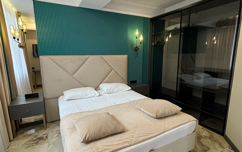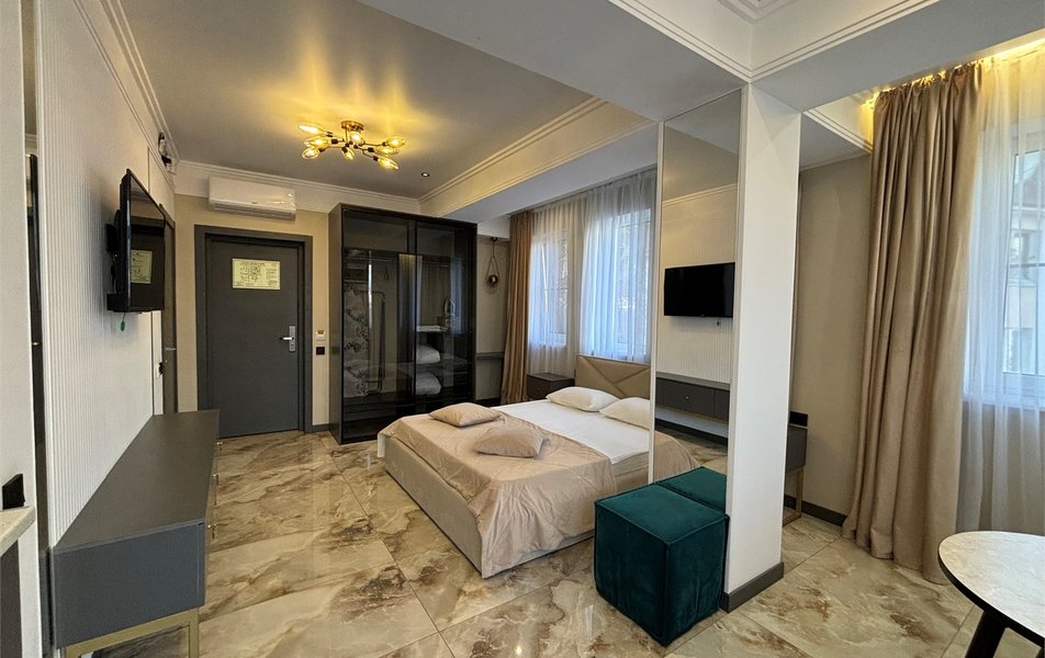 Делюкс 2-местный 2-комнатный Количество комнат: 2-комнатный Тип номера: Люкс Дополнительное место: диван-кровать Кол-во доп. мест: 2 Кол-во номеров: 4 Кол-во основных мест: 2 Площадь (кв. м): 40 Мебель: вешалка, диван, зеркало, кровать двуспальная, прикроватные тумбочки, стол, стулья, шкаф-купе Оборудование: кондиционер, набор посуды, плита электрическая, стиральная машина, телевизор ЖК, холодильник, электрочайник Санузел: с душем, туалетные принадлежности, фен Сервис: Wi-Fi бесплатно, room-сервис, смена полотенец, смена постельного белья, уборка номера