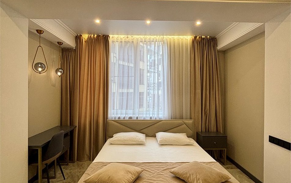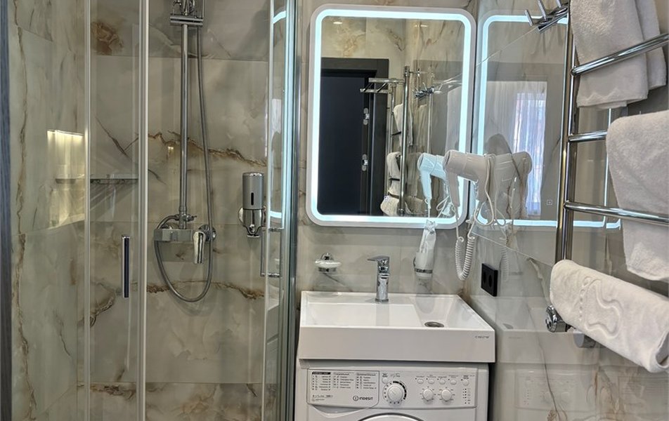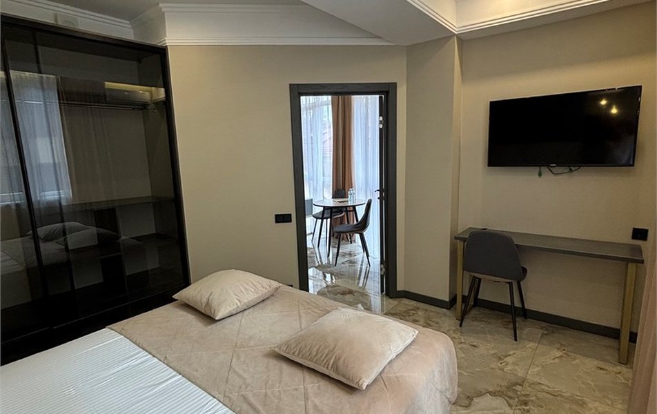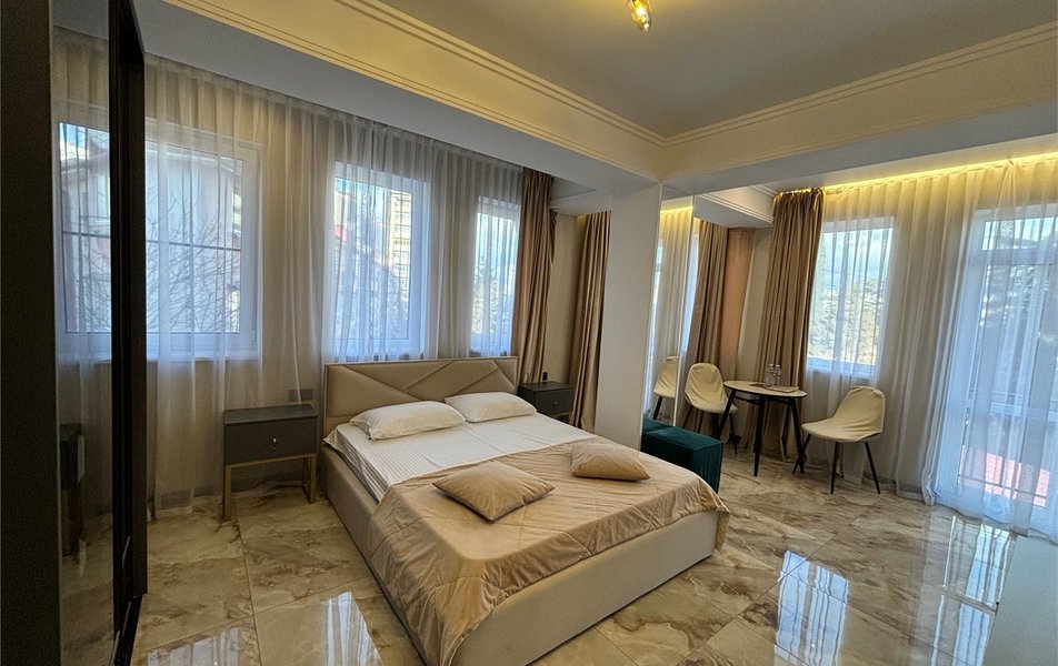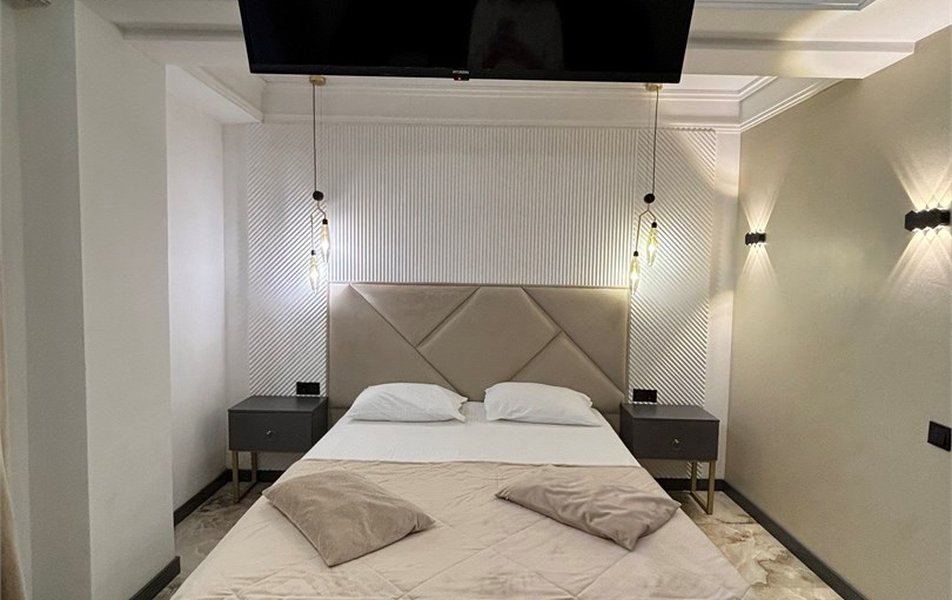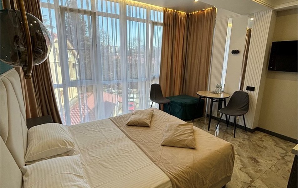 Делюкс 2-местный 2-комнатный Количество комнат: 2-комнатный Тип номера: Люкс Дополнительное место: диван-кровать Кол-во доп. мест: 2 Кол-во номеров: 4 Кол-во основных мест: 2 Площадь (кв. м): 40 Мебель: вешалка, диван, зеркало, кровать двуспальная, прикроватные тумбочки, стол, стулья, шкаф-купе Оборудование: кондиционер, набор посуды, плита электрическая, стиральная машина, телевизор ЖК, холодильник, электрочайник Санузел: с душем, туалетные принадлежности, фен Сервис: Wi-Fi бесплатно, room-сервис, смена полотенец, смена постельного белья, уборка номера