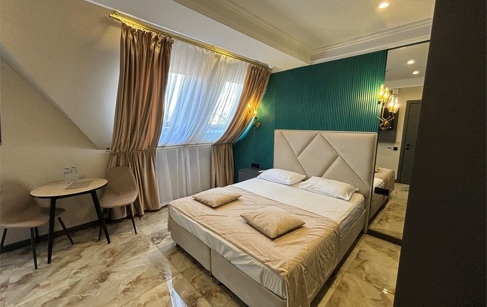Делюкс 2-местный 1-комнатный Количество комнат: 1-комнатный Тип номера: Люкс Кол-во номеров: 9 Кол-во основных мест: 2 Площадь (кв. м): 20 Мебель: вешалка, зеркало, кровать двуспальная, прикроватные тумбочки, стол, стулья, шкаф-купе Оборудование: кондиционер, набор посуды, плита электрическая, стиральная машина, телевизор ЖК, холодильник, электрочайник Санузел: с душем, туалетные принадлежности, фен Сервис: Wi-Fi бесплатно, room-сервис, смена полотенец, смена постельного белья, уборка номера