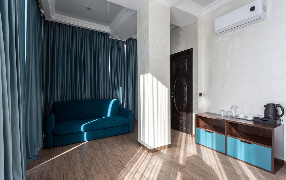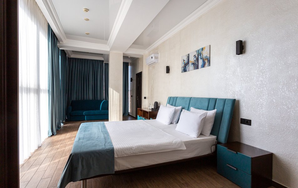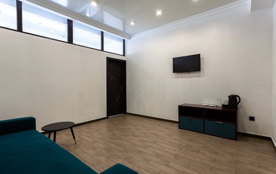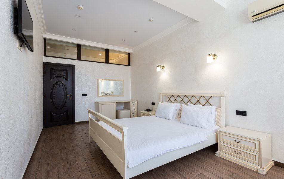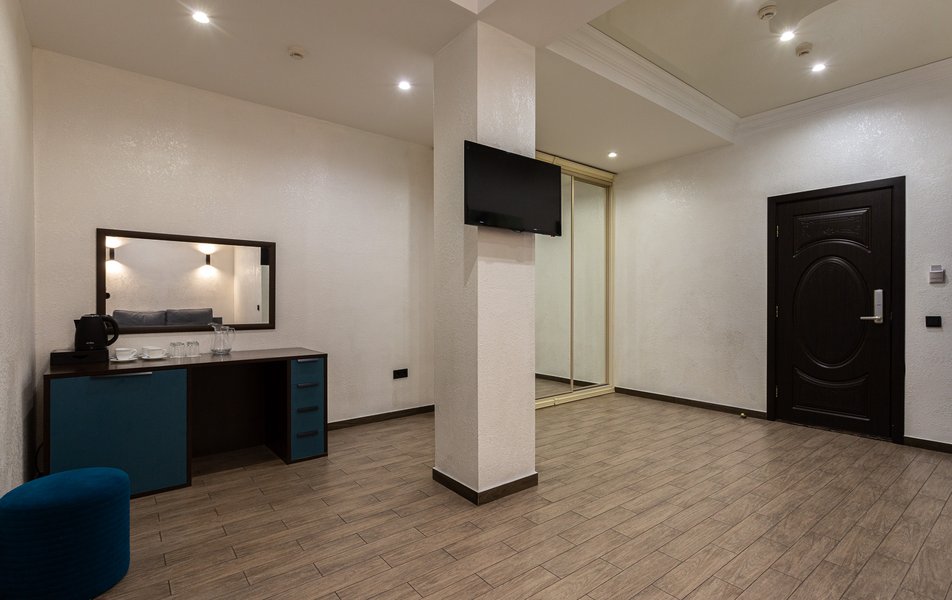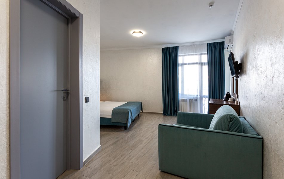 Люкс 2-местный 2-комнатный Количество комнат: 3-комнатный Тип номера: Люкс Вид из номера: на двор Кол-во доп. мест: 2 Кол-во основных мест: 2 Площадь (кв. м): 50 Мебель: диван раскладной, зеркало, кресла, кровать двуспальная, прикроватные тумбочки, пуфик, стол, стул, шкаф Оборудование: кондиционер, мини-холодильник, сейф, телевизор ЖК, чайный набор посуды, электрочайник Санузел: с душевой кабиной, тапочки, туалетные принадлежности, фен, халат Сервис: Wi-Fi бесплатно, смена полотенец, смена постельного белья, уборка номера