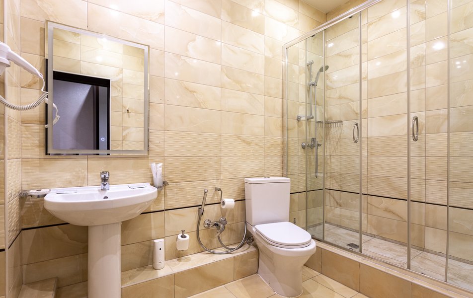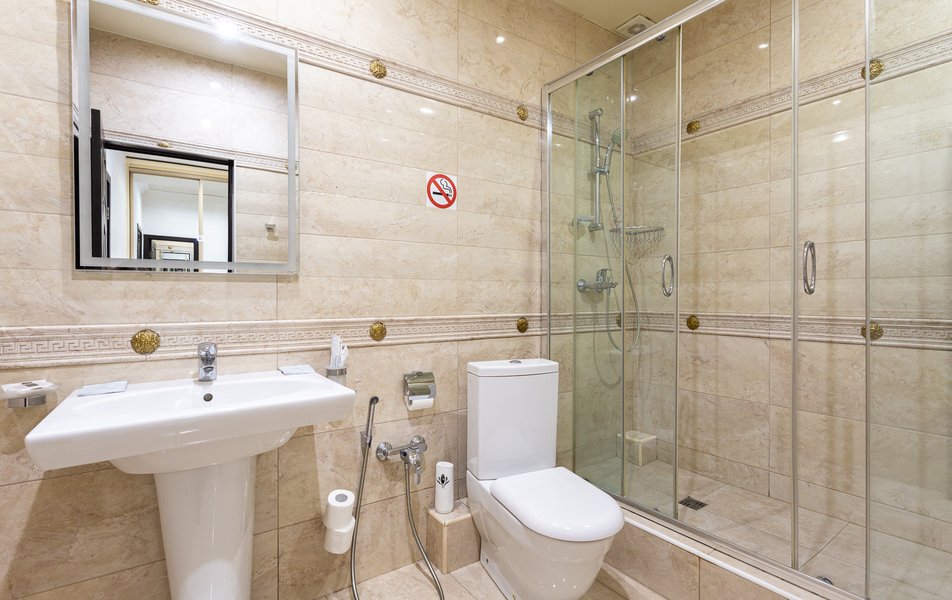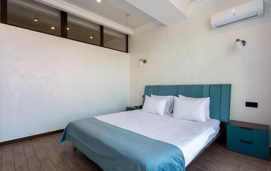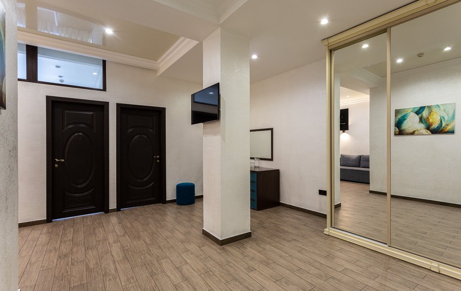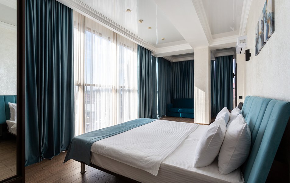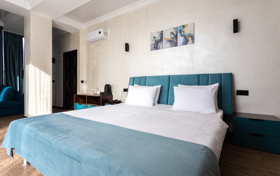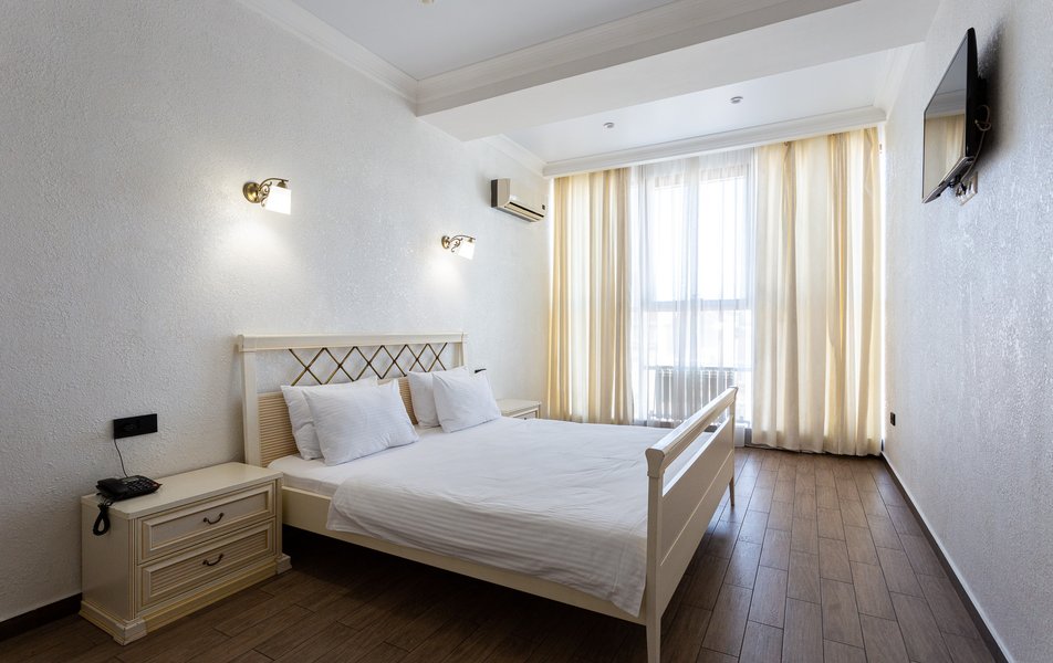 Люкс 2-местный 2-комнатный Количество комнат: 3-комнатный Тип номера: Люкс Вид из номера: на двор Кол-во доп. мест: 2 Кол-во основных мест: 2 Площадь (кв. м): 50 Мебель: диван раскладной, зеркало, кресла, кровать двуспальная, прикроватные тумбочки, пуфик, стол, стул, шкаф Оборудование: кондиционер, мини-холодильник, сейф, телевизор ЖК, чайный набор посуды, электрочайник Санузел: с душевой кабиной, тапочки, туалетные принадлежности, фен, халат Сервис: Wi-Fi бесплатно, смена полотенец, смена постельного белья, уборка номера