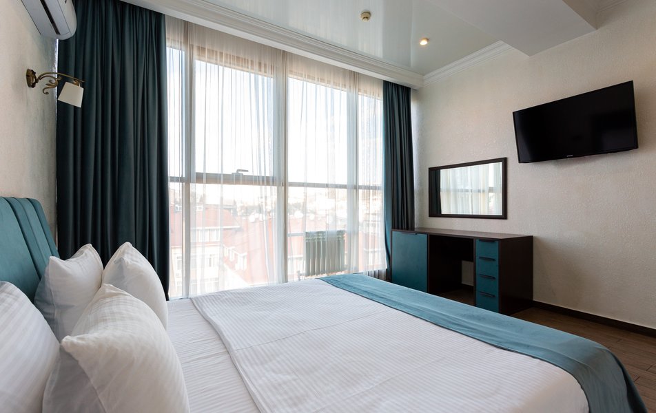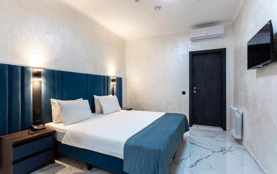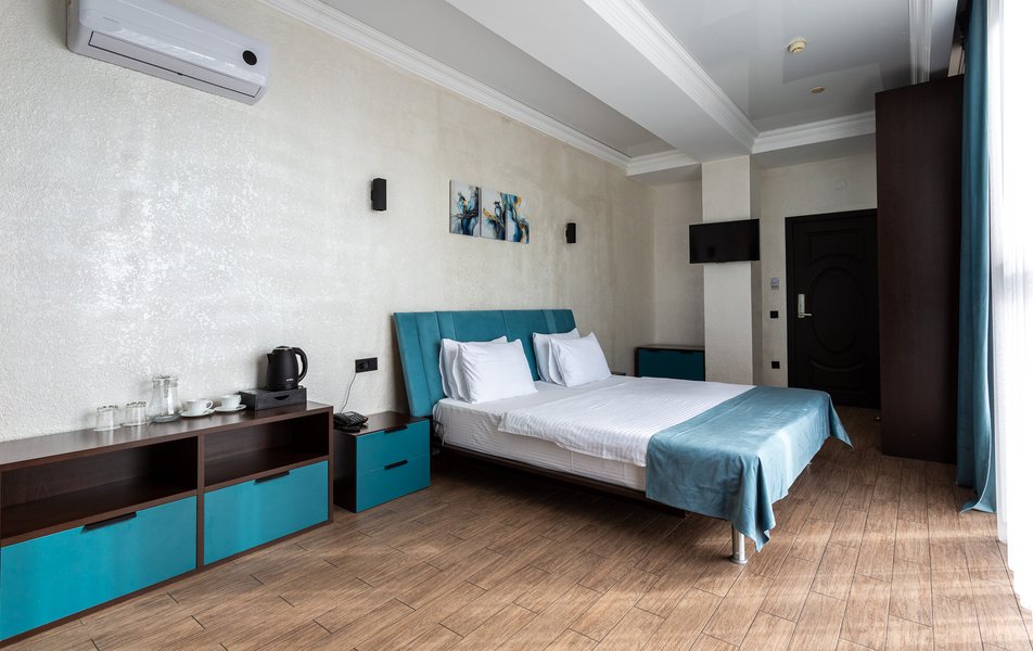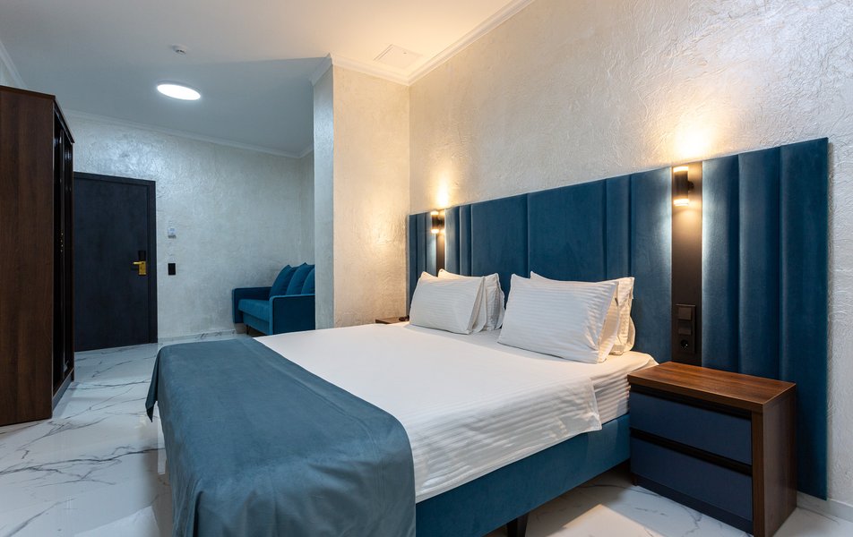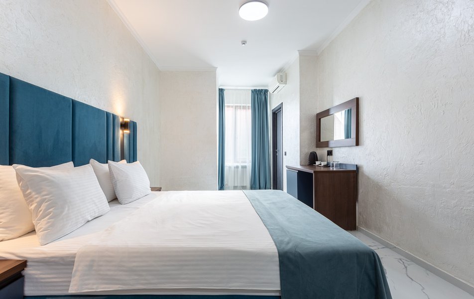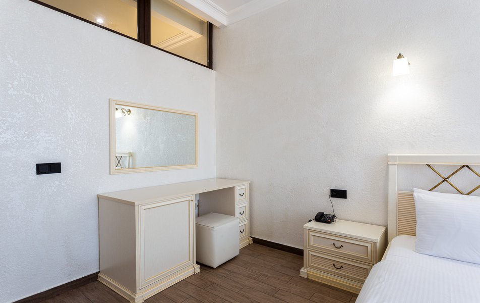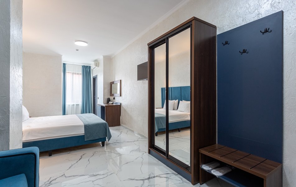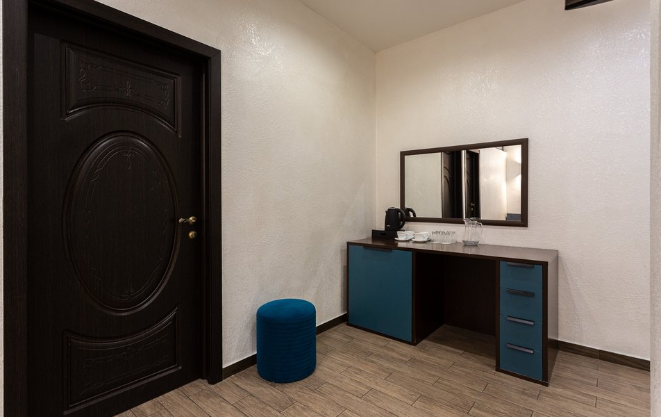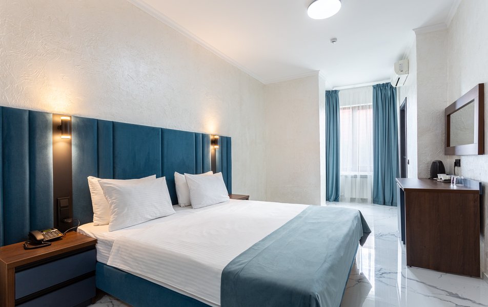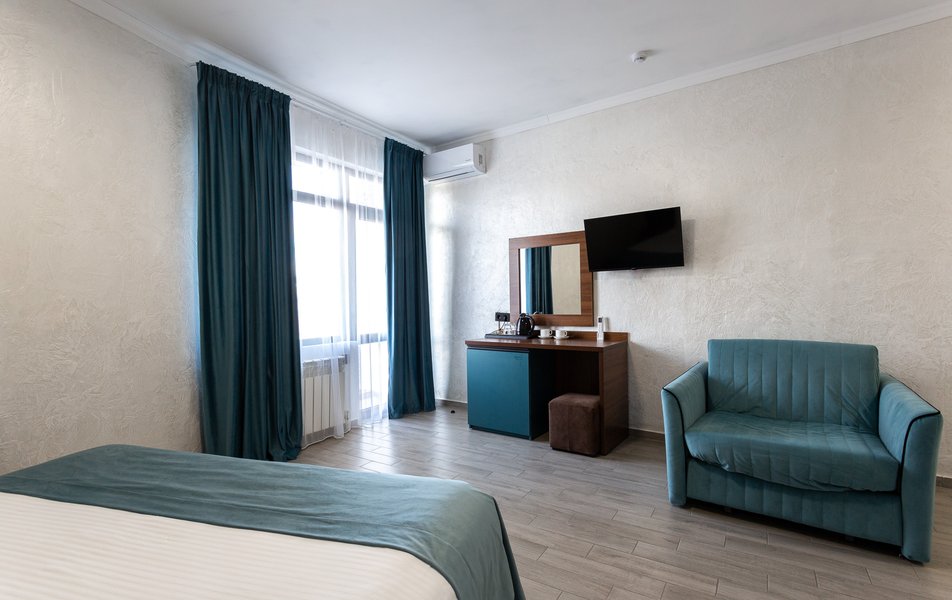 Делюкс 2-местный 1-комнатный Количество комнат: 1-комнатный Тип номера: Делюкс Вид из номера: на двор Кол-во доп. мест: 1 Кол-во основных мест: 2 Площадь (кв. м): 40 Мебель: зеркало, кресло-кровать: или диван, кровать двуспальная, прикроватные тумбочки, пуфик, стол, стул, шкаф-купе Оборудование: кондиционер, мини-холодильник, сейф, телевизор ЖК, чайный набор посуды, электрочайник Санузел: с душевой кабиной, тапочки, туалетные принадлежности, фен Сервис: Wi-Fi бесплатно, смена полотенец, смена постельного белья, уборка номера