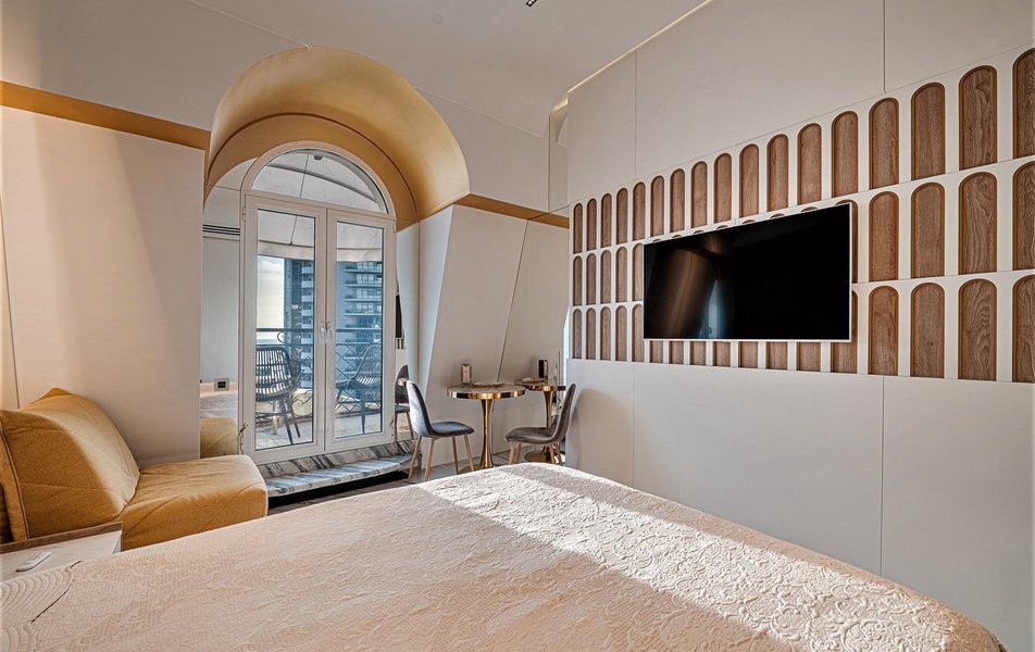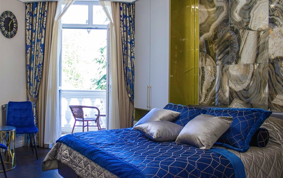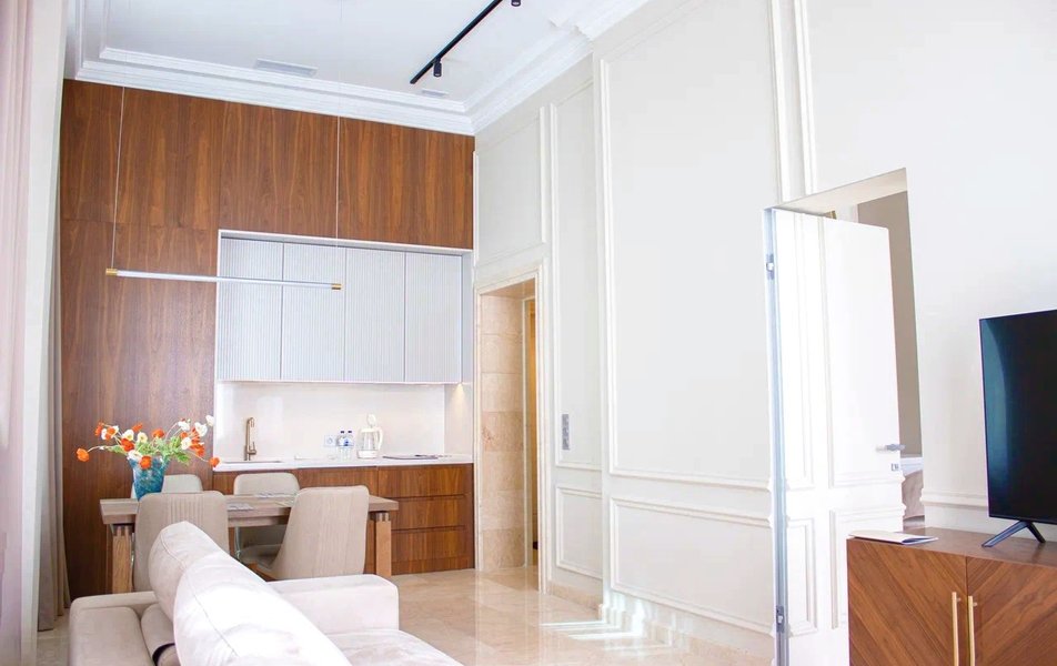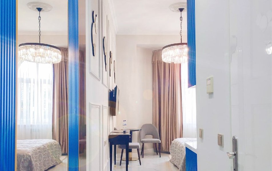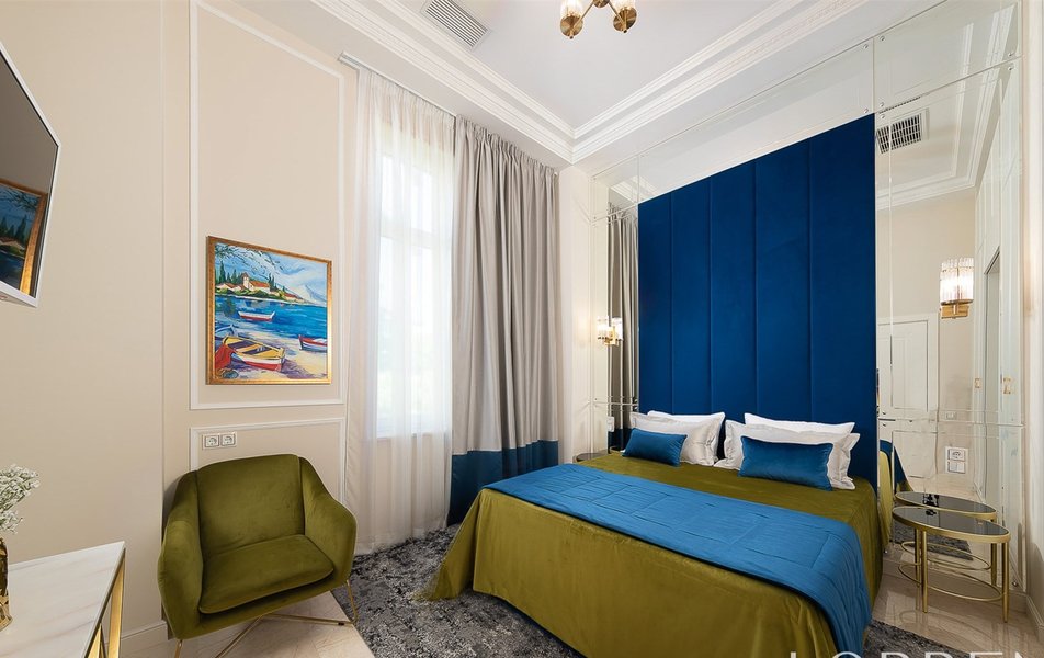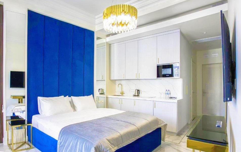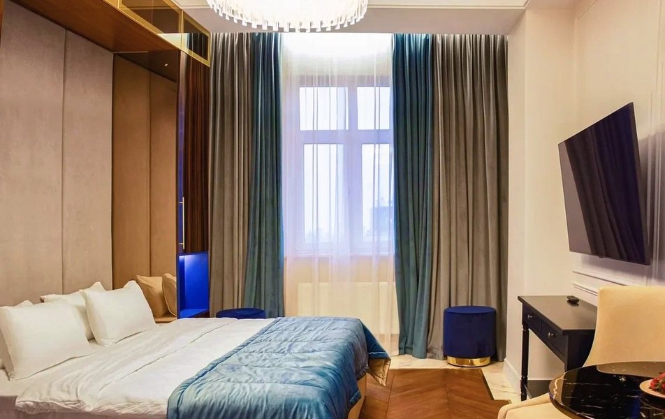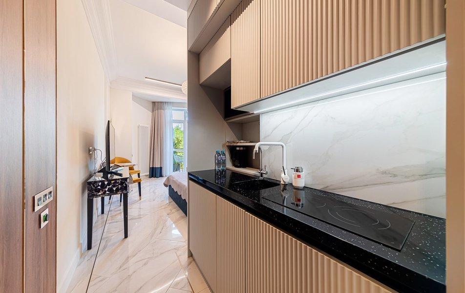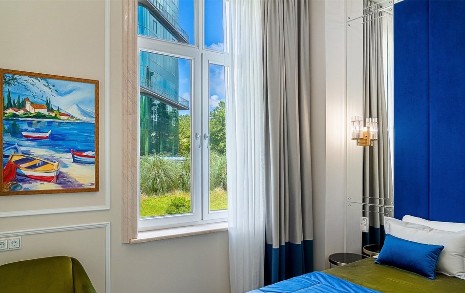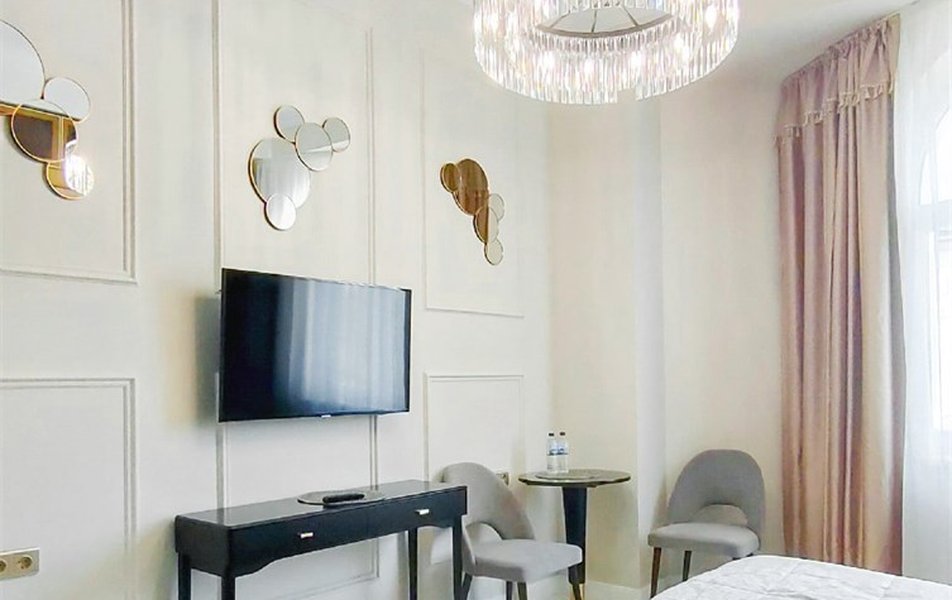 Шестиэтажный корпус отеля расположен в закрытой охраняемой зоне. Постояльцам доступны 15 просторных номеров-апартаментов площадью от 22 до 50 кв.м., выполненных в барочной и классической стилистике. В каждом номере мини-кухня с варочной панелью, система кондиционирования, необходимая бытовая техника, ванная комната с набором косметики.