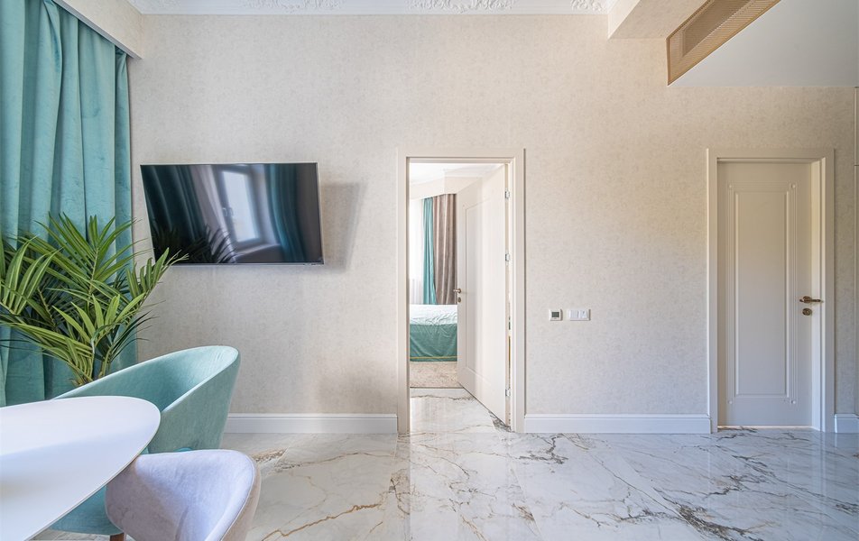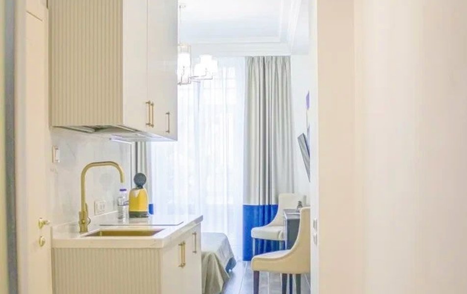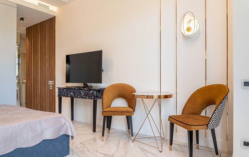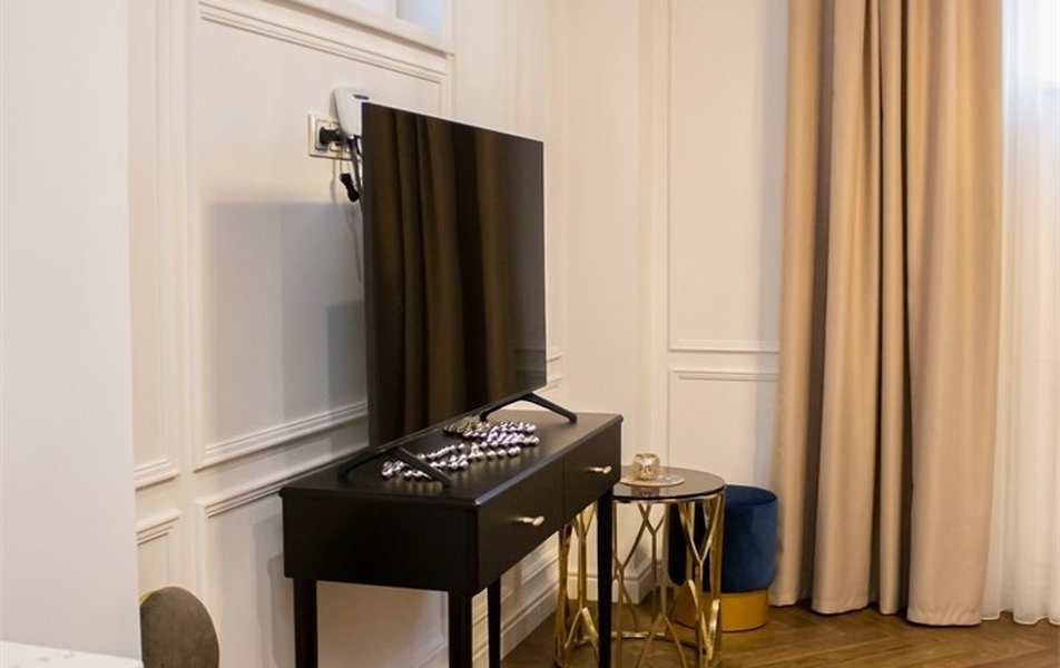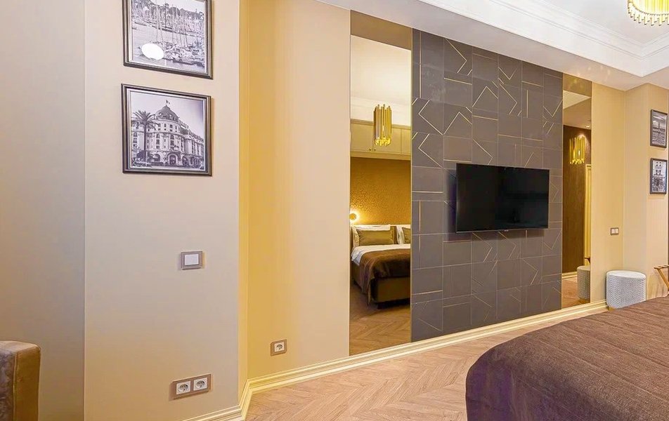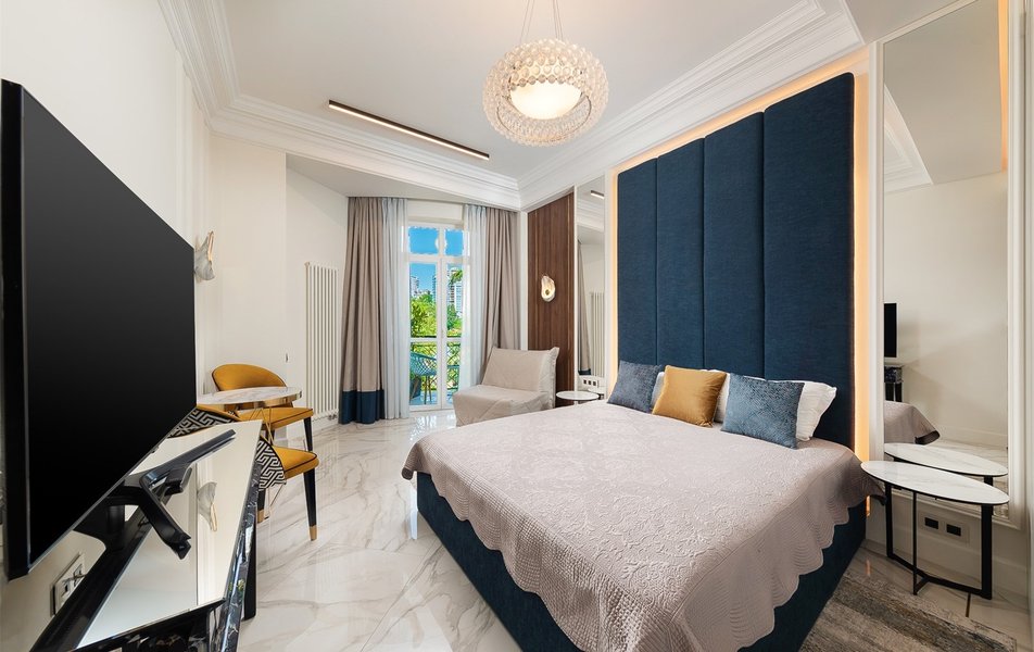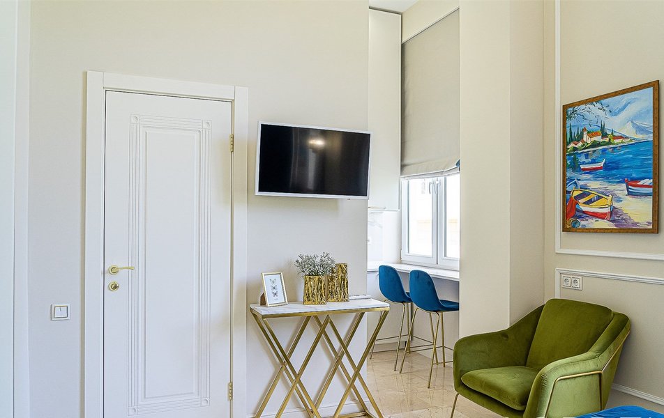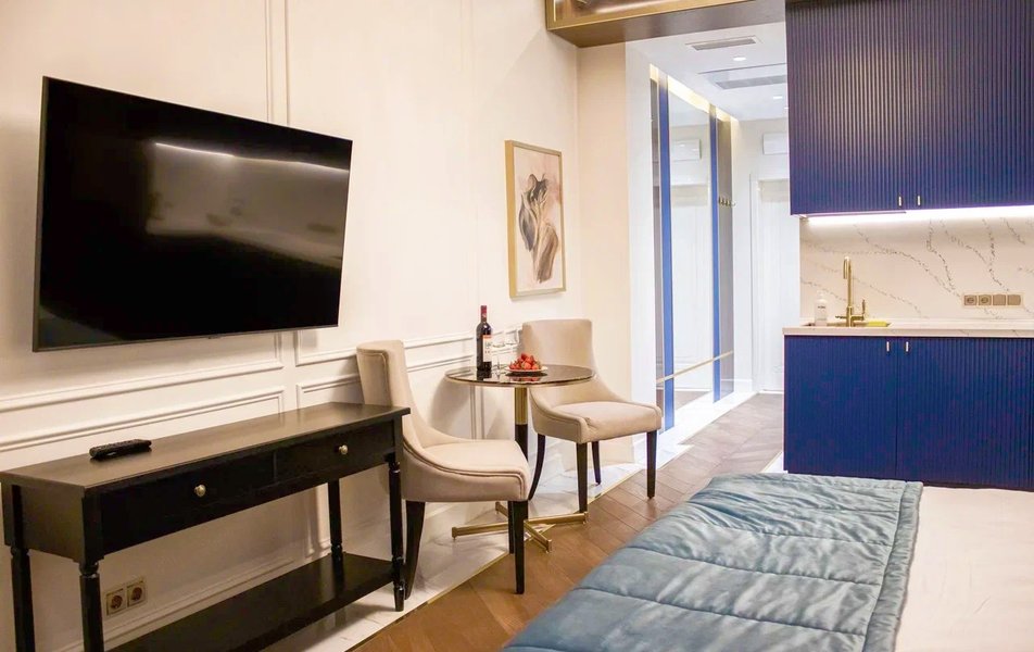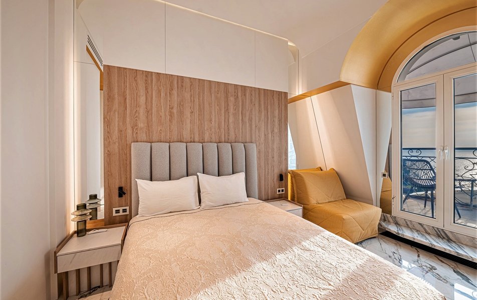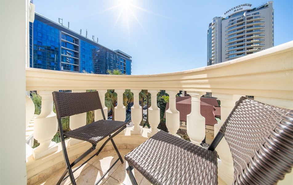 Шестиэтажный корпус отеля расположен в закрытой охраняемой зоне. Постояльцам доступны 15 просторных номеров-апартаментов площадью от 22 до 50 кв.м., выполненных в барочной и классической стилистике. В каждом номере мини-кухня с варочной панелью, система кондиционирования, необходимая бытовая техника, ванная комната с набором косметики.