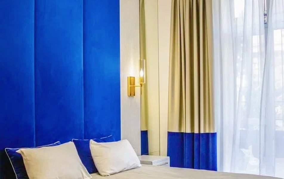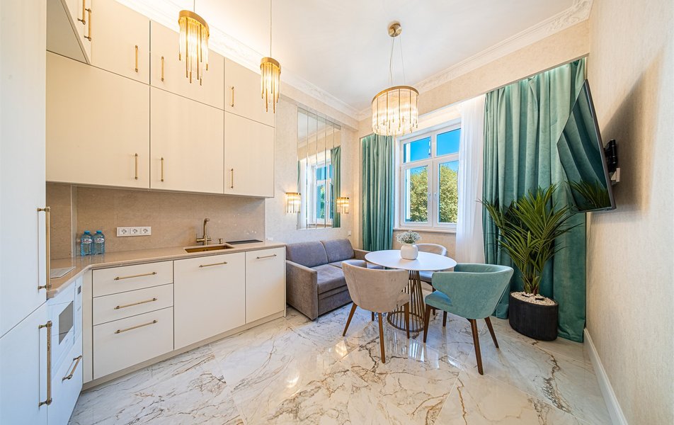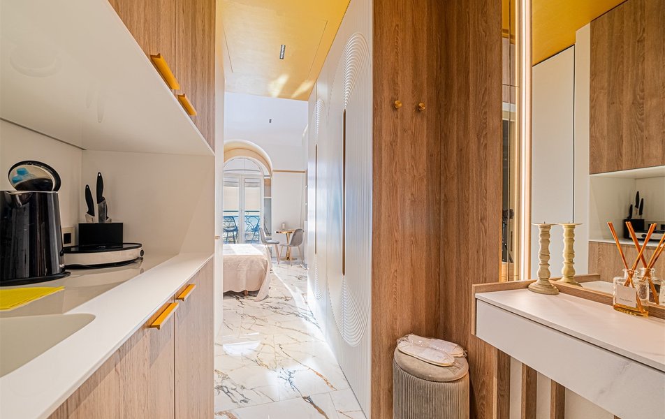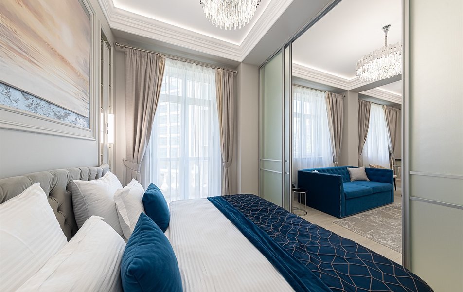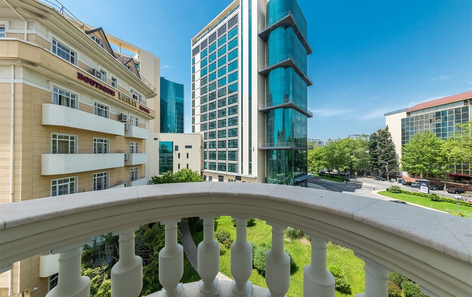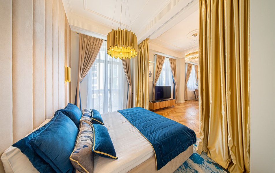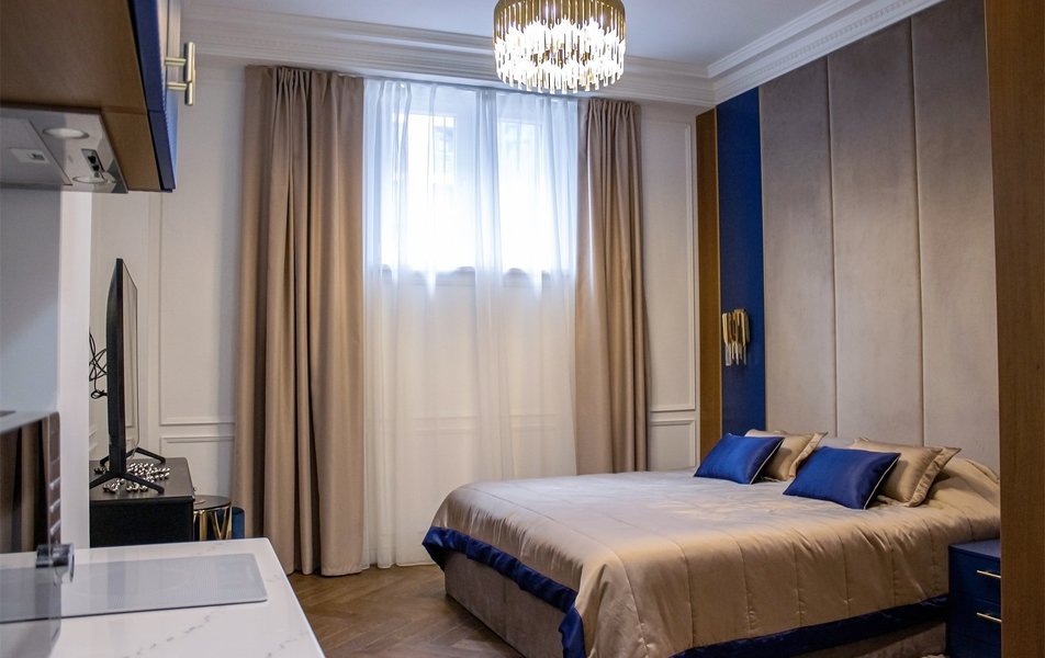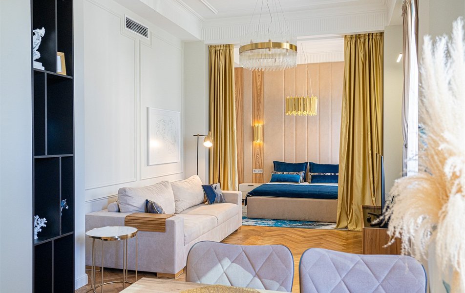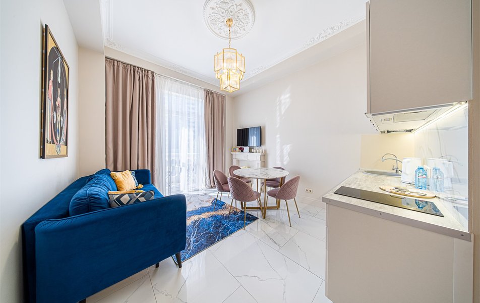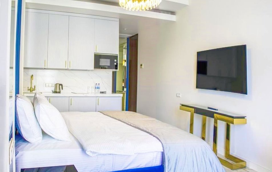 Шестиэтажный корпус отеля расположен в закрытой охраняемой зоне. Постояльцам доступны 15 просторных номеров-апартаментов площадью от 22 до 50 кв.м., выполненных в барочной и классической стилистике. В каждом номере мини-кухня с варочной панелью, система кондиционирования, необходимая бытовая техника, ванная комната с набором косметики.