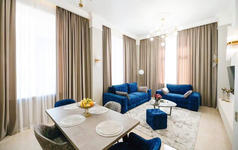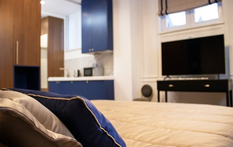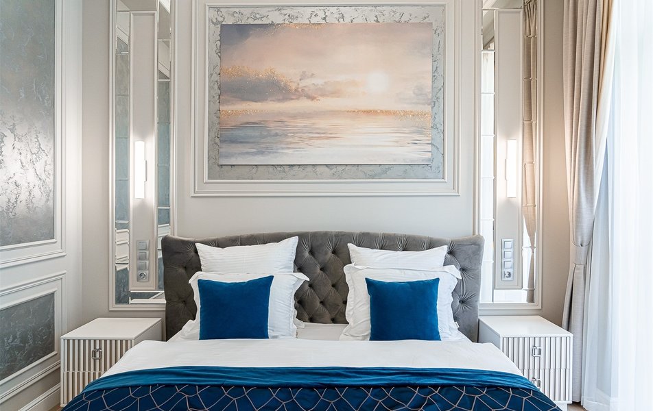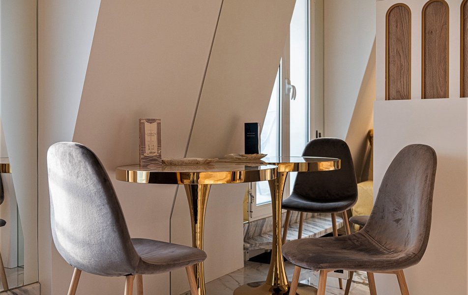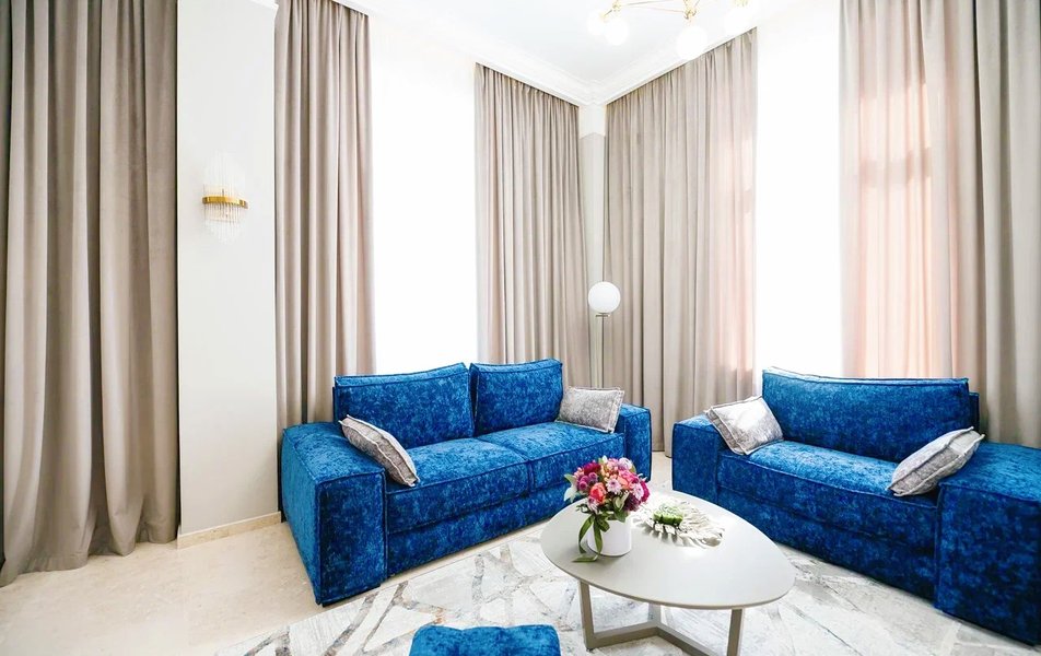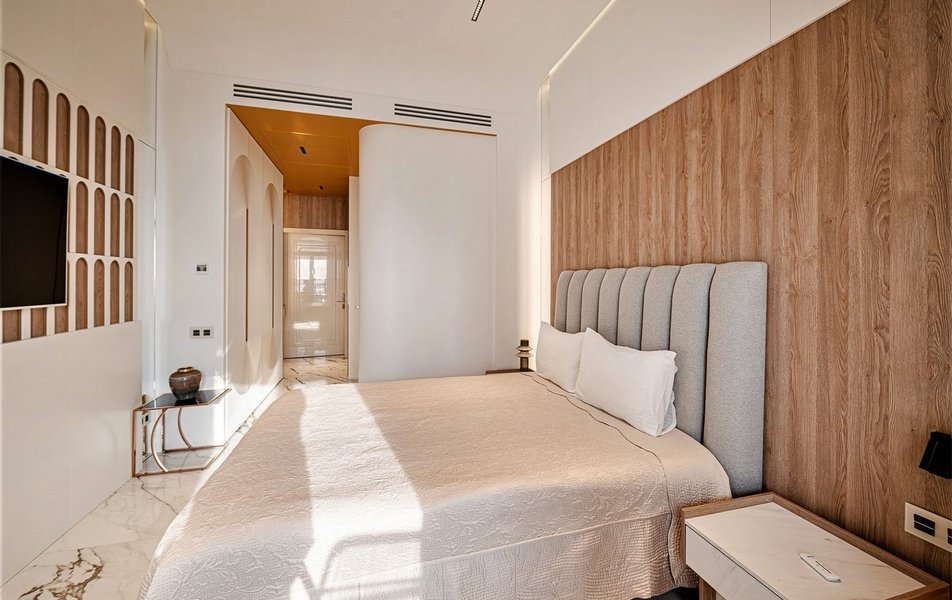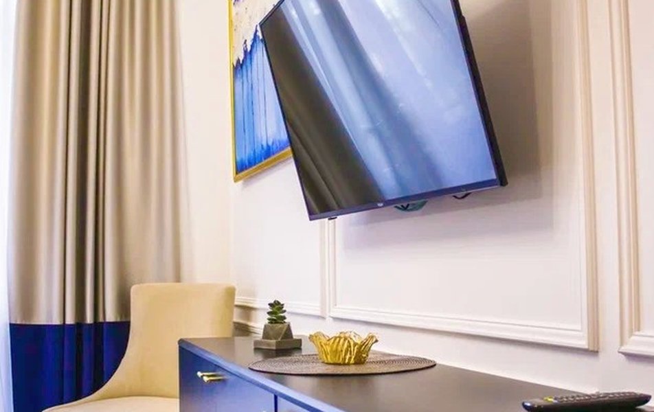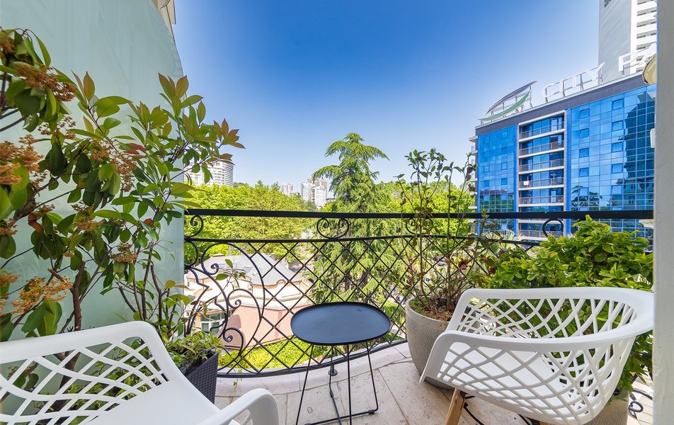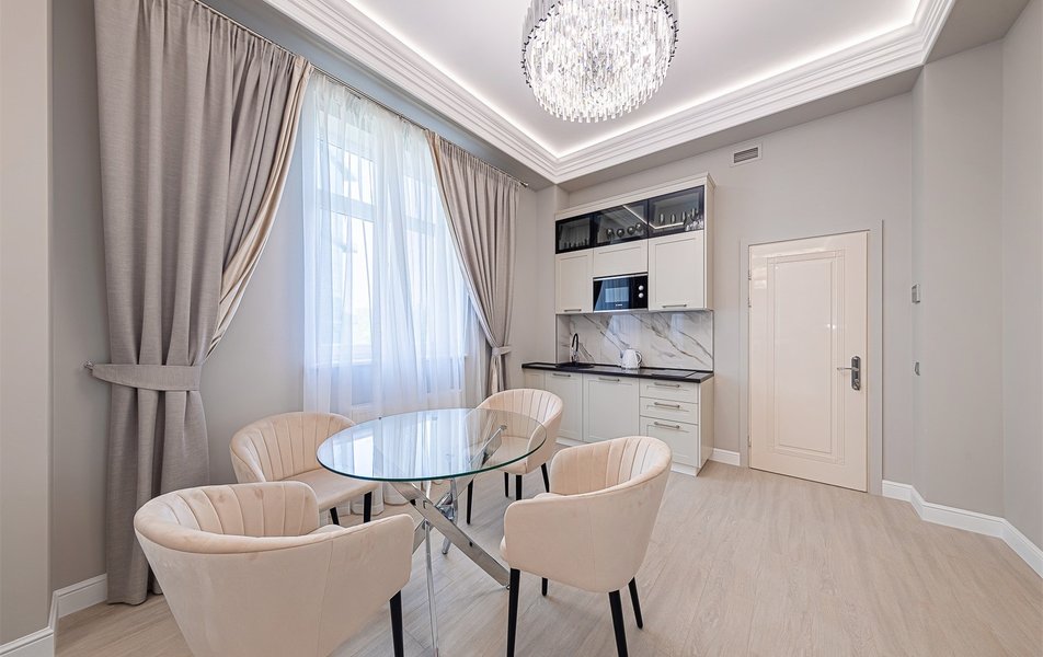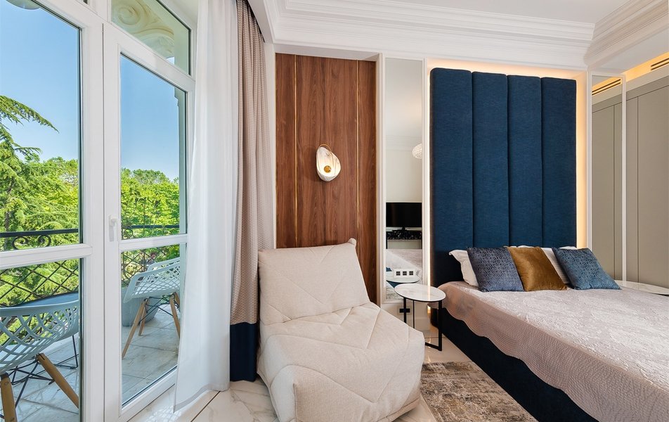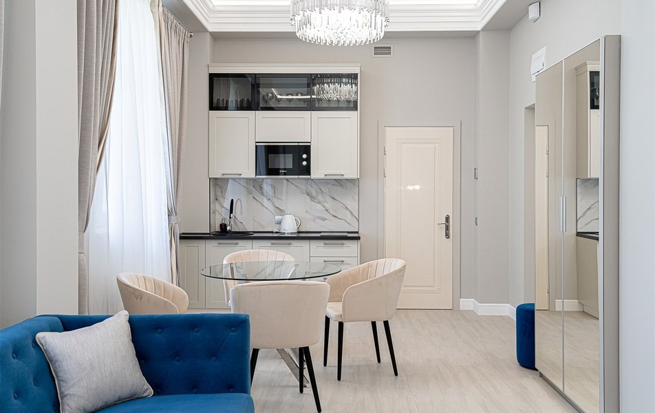 Шестиэтажный корпус отеля расположен в закрытой охраняемой зоне. Постояльцам доступны 15 просторных номеров-апартаментов площадью от 22 до 50 кв.м., выполненных в барочной и классической стилистике. В каждом номере мини-кухня с варочной панелью, система кондиционирования, необходимая бытовая техника, ванная комната с набором косметики.
