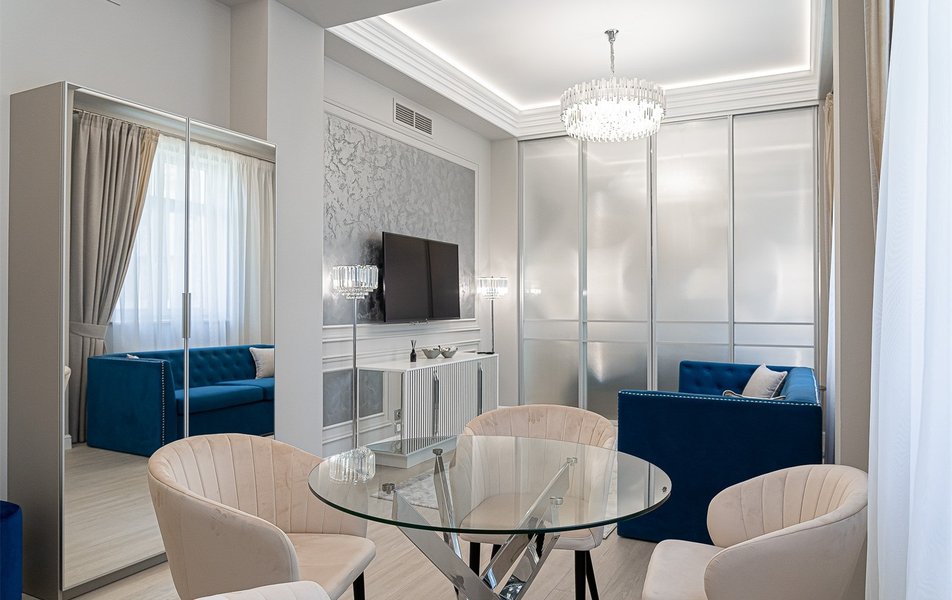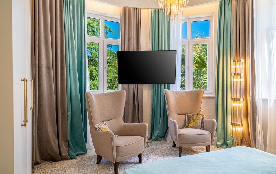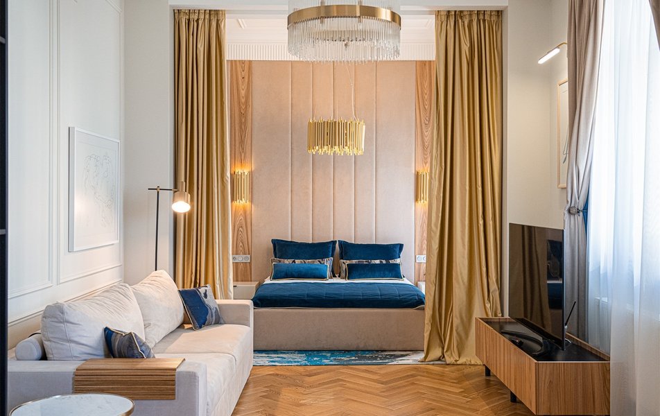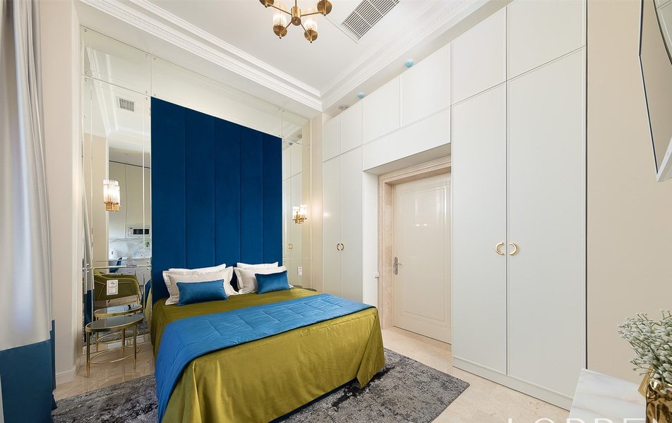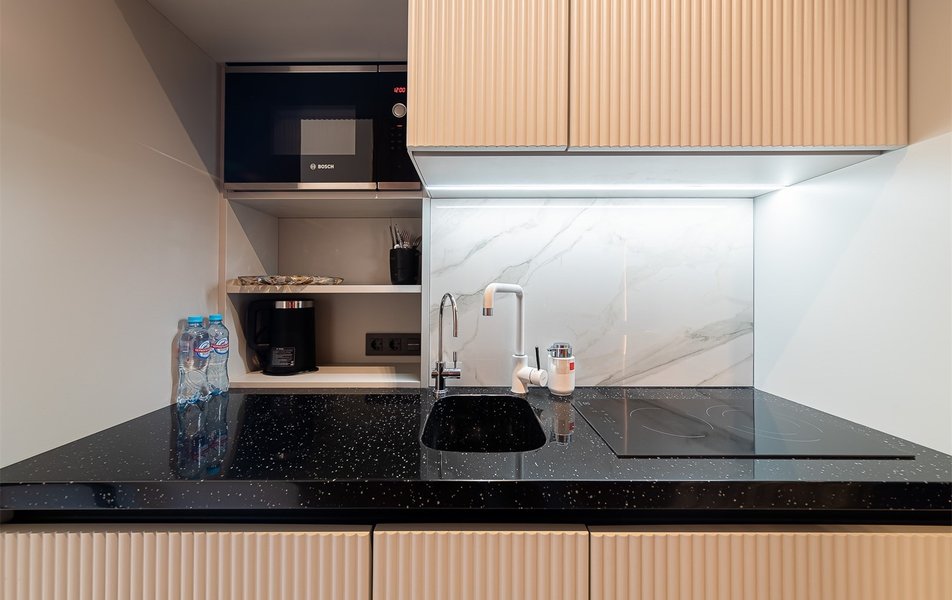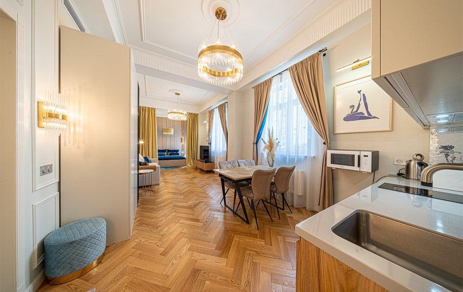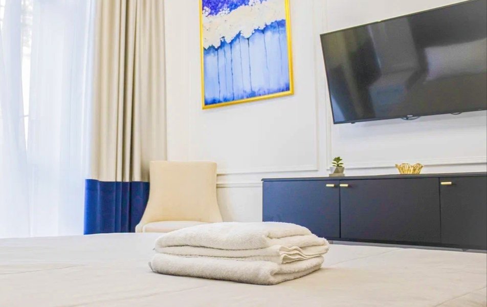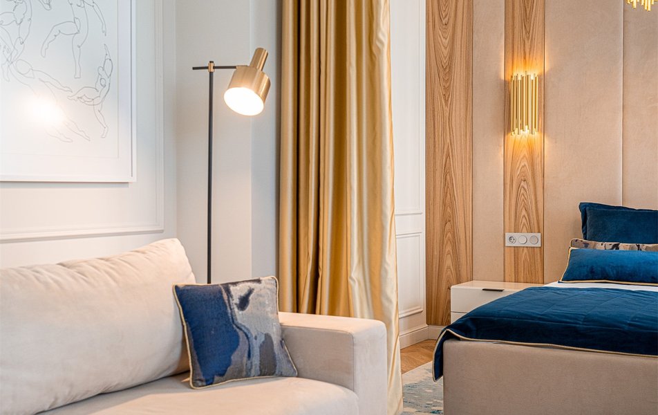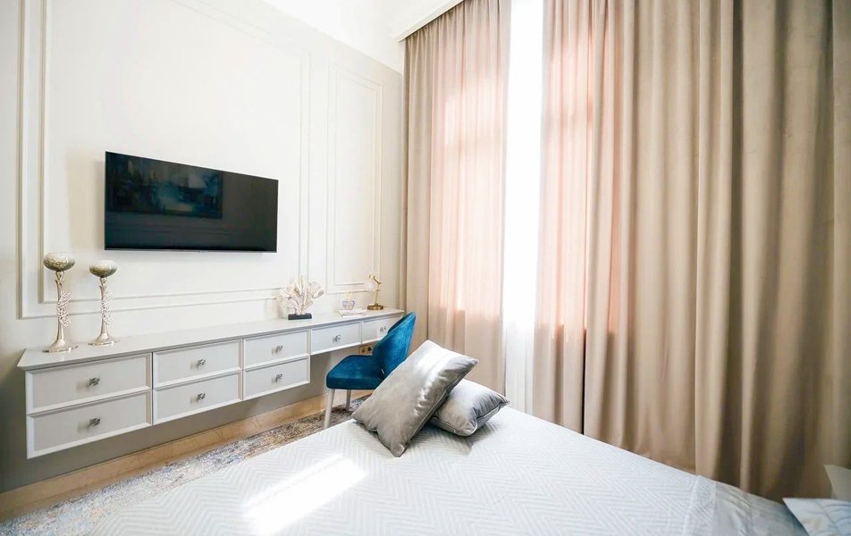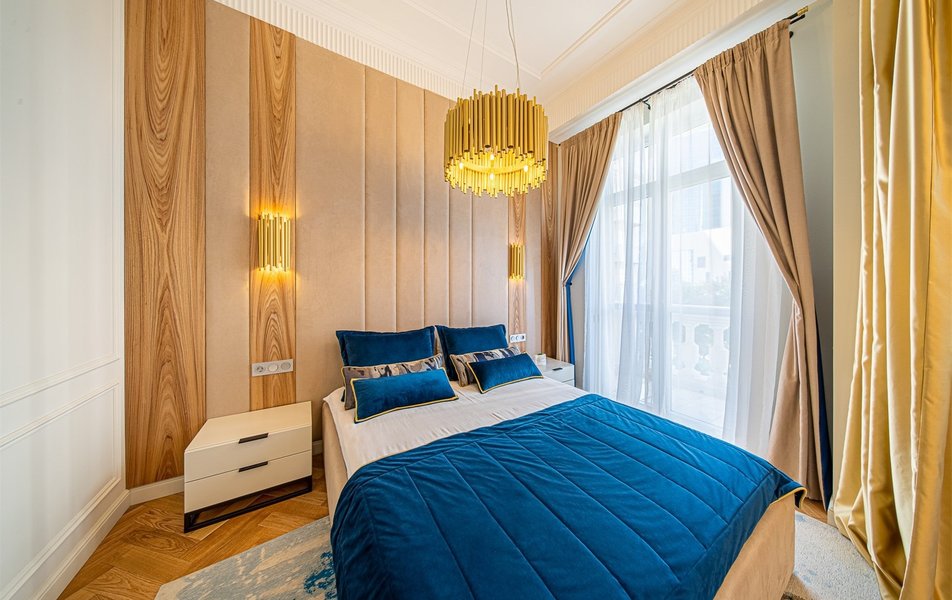 Шестиэтажный корпус отеля расположен в закрытой охраняемой зоне. Постояльцам доступны 15 просторных номеров-апартаментов площадью от 22 до 50 кв.м., выполненных в барочной и классической стилистике. В каждом номере мини-кухня с варочной панелью, система кондиционирования, необходимая бытовая техника, ванная комната с набором косметики.