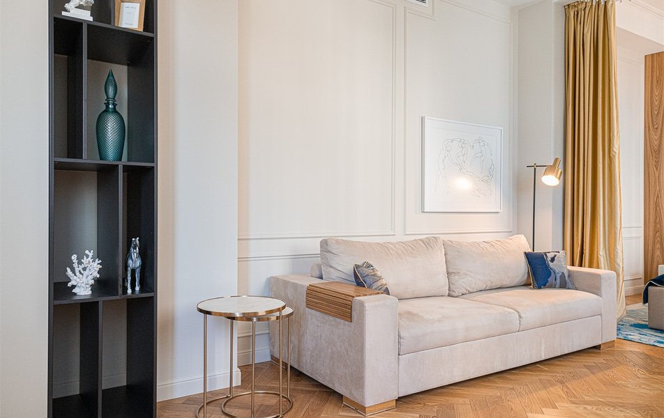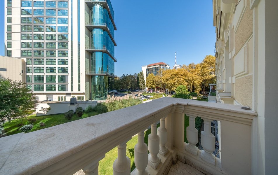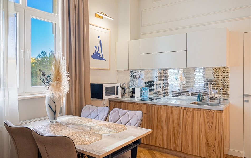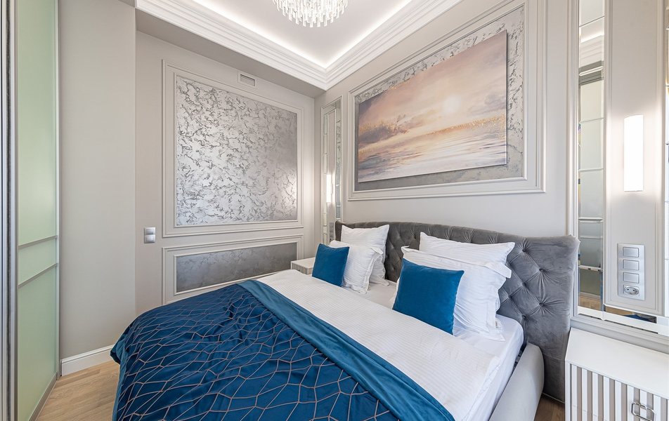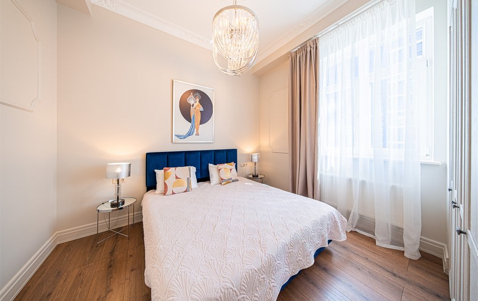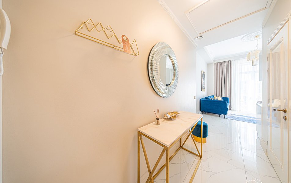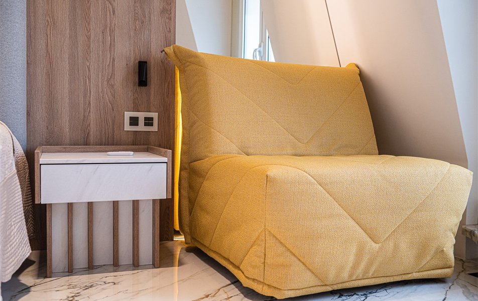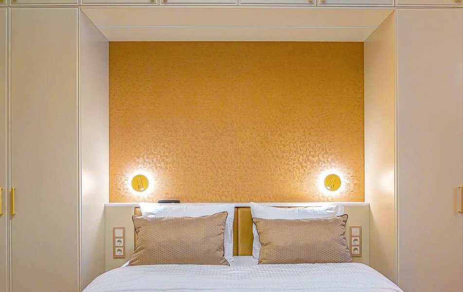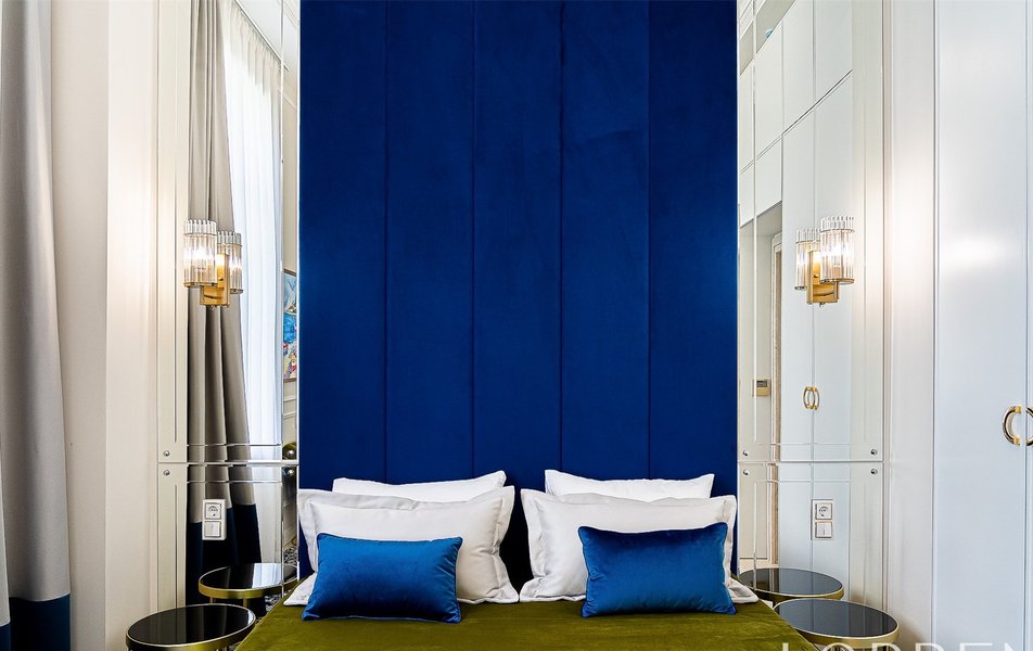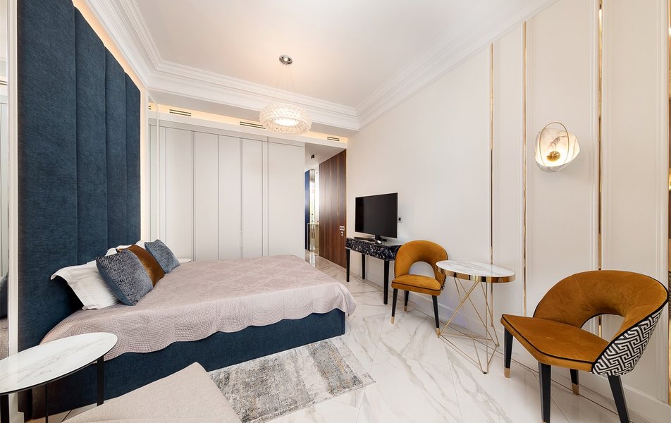 Шестиэтажный корпус отеля расположен в закрытой охраняемой зоне. Постояльцам доступны 15 просторных номеров-апартаментов площадью от 22 до 50 кв.м., выполненных в барочной и классической стилистике. В каждом номере мини-кухня с варочной панелью, система кондиционирования, необходимая бытовая техника, ванная комната с набором косметики.