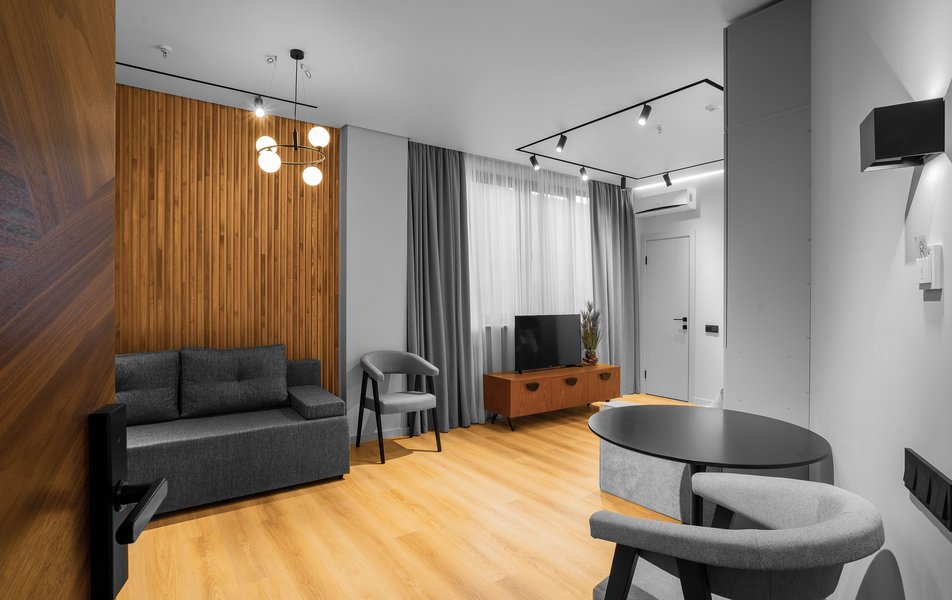 Апартаменты 2-местный 1-комнатный Комфорт Количество комнат: 1-комнатный Тип номера: Апартаменты Вид из номера: на город Кол-во номеров: 7 Кол-во основных мест: 2 Площадь (кв. м): 21 Мебель: вешалка, диван, зеркало, стол, стулья, шкаф Оборудование: кондиционер, набор посуды, телевизор ЖК, холодильник, электрочайник Санузел: с душем, туалетные принадлежности, фен Сервис: Wi-Fi бесплатно, смена полотенец, смена постельного белья, уборка номера