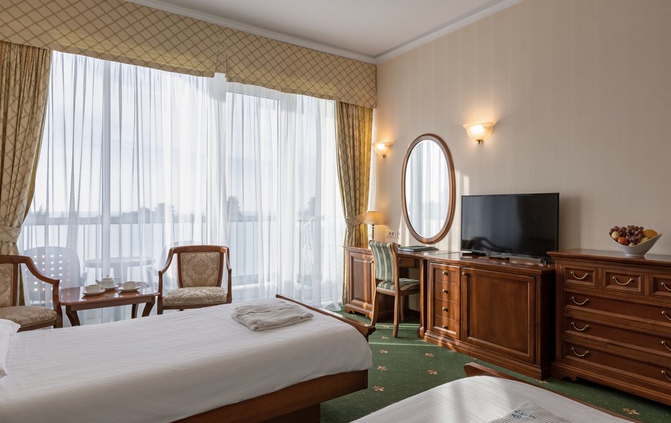 Впечатление неоднозначное. Отдыхали с 31.07 по 10.08. В жару кондиционер не справляется -система централизованная, температуру выставить самому нельзя. На улицу рядом с отелем практически не выйти - воздух из-за дороги и стройки рядом ужасен, растения на территории есть, но они ситуацию не спасают. По питанию зачетно, по лечению нормально. Еще один минус - кровать - жуткая спинка, дают на люкс по одной подушке - дико неудобно. И главная «вишенка» на торте. За день до выезда у жены на бассейне сперли AirPods - забыла их на столике, вернулась меньше чем через 15 минут - все, «ноги выросли». Естественно на ресепшен никто ничего не приносил, никто ничего не видел. Отношение на ресепшен такое, как будто это у них дело обычное. Ни извинений, все попытки помочь, свелись к вызову начальника охраны, который посмотрел как бы камеры и уехал, потом он выяснил как бы, что кроме гостьи и спасателя к столику никто не подходил, обратной связи не удостоил - выясняли сами. Полицию вызывать не стали, так как один день до выезда. Жалко «Уши» - полежали ушки на территории санатория, а вчера вечером переехали на Краснодонскую 64. Так что большой привет, видимо, тому сотруднику, который там подрабатывает. Более в этот санаторий ни ногой и никому не советую. Первый раз столкнулся с воровством в пятерке, да еще наушники-вкладыши, вещь сугубо индивидуальная. Просто дно.