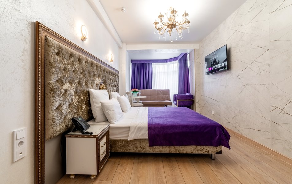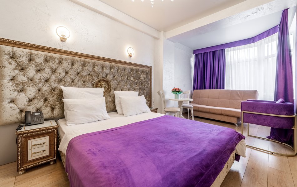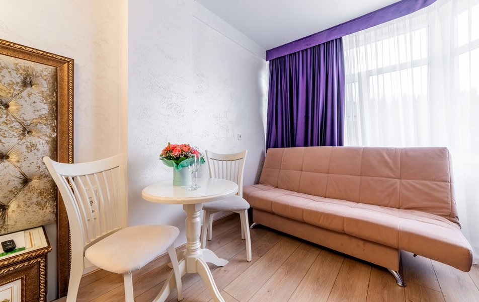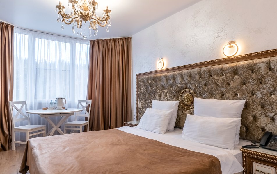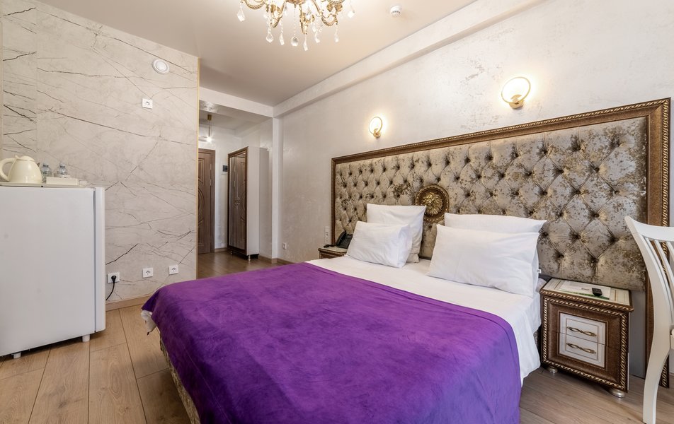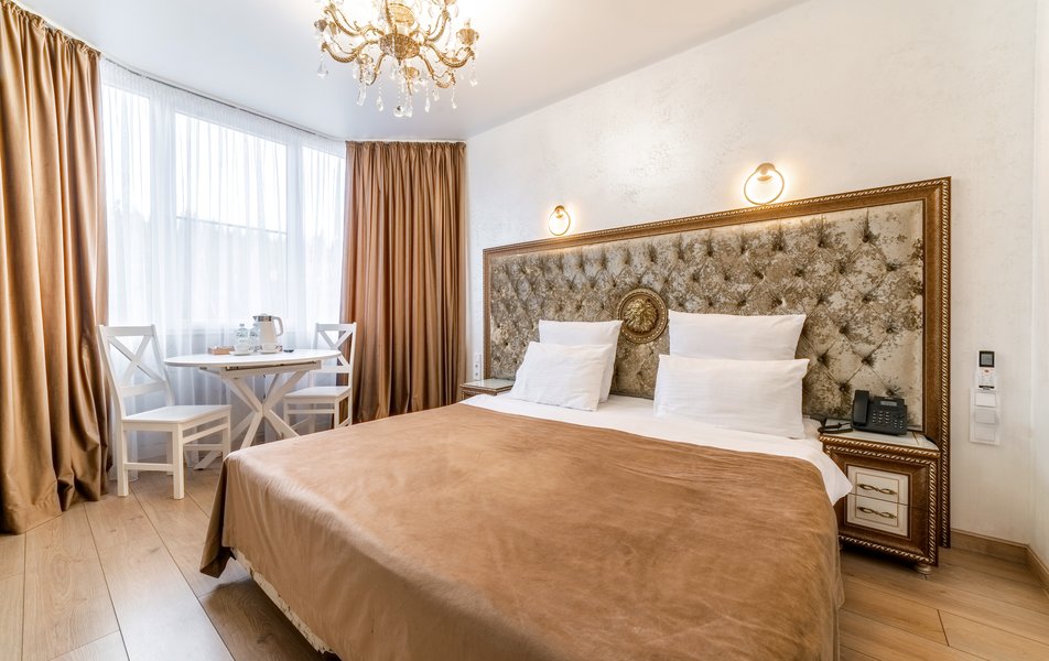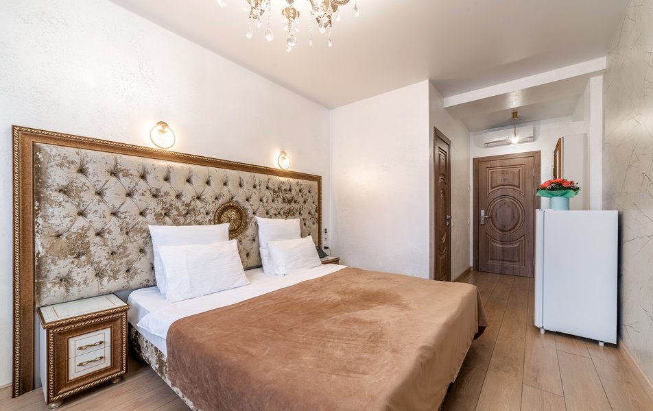 Комфорт 2-местный 1-комнатный (королевская кровать) Количество комнат: 1-комнатный Тип номера: Комфорт Вид из номера: на двор Кол-во доп. мест: 1 Кол-во основных мест: 2 Площадь (кв. м): 20 Мебель: зеркало, кровать двуспальная: King size, прикроватные тумбочки, стол, шкаф Оборудование: мини-холодильник, сейф, сплит-система, сушилка для белья, телевизор ЖК, чайник, чайный набор посуды Санузел: с душевой кабиной, тапочки, туалетные принадлежности, фен, халат Сервис: Wi-Fi бесплатно, room-сервис, карточная система замков, смена полотенец, смена постельного белья, уборка номера, услуги внутренней телефонной связи