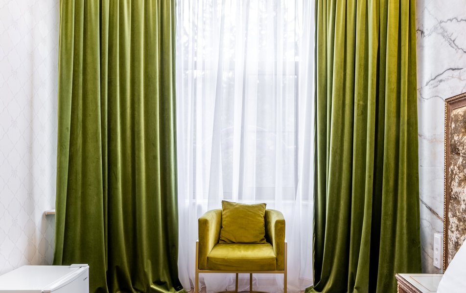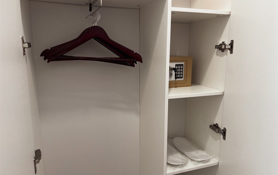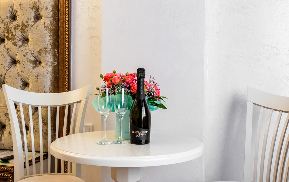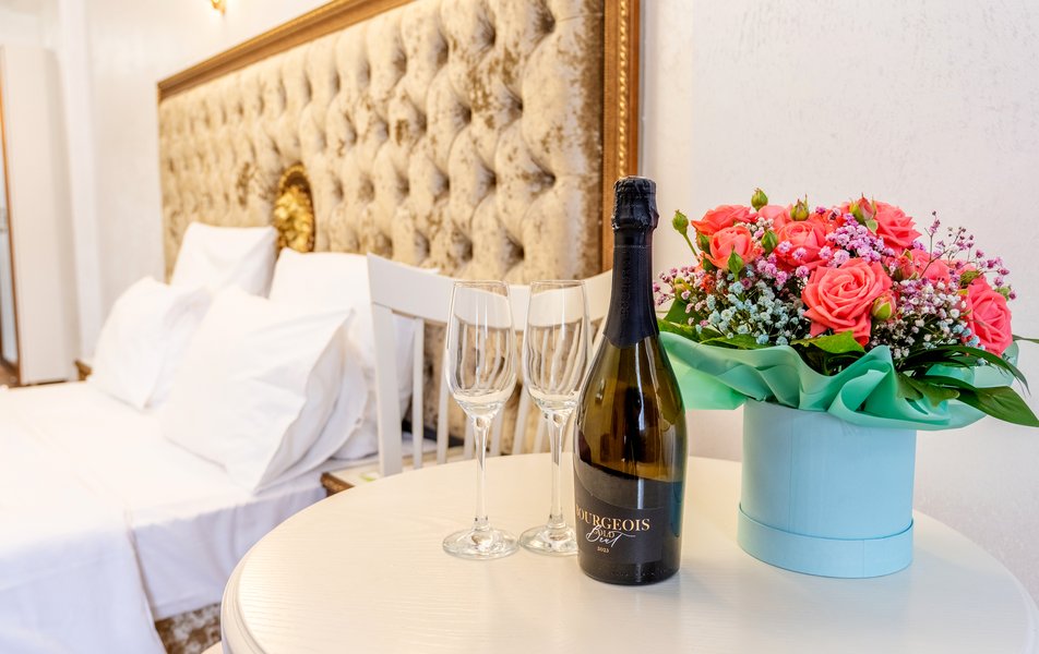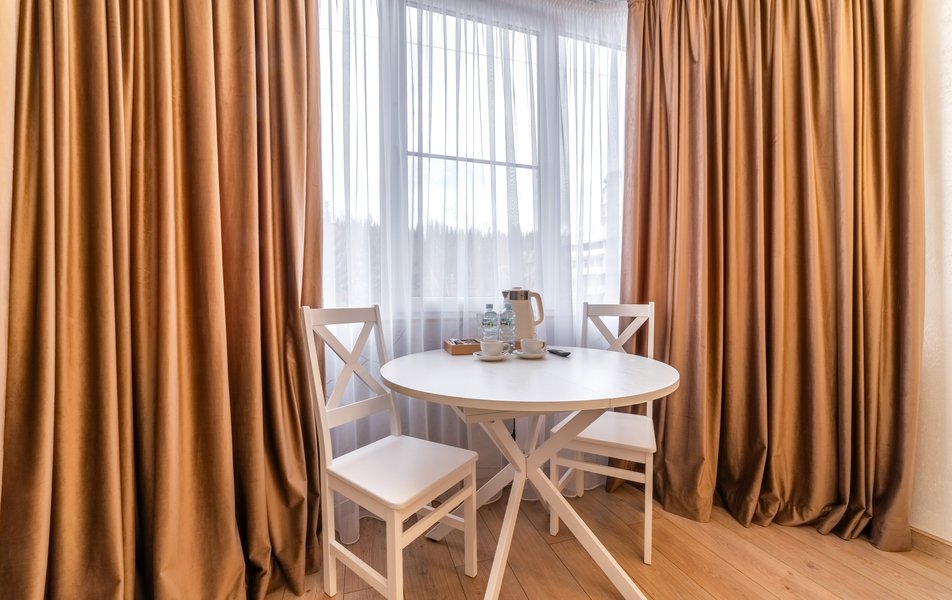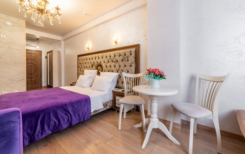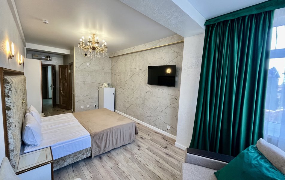 Комфорт 2-местный 1-комнатный (королевская кровать) Количество комнат: 1-комнатный Тип номера: Комфорт Вид из номера: на двор Кол-во доп. мест: 1 Кол-во основных мест: 2 Площадь (кв. м): 20 Мебель: зеркало, кровать двуспальная: King size, прикроватные тумбочки, стол, шкаф Оборудование: мини-холодильник, сейф, сплит-система, сушилка для белья, телевизор ЖК, чайник, чайный набор посуды Санузел: с душевой кабиной, тапочки, туалетные принадлежности, фен, халат Сервис: Wi-Fi бесплатно, room-сервис, карточная система замков, смена полотенец, смена постельного белья, уборка номера, услуги внутренней телефонной связи