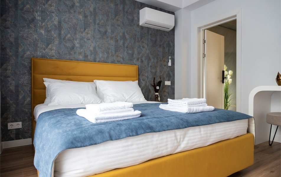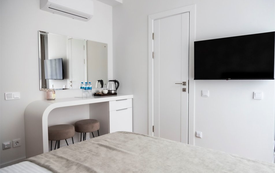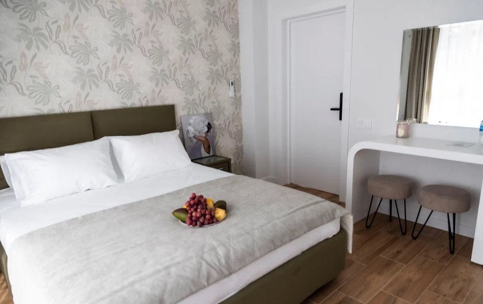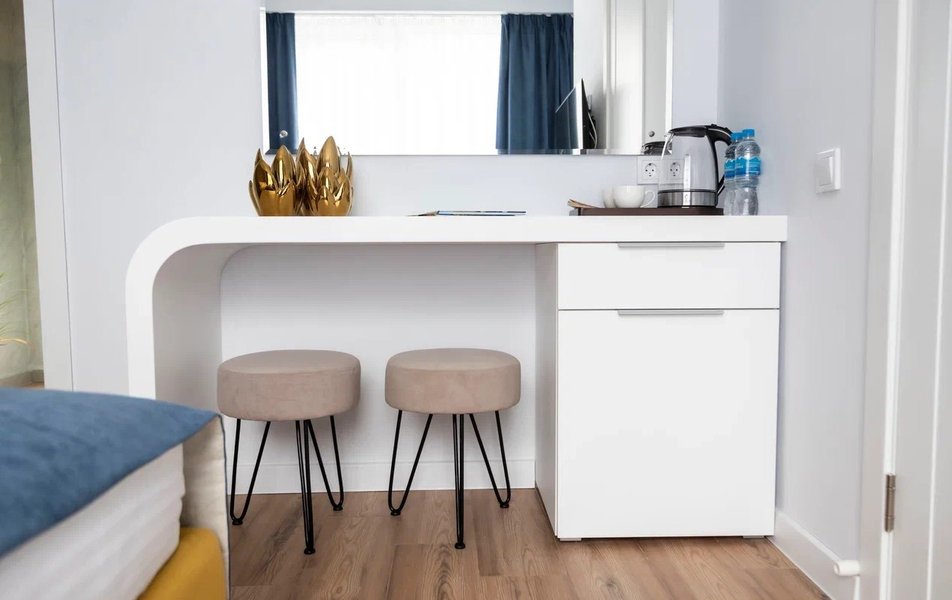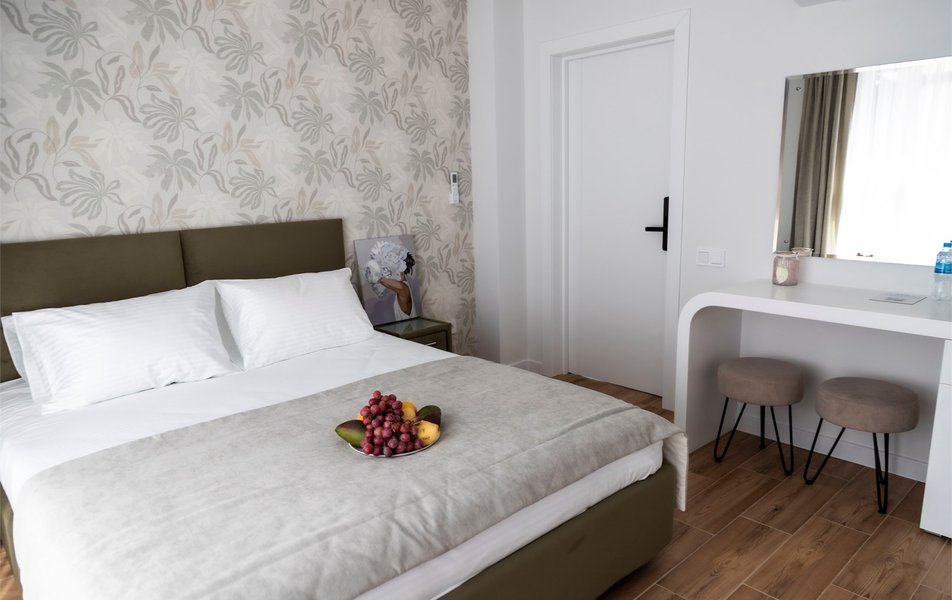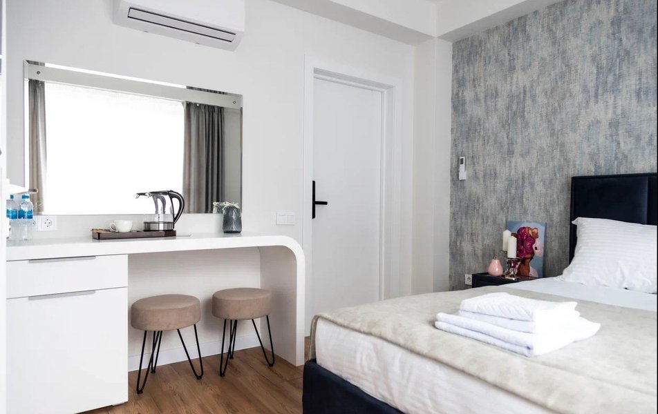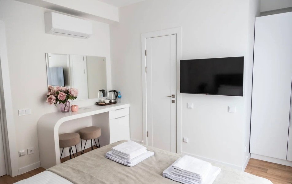 Стандартный Комфорт 2-местный 3 Количество комнат: 1-комнатный Тип номера: Стандартный Кол-во основных мест: 2 Мебель: вешалка, зеркало, кровать двуспальная, прикроватные тумбочки, пуфик: 2, столик туалетный, шкаф Оборудование: кондиционер, телевизор ЖК, чайная станция, чайный набор посуды Санузел: с душем, тапочки, туалетные принадлежности, фен, халат Сервис: Wi-Fi бесплатно, смена полотенец, смена постельного белья, уборка номера