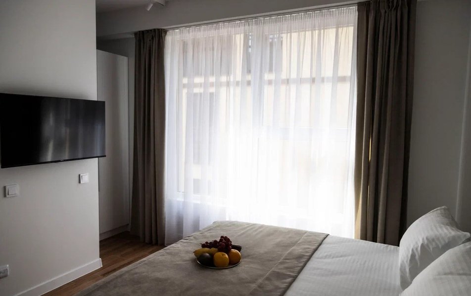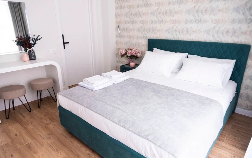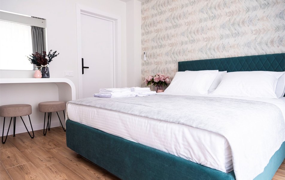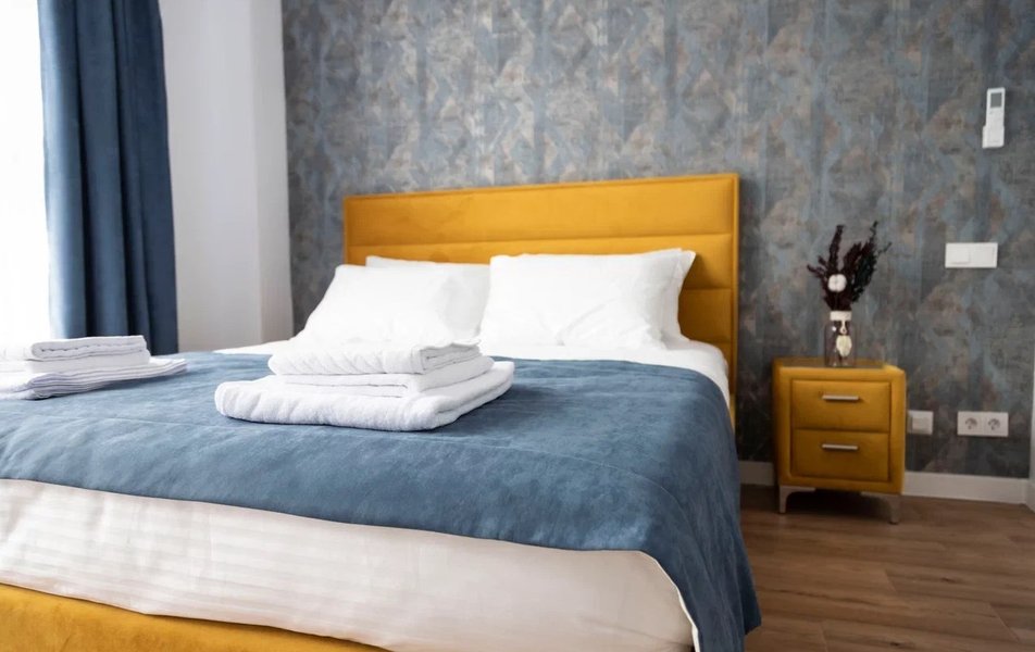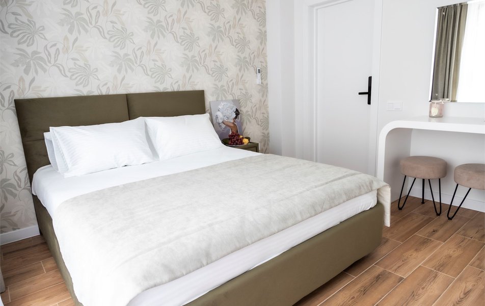 Стандартный Комфорт 2-местный 2 Количество комнат: 1-комнатный Тип номера: Стандартный Кол-во основных мест: 2 Мебель: вешалка, зеркало, кровать двуспальная, прикроватные тумбочки, пуфик: 2, столик туалетный, шкаф Оборудование: кондиционер, телевизор ЖК, чайная станция, чайный набор посуды Санузел: с душем, тапочки, туалетные принадлежности, фен, халат Сервис: Wi-Fi бесплатно, смена полотенец, смена постельного белья, уборка номера