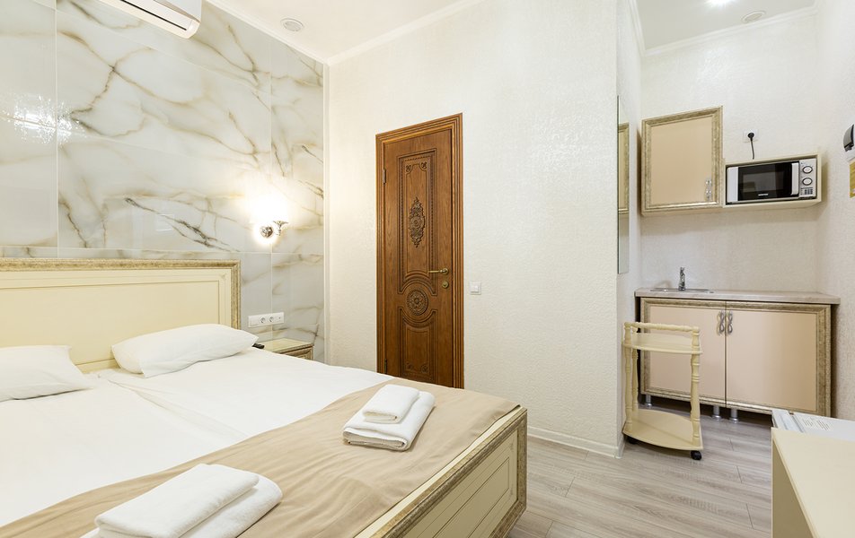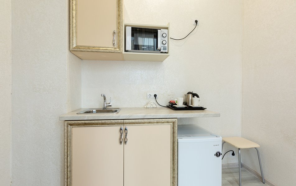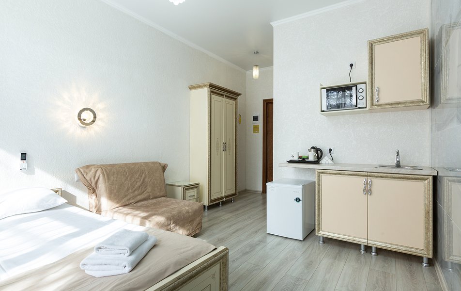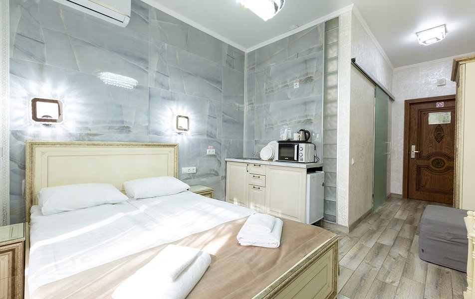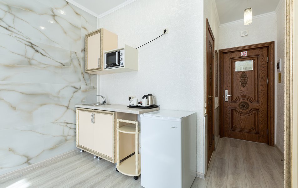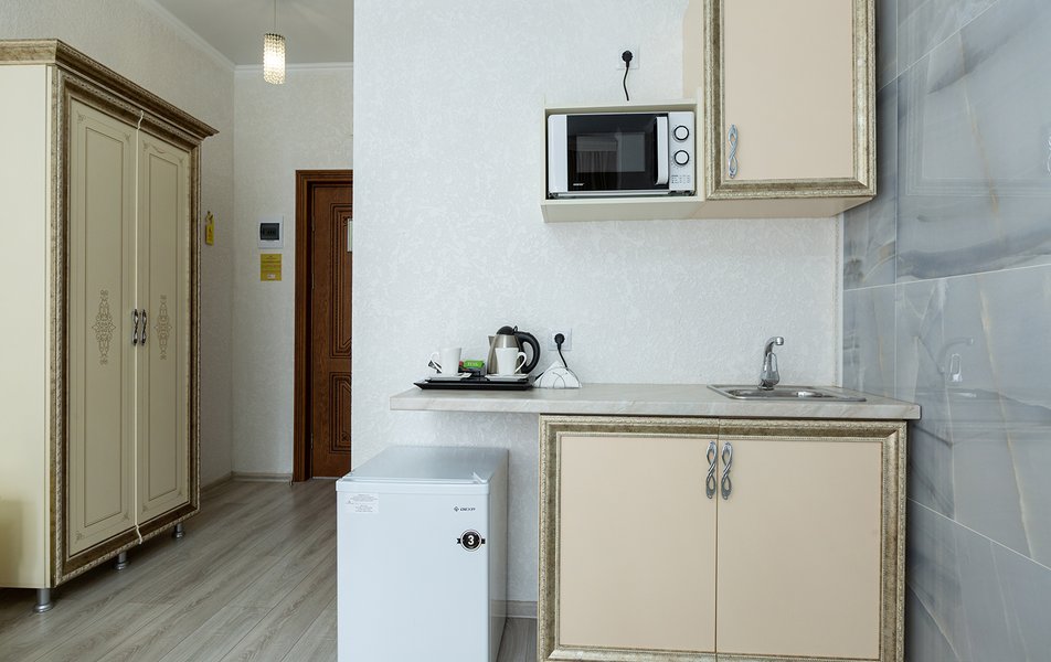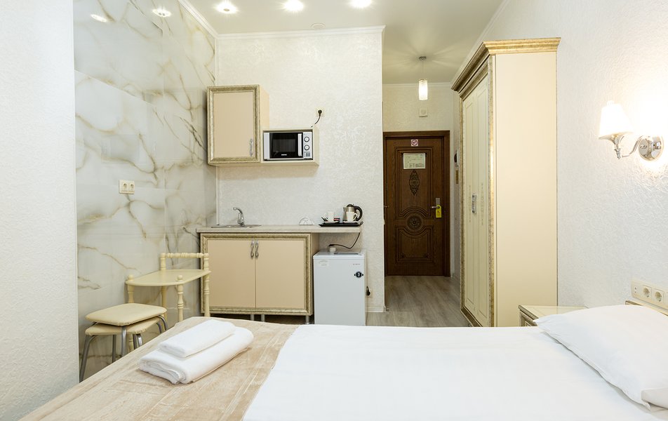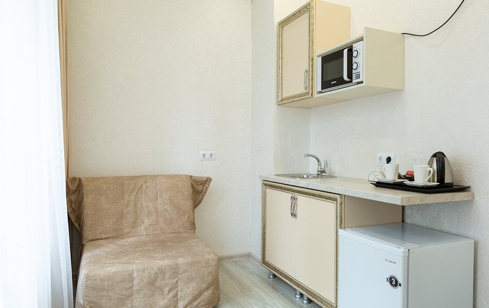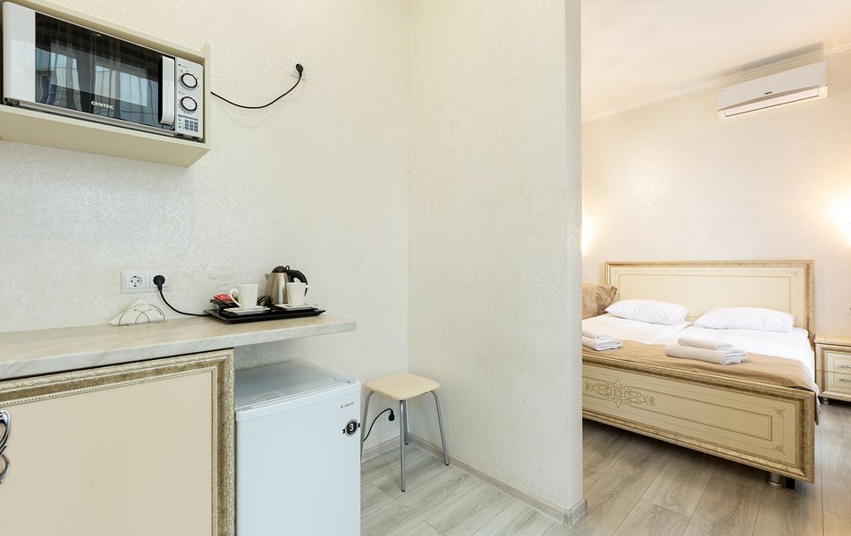 Комфорт 2-местный (с кухонным уголком) Количество комнат: 1-комнатный Тип номера: Комфорт Кол-во номеров: 3 Кол-во основных мест: 2 Площадь (кв. м): 19 Мебель: зеркало, кровать двуспальная, прикроватные тумбочки, шкаф Оборудование: кондиционер, микроволновая печь, мини-холодильник, сейф, стиральная машина, телевизор ЖК, чайный набор посуды, электрочайник Санузел: с душевой кабиной, туалетные принадлежности, фен Сервис: Wi-Fi бесплатно, room-сервис, смена полотенец, смена постельного белья, уборка номера