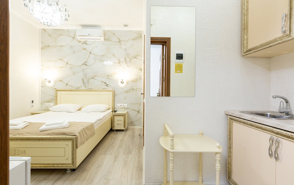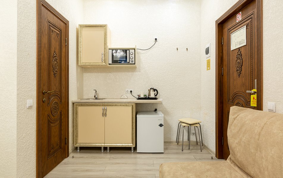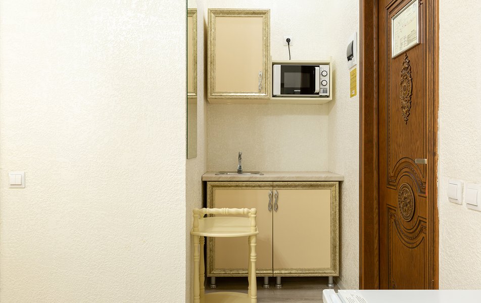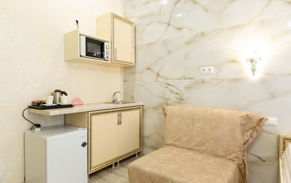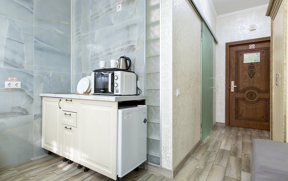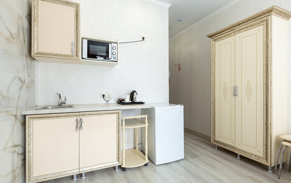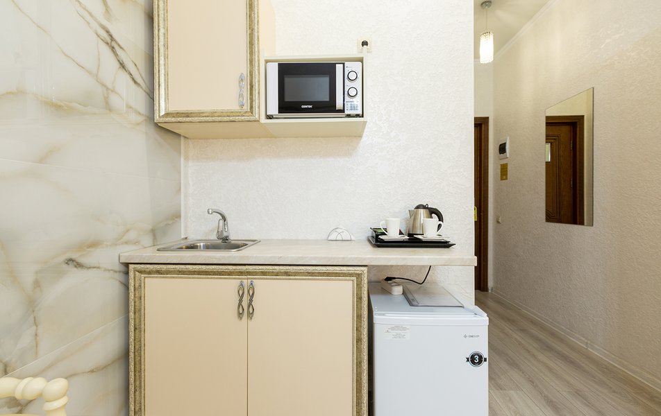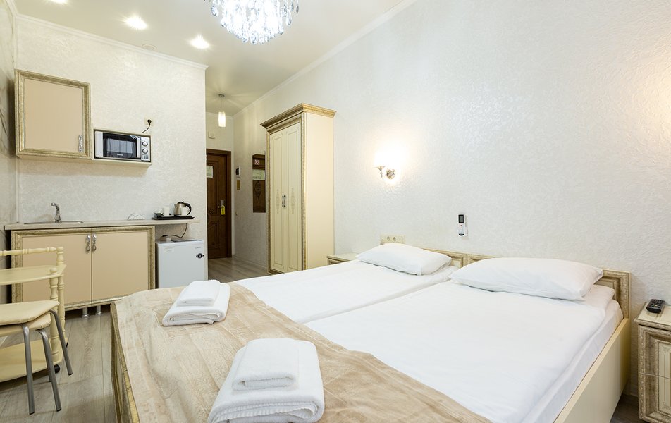 Комфорт 2-местный (с кухонным уголком) Количество комнат: 1-комнатный Тип номера: Комфорт Кол-во номеров: 3 Кол-во основных мест: 2 Площадь (кв. м): 19 Мебель: зеркало, кровать двуспальная, прикроватные тумбочки, шкаф Оборудование: кондиционер, микроволновая печь, мини-холодильник, сейф, стиральная машина, телевизор ЖК, чайный набор посуды, электрочайник Санузел: с душевой кабиной, туалетные принадлежности, фен Сервис: Wi-Fi бесплатно, room-сервис, смена полотенец, смена постельного белья, уборка номера