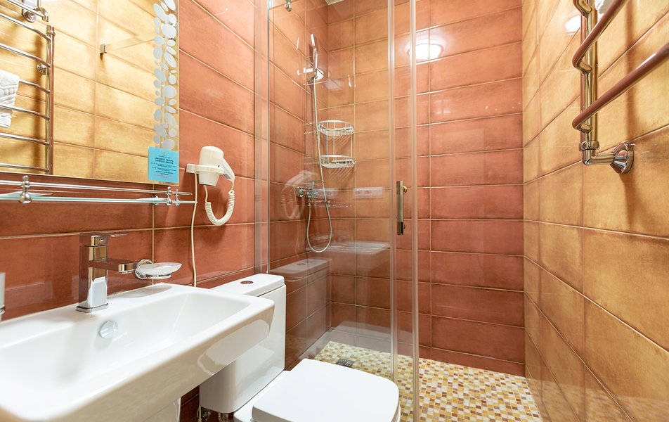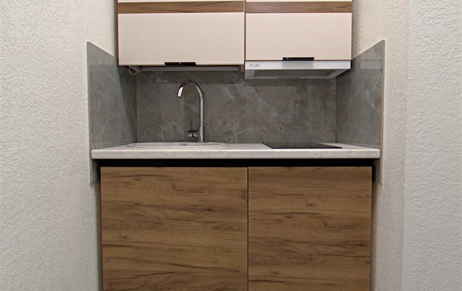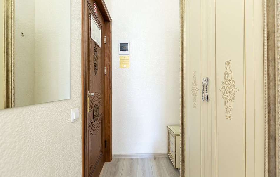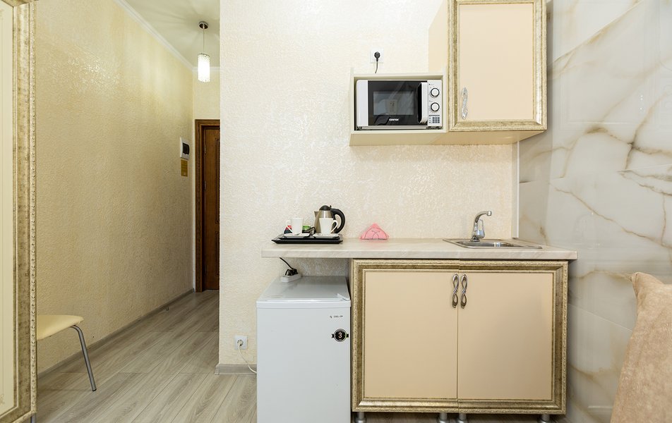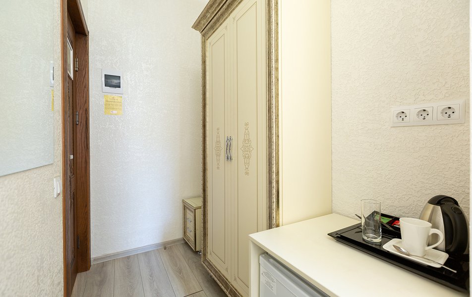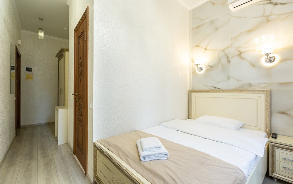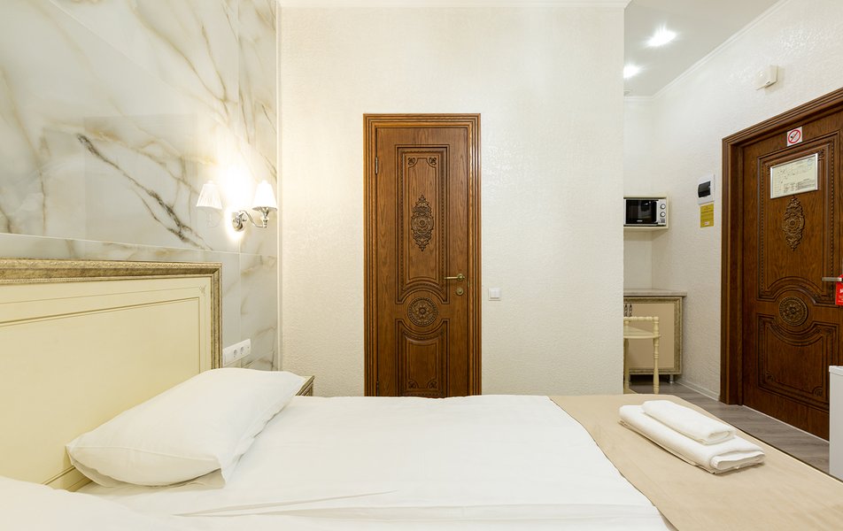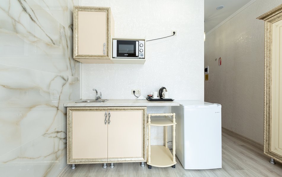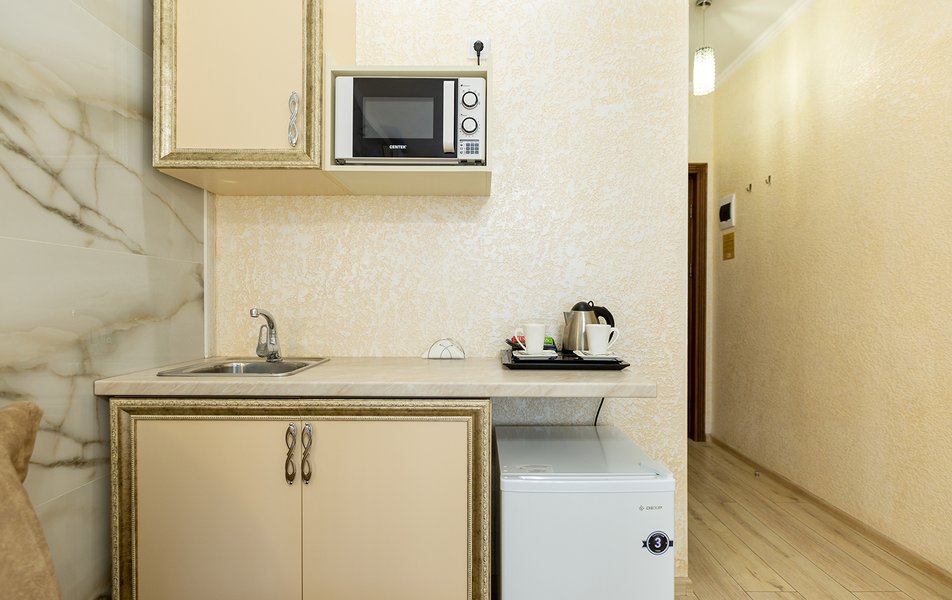 Комфорт 2-местный (с кухонным уголком) Количество комнат: 1-комнатный Тип номера: Комфорт Кол-во номеров: 3 Кол-во основных мест: 2 Площадь (кв. м): 19 Мебель: зеркало, кровать двуспальная, прикроватные тумбочки, шкаф Оборудование: кондиционер, микроволновая печь, мини-холодильник, сейф, стиральная машина, телевизор ЖК, чайный набор посуды, электрочайник Санузел: с душевой кабиной, туалетные принадлежности, фен Сервис: Wi-Fi бесплатно, room-сервис, смена полотенец, смена постельного белья, уборка номера