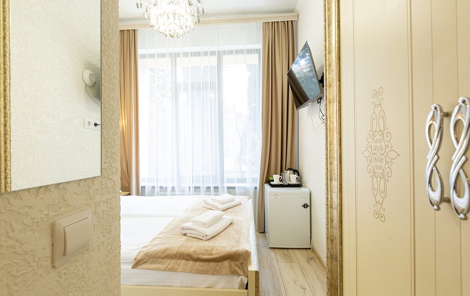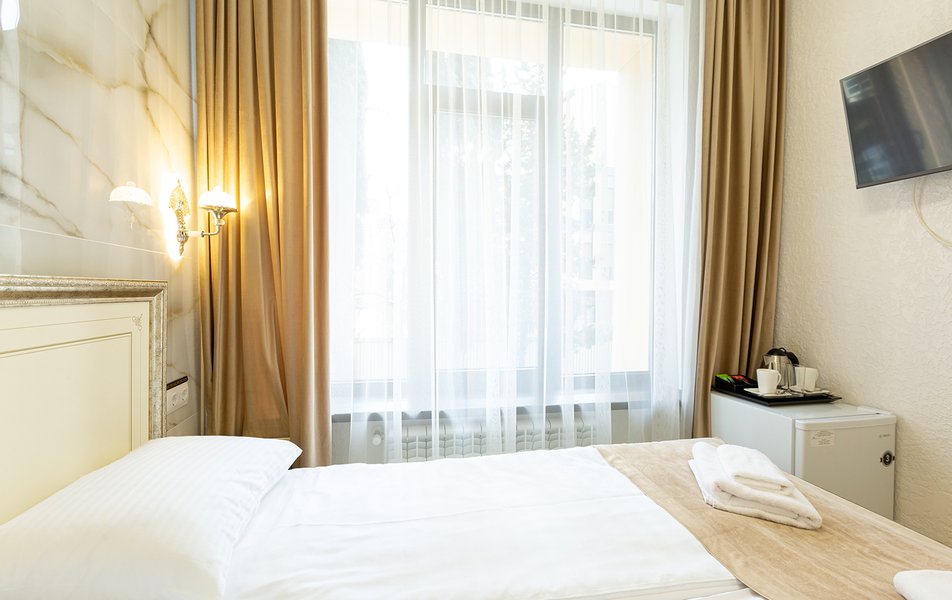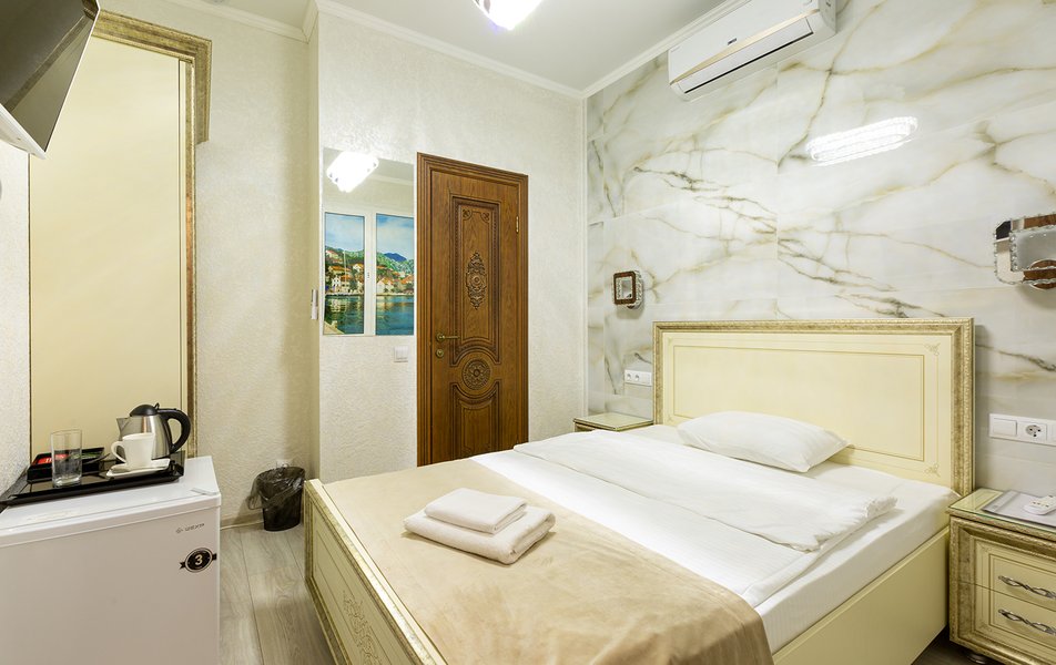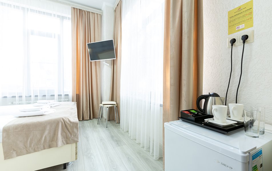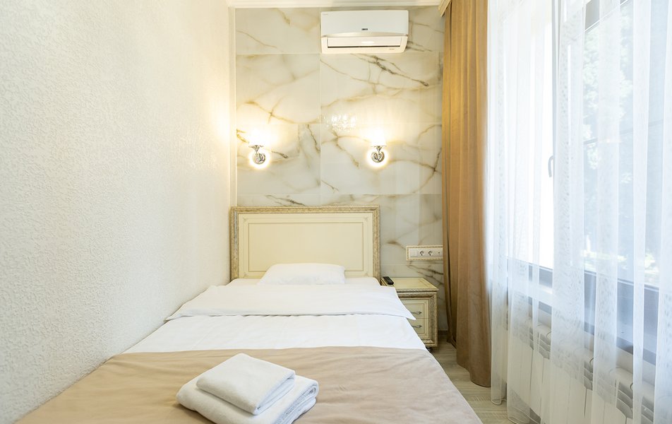Бюджетный 1-местный (без окна) Количество комнат: 1-комнатный Тип номера: Стандартный Вид из номера: без окна Кол-во номеров: 3 Кол-во основных мест: 1 Площадь (кв. м): 10 Мебель: зеркало, кровать односпальная, прикроватная тумбочка, шкаф Оборудование: кондиционер, мини-холодильник, набор посуды, сейф, телевизор ЖК, электрочайник Санузел: с душевой кабиной, туалетные принадлежности, фен Сервис: Wi-Fi бесплатно, room-сервис, смена полотенец, смена постельного белья, уборка номера