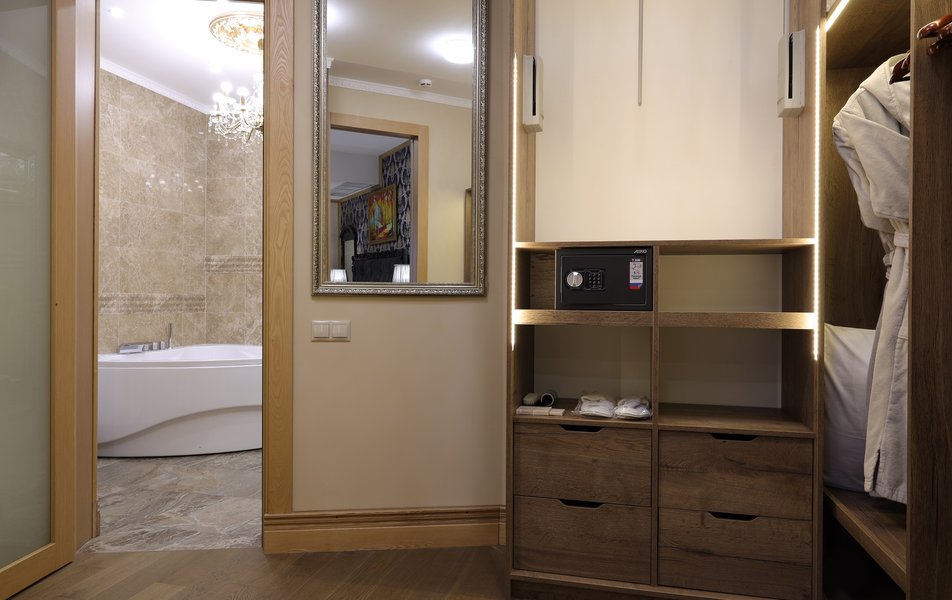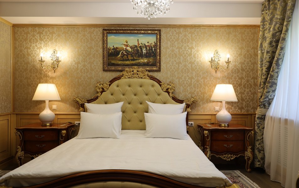 Люкс 2-местный Deluxe Количество комнат: 1-комнатный Тип номера: Люкс Кол-во номеров: 1 Кол-во основных мест: 2 Площадь (кв. м): 35 Мебель: вешалка, гардеробная, зеркало, кресло, кровать двуспальная, прикроватные тумбочки Оборудование: кондиционер, сейф, телевизор ЖК Санузел: с душем, тапочки, туалетные принадлежности, фен, халат Сервис: Wi-Fi бесплатно, room-сервис, смена полотенец, смена постельного белья, уборка номера