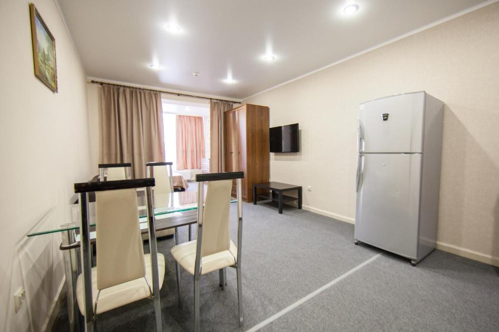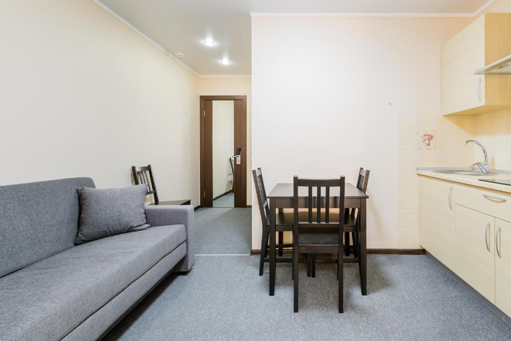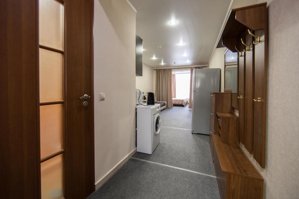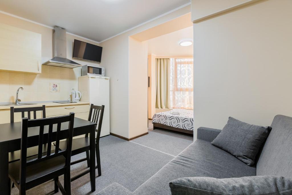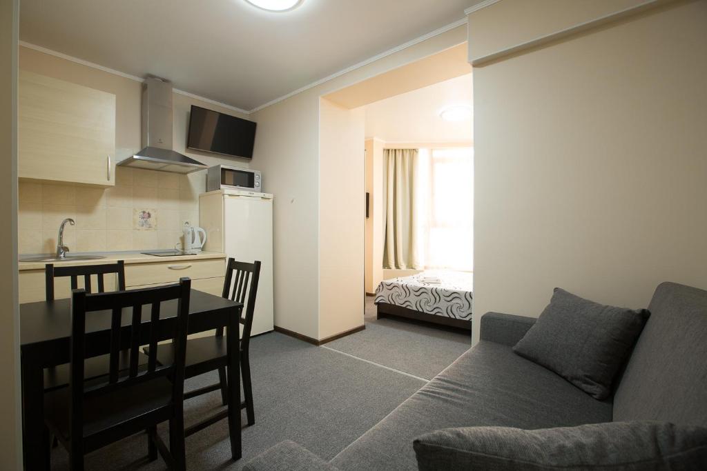 Выбрали эти апартаменты, в связи с удобством расположения (Центр, 2 игровые площадки, сосновый парк), отзывы в основном хорошие, не обратили внимание на отзыв , где отмечалось, что посуда и стиральная машина грязные. Нам повезло, стиральная машина оказалась новой, но вот посуда, неприятно было даже открывать ящики , где она лежит, запах старой засаленной кухни... чашки с коричневыми ободками, разделочная доска убитая настолько, что не описать, губка для посуды, которая предположительно должна быть новой , была в шерсти животных, видимо предыдущие жильцы отдыхали со своим питомцем. В итоге отмыла минимум необходимой посуды и только ей пользовалась( соду по моей просьбе предоставили ) Ещё смутил ковролин, в коридорах о нем заботились, в дождь застилали, чтобы не пачкался, а вот в номерах он тоже не первой свежести, что подтверждает запах сразу при входе в номер. Диван в 1 номере был кожаный, по нашей просьбе его быстро почистили, а вот во 2 тканевой, грязный , не знаю чистили ли его вообще когда-то. Стены тоже все в грязных следах. При этом зоны общего пользования очень чистые, и комната со стиральными машинами и гладильной доской, и Кухня. Непонятно, почему нельзя также чисто отмывать апартаменты. Отдельно хочется отметить работу персонала, чувствуешь себя , как на даче у родственников, все готовы помочь, очень радушные и доброжелательные. Думаю, если будет чистота, это будет просто супер апарт - отель.